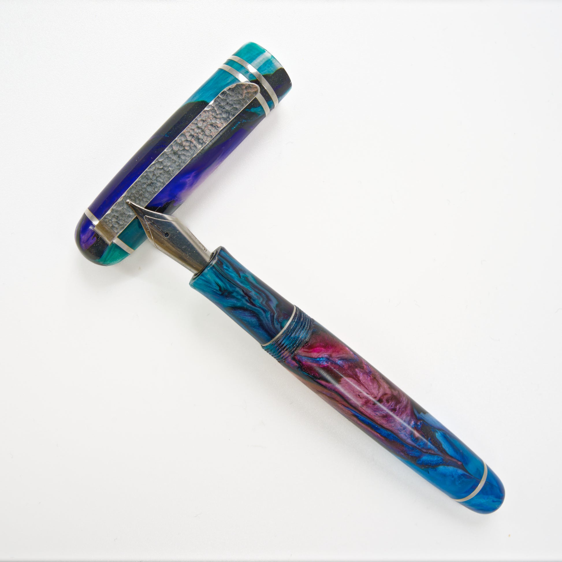 Experience the exquisite beauty of this hand crafted Fountain Pen by Silverburl pens. Our commitment to quality and durability is reflected in every aspect of this pen, from the elegant polished steel Jowo nib size 6 to the option to choose from various nib tip sizes. At 145m/m long including the cap and 135m/m from nib to body end, with a body diameter of 15m/m and a 14m/m thread, and a cap diameter of 16m/m, this pen is perfectly sized for comfortable writing. However, what truly makes this pen stand out is the use of Argentium .940 silver, known for its superior brightness and durability compared to traditional .925 sterling silver. Not only is it highly tarnish resistant, but it also has antibacterial properties and is free from nickel, making it an ideal choice for those with allergies or sensitive skin. Elevate your writing experience with this Crushed Lab Grown Opal.