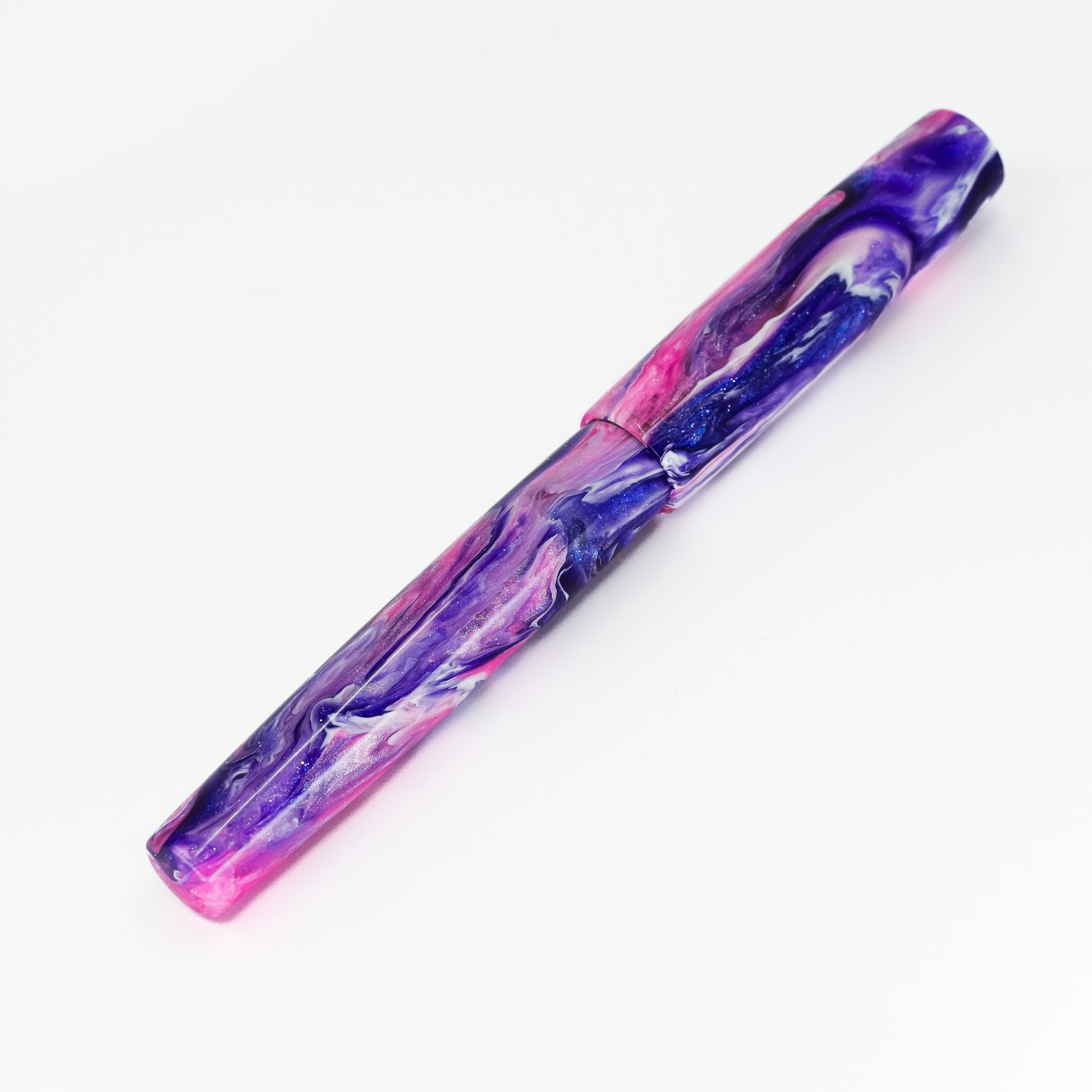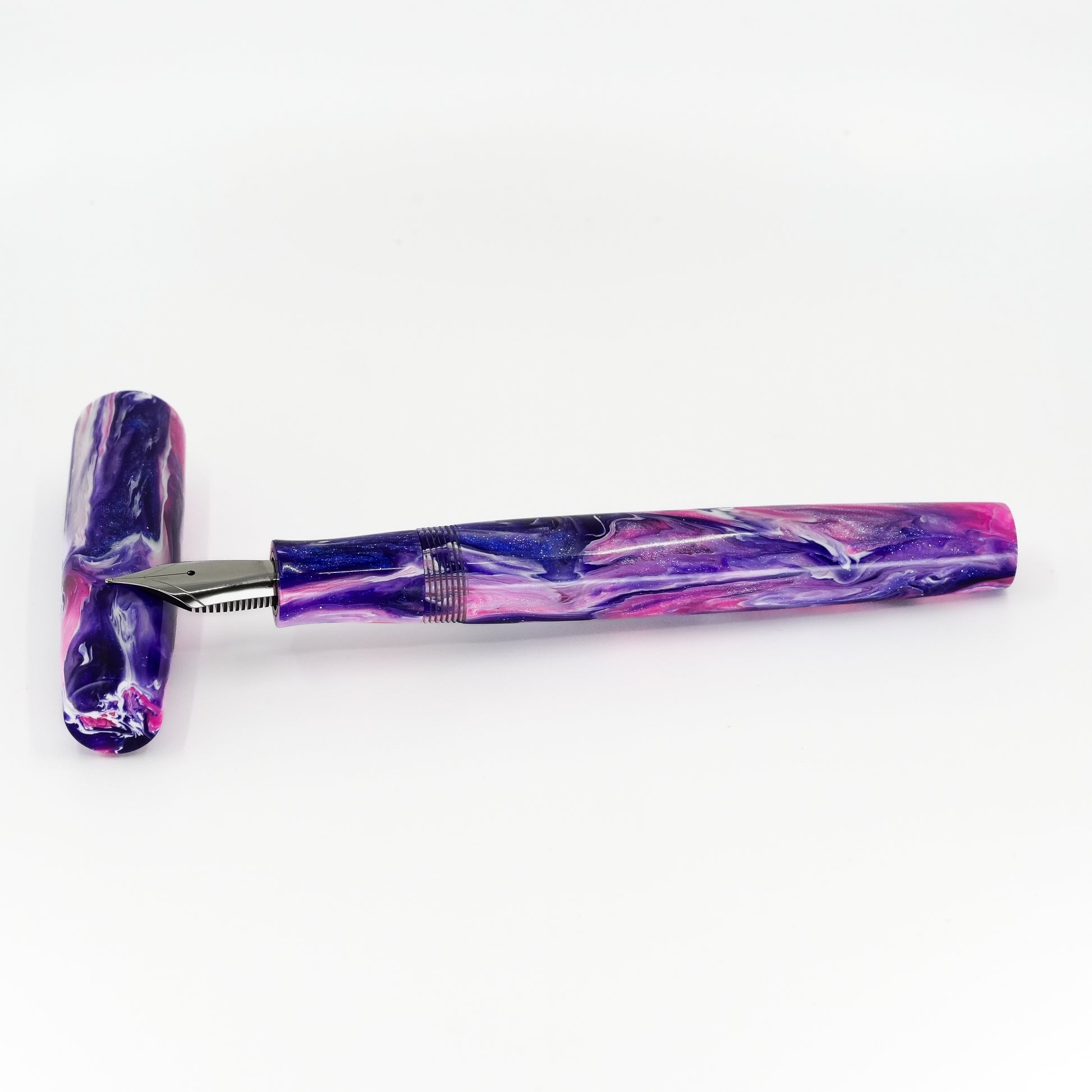 Introducing April Orchid Stepless 14mm pen from Silver Burl Pens. This pen is part of the Simply Elegant series, designed for the discerning writer who values both comfort and style. With its sleek design, this pen is perfect for slipping into a pocket or bag, or for displaying on a desk. Each pen is meticulously crafted to the highest standard and comes with a size six Jowo nib and Schmidt K5 ink converter. The polished steel nib is available in various tip sizes, and alternative nibs can be requested by contacting john@silverburlpens.com.