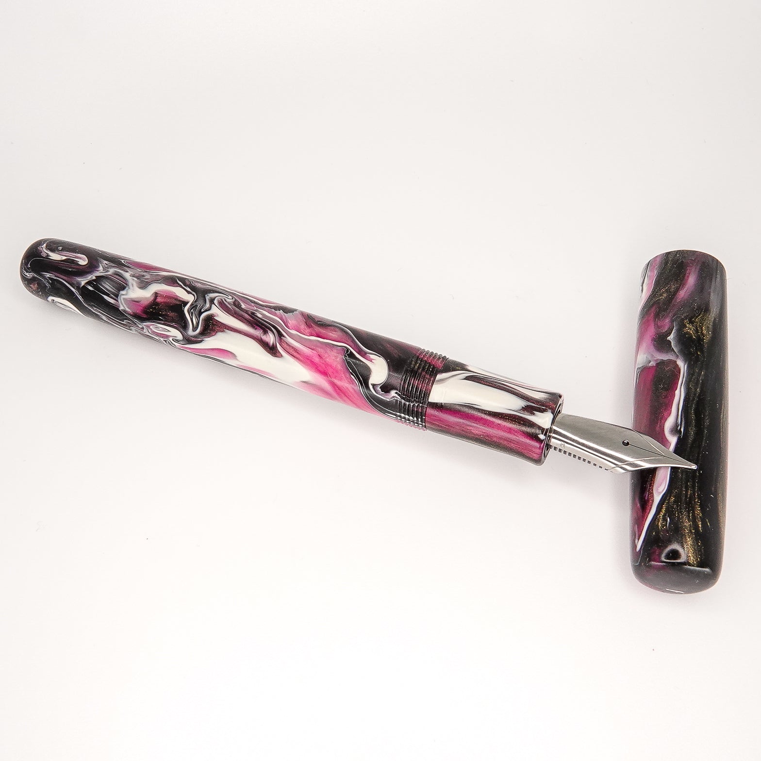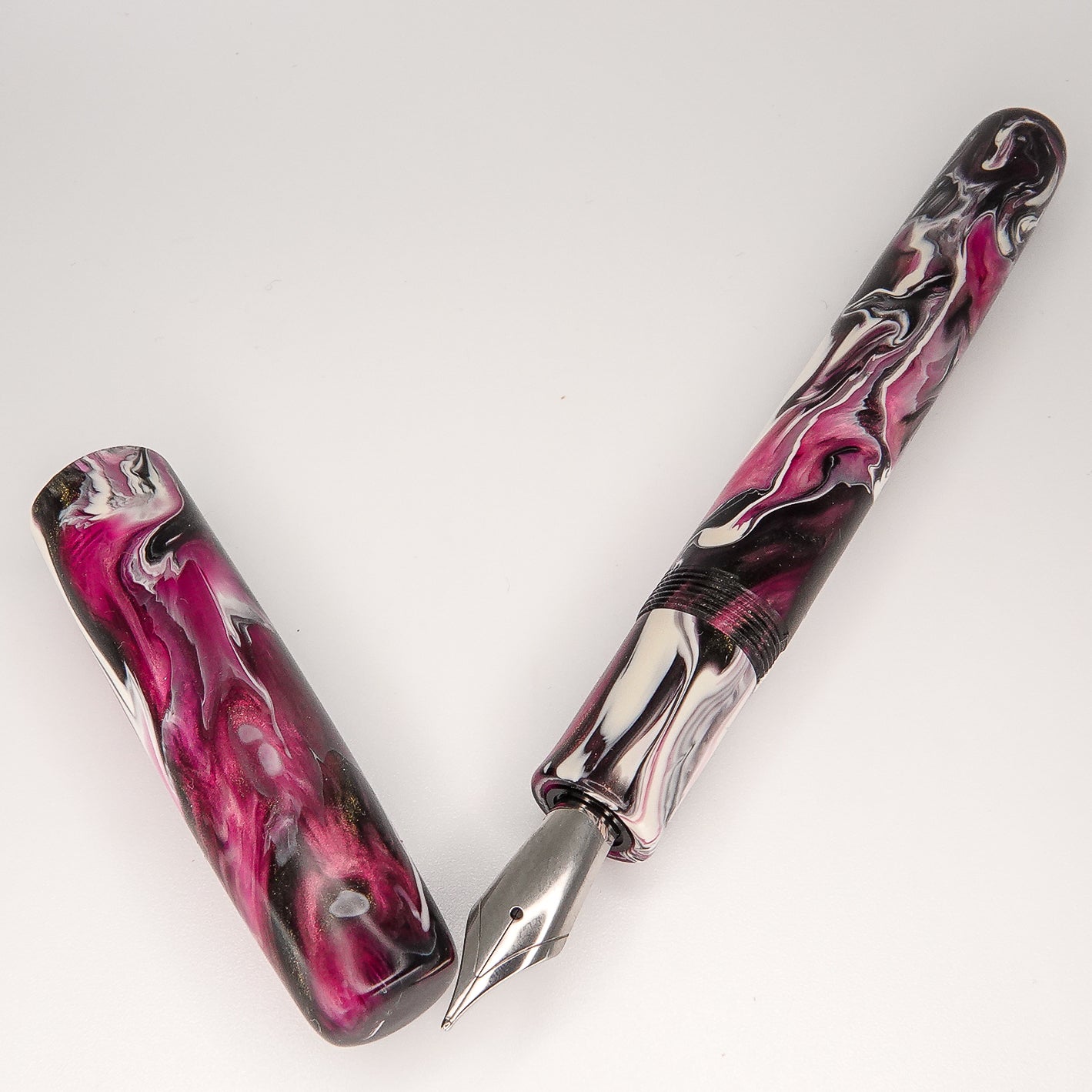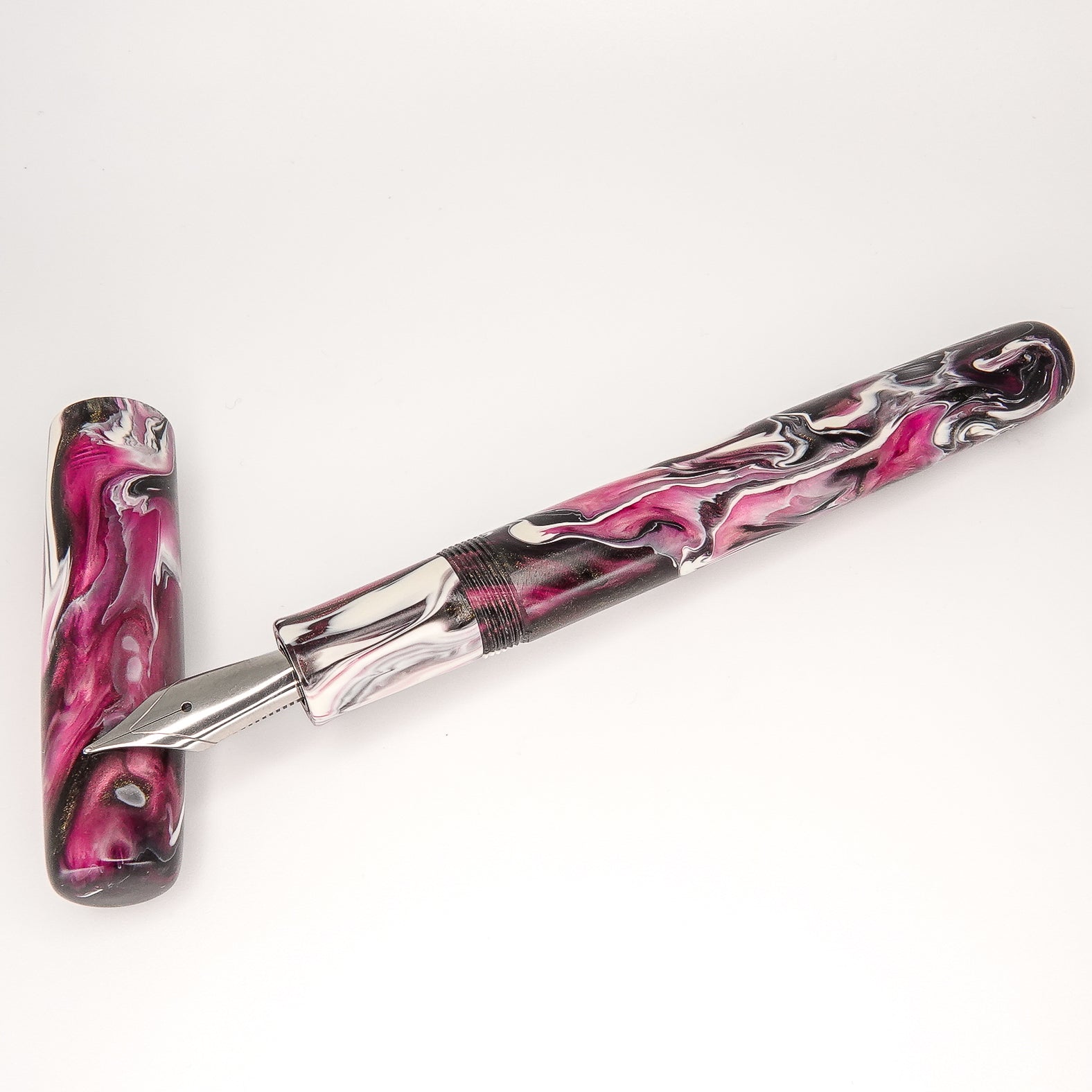 The pen is fitted with a size six Jowo nib and Schmidt K5 ink converter, ensuring a smooth and effortless writing experience. The polished steel nib comes in the tip size of your choice, with other nib options available upon request. Contact john@silverburlpens.com for more information and pricing.