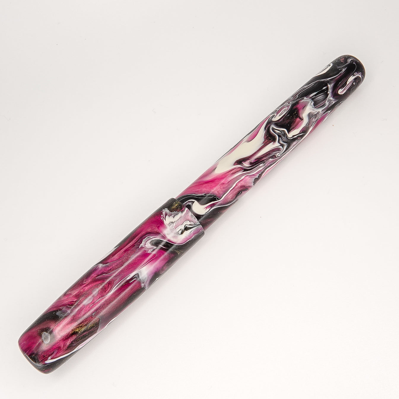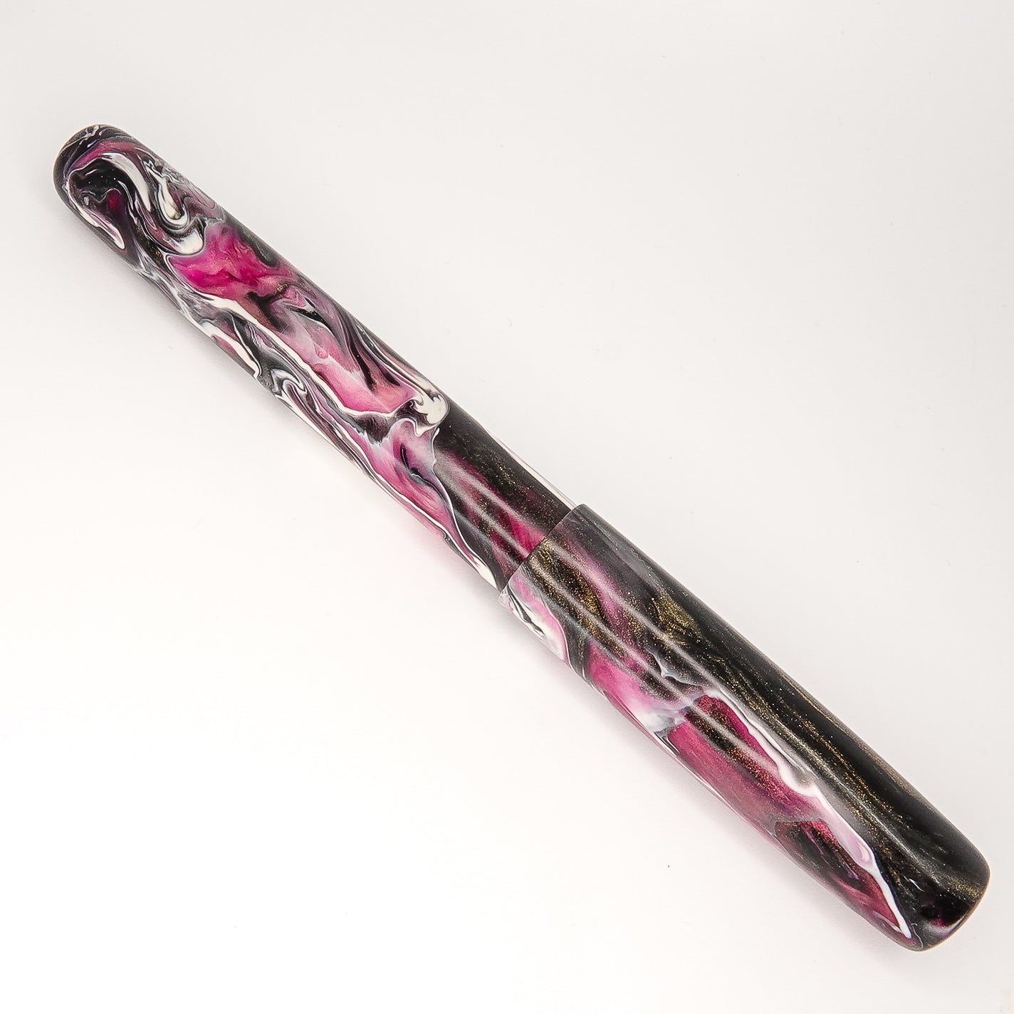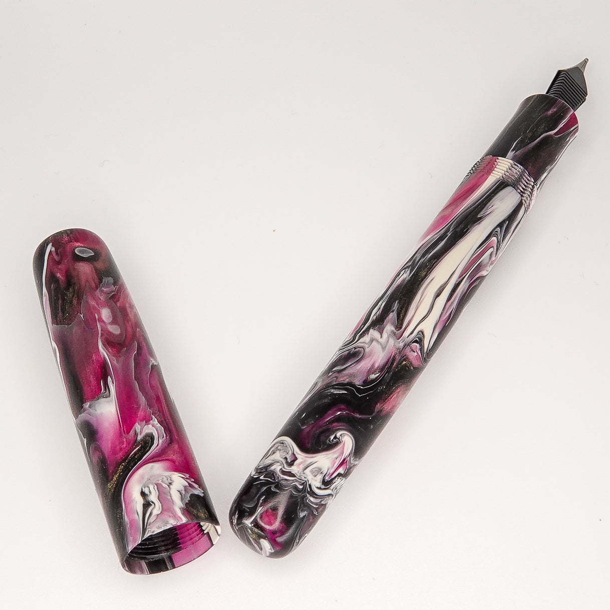 The pen is fitted with a size six Jowo nib and Schmidt K5 ink converter, ensuring a smooth and effortless writing experience. The polished steel nib comes in the tip size of your choice, with other nib options available upon request. Contact john@silverburlpens.com for more information and pricing.