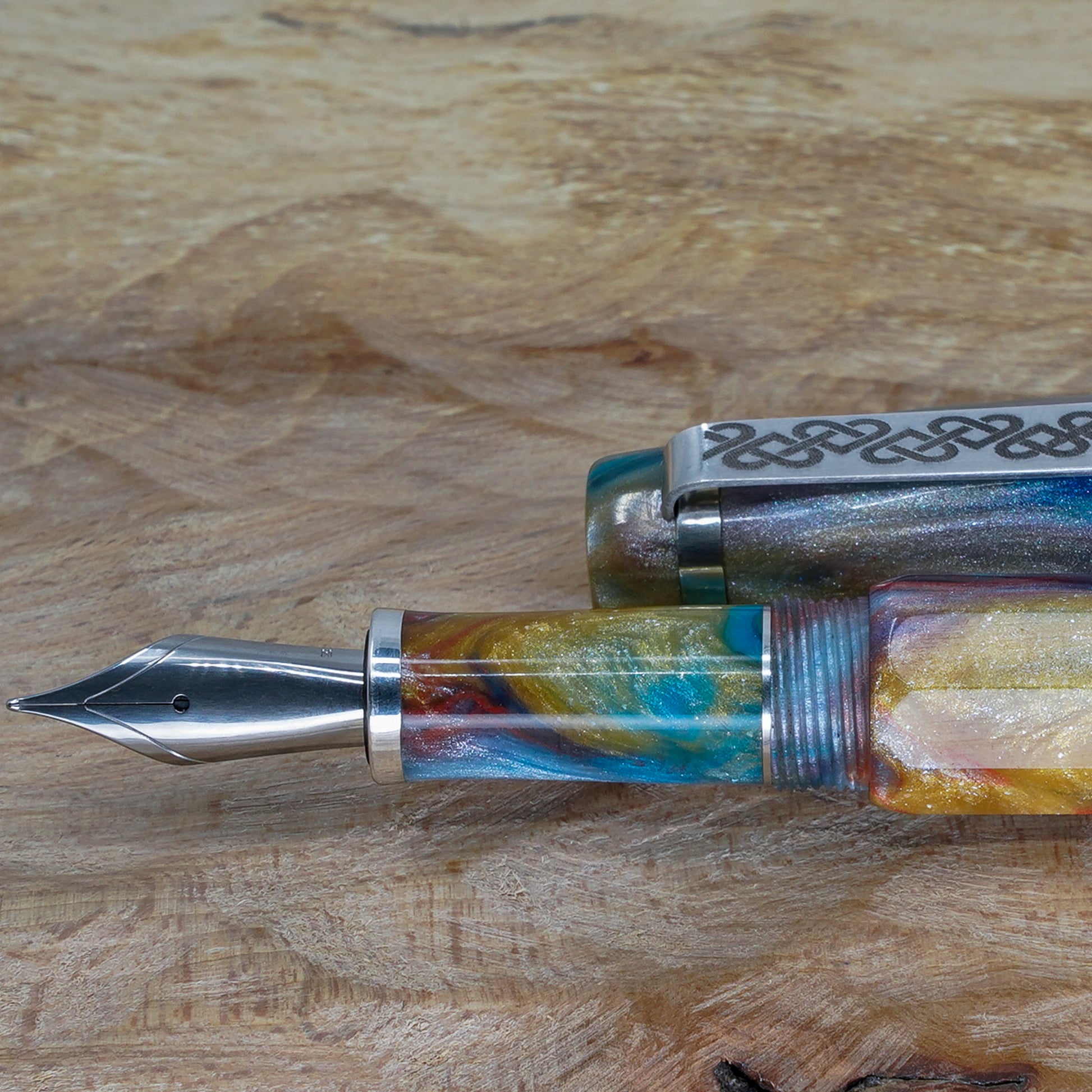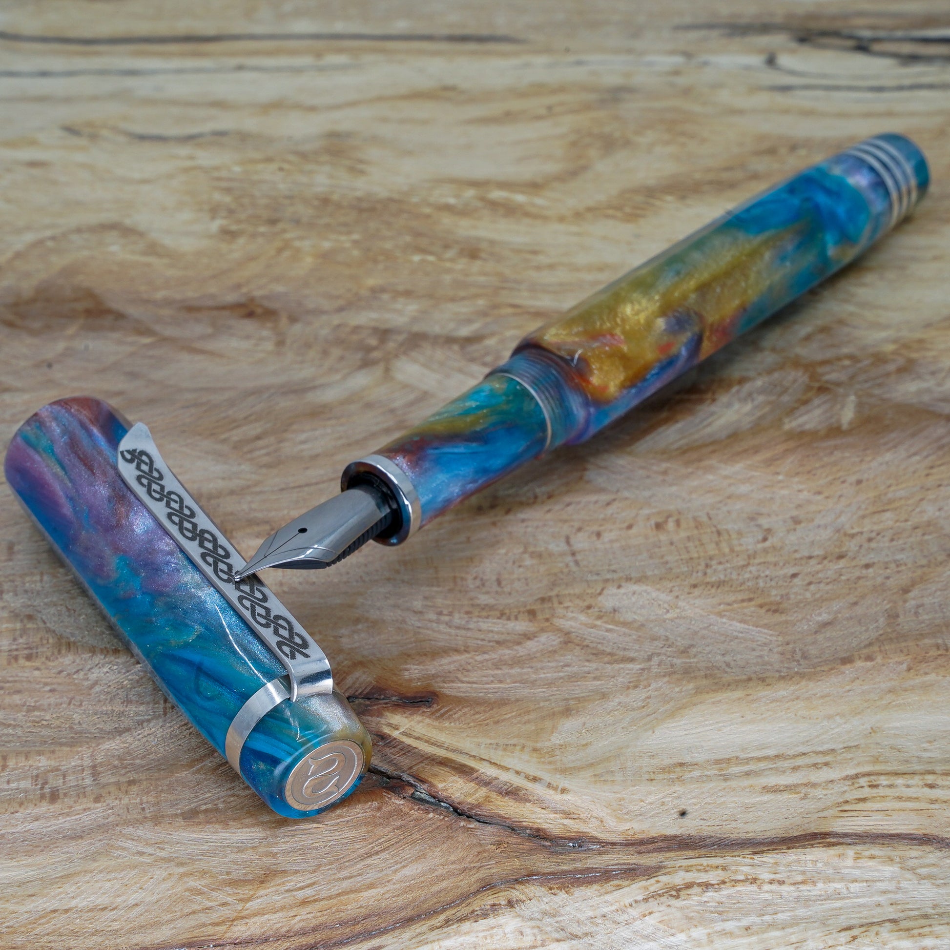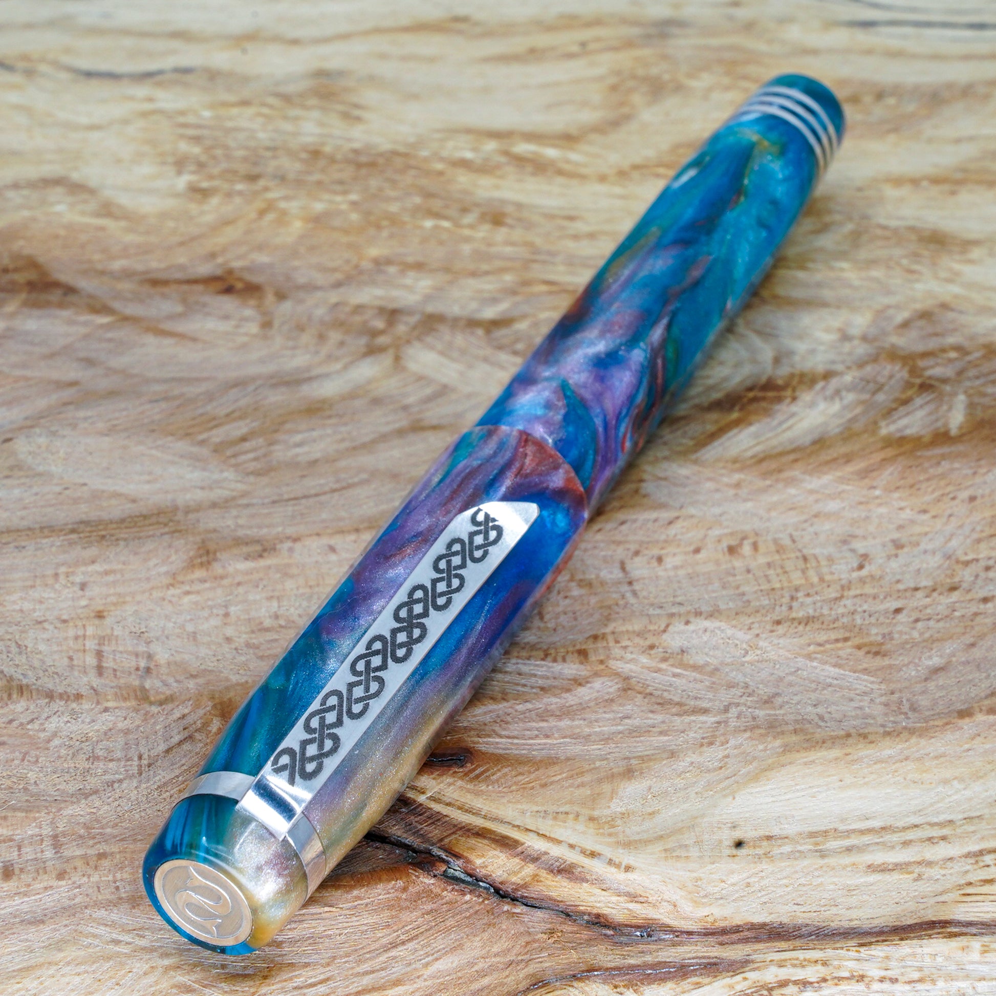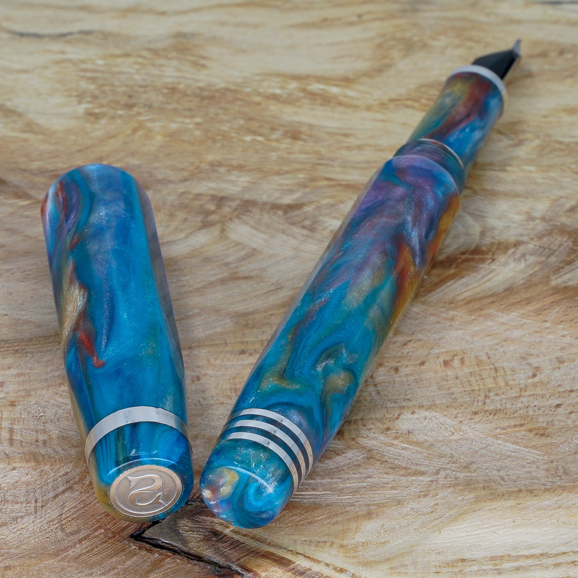 Barrier Reef, Nonagon is a totally hand crafted pen fitted with a polished steel Jowo nib size 6. It measures approximately 145m/m long including cap and 135m/m nib to body end. The body diameter is 16.5m/m with a 14m/m thread and the cap diameter is 17.5m/m. The pen comes with any nib tip size and Schmidt K5 ink converter, other nib options available. The silver used is Argentium .940, whiter and brighter than traditional .925 sterling and much more tarnish resistant. Argentium Silver is hypoallergenic and is well-suited for those who are unable to wear traditional Sterling silver jewellery. Argentium also has antibacterial properties and does not contain nickel.