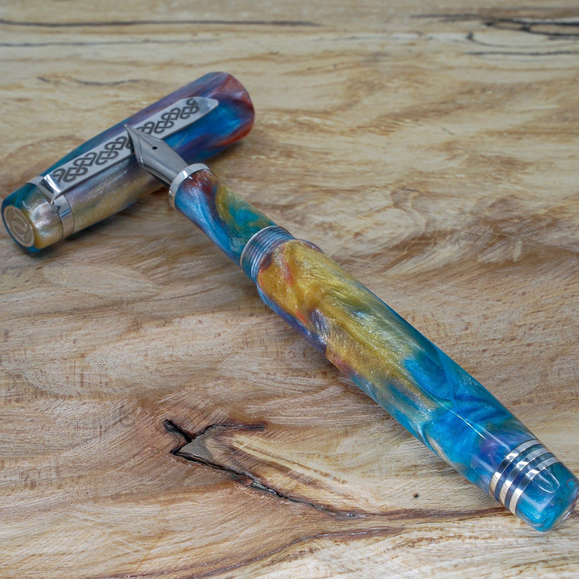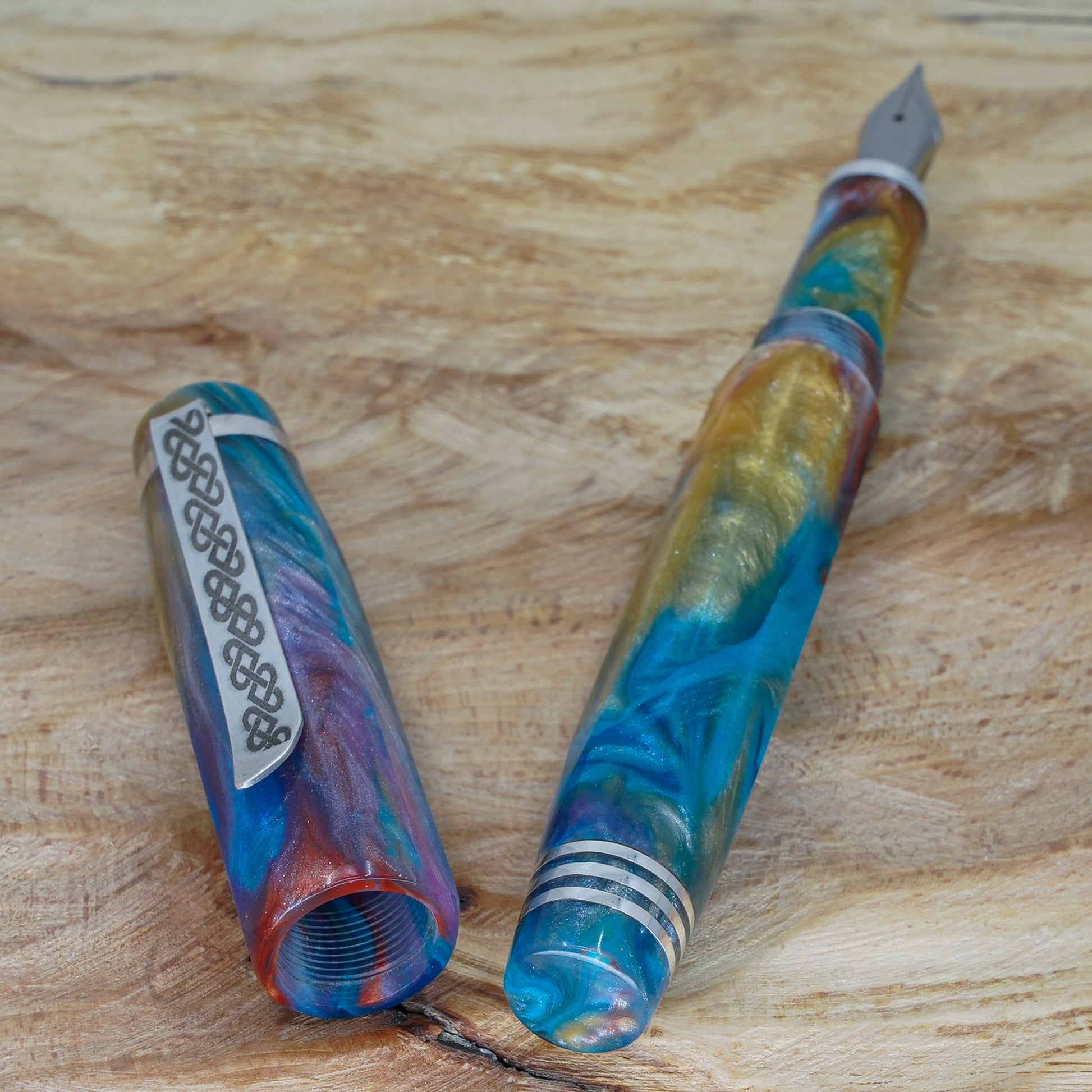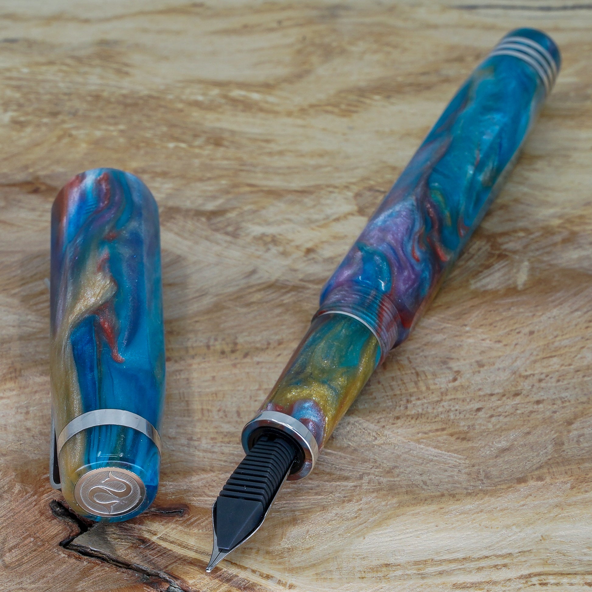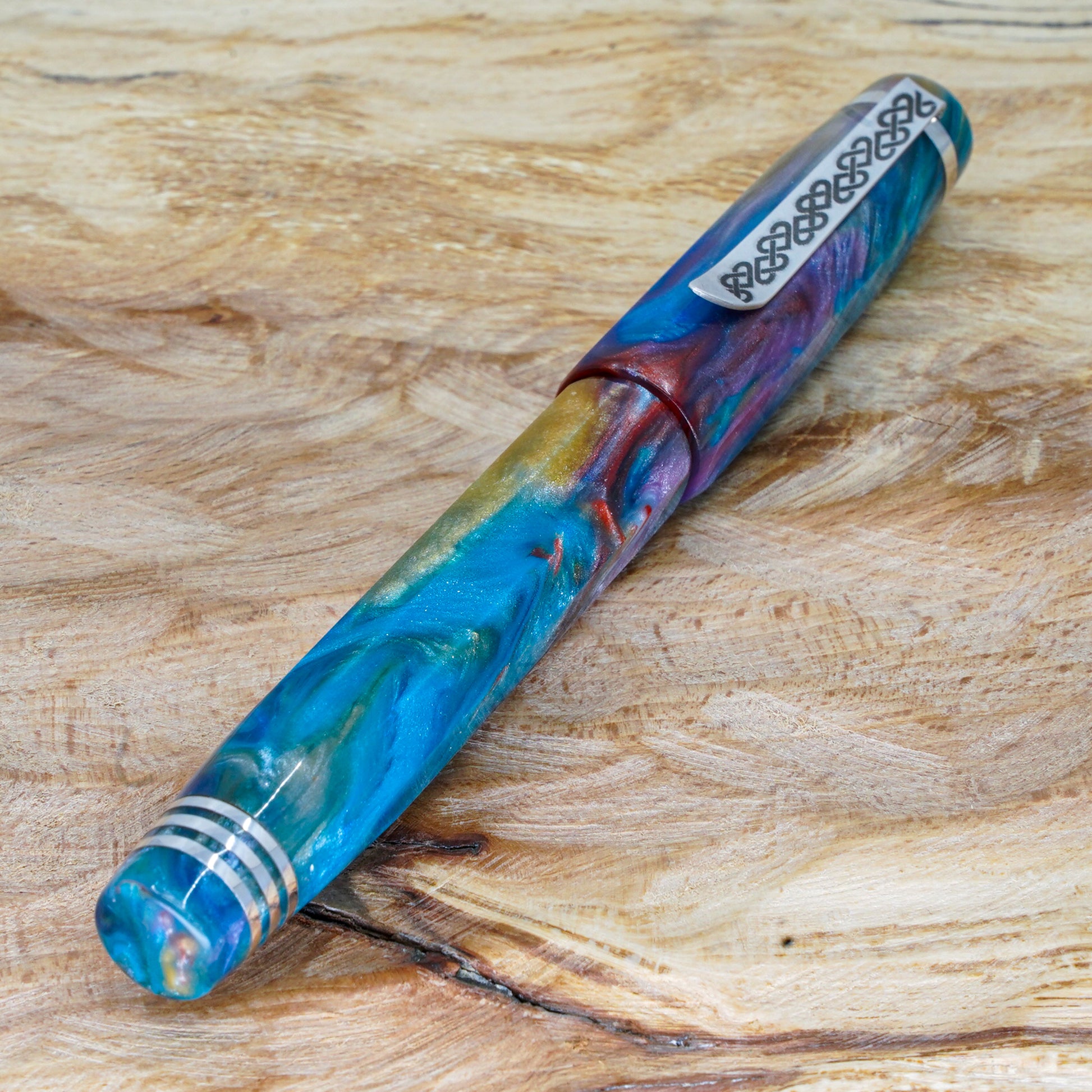 Barrier Reef, Nonagon is a totally hand crafted pen fitted with a polished steel Jowo nib size 6. It measures approximately 145m/m long including cap and 135m/m nib to body end. The body diameter is 16.5m/m with a 14m/m thread and the cap diameter is 17.5m/m. The pen comes with any nib tip size and Schmidt K5 ink converter, other nib options available. The silver used is Argentium .940, whiter and brighter than traditional .925 sterling and much more tarnish resistant. Argentium Silver is hypoallergenic and is well-suited for those who are unable to wear traditional Sterling silver jewellery. Argentium also has antibacterial properties and does not contain nickel.