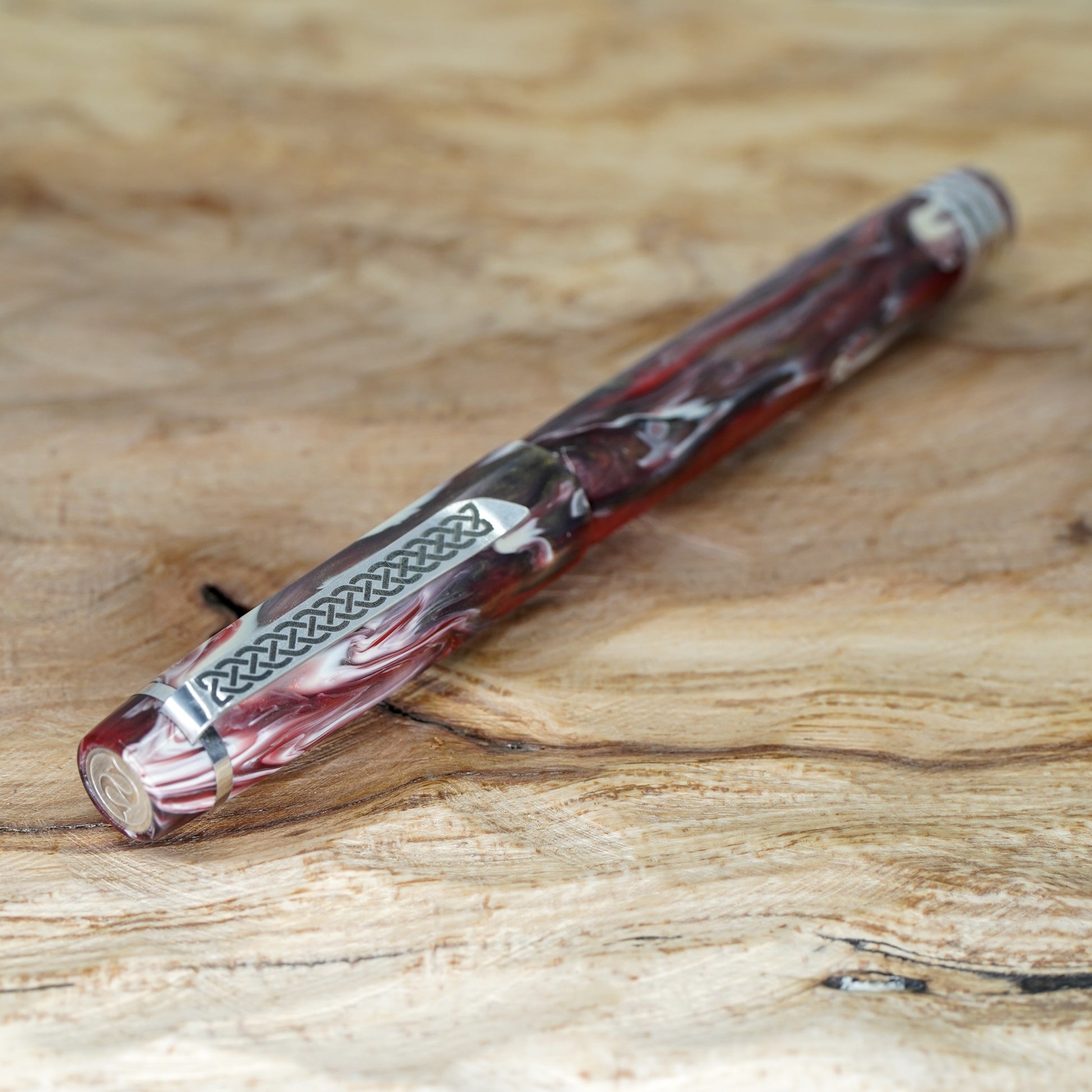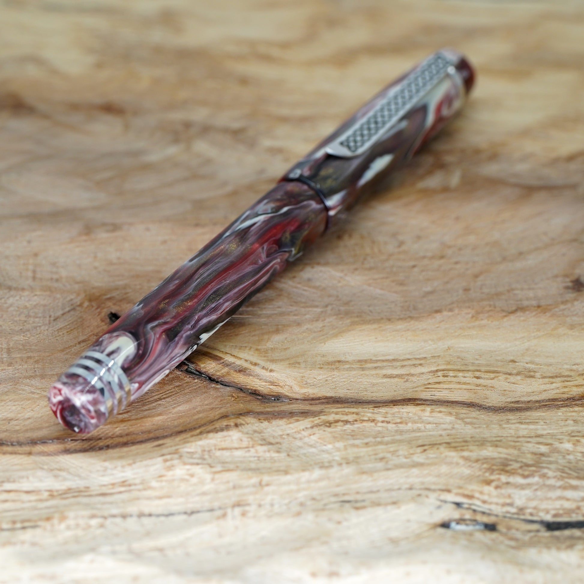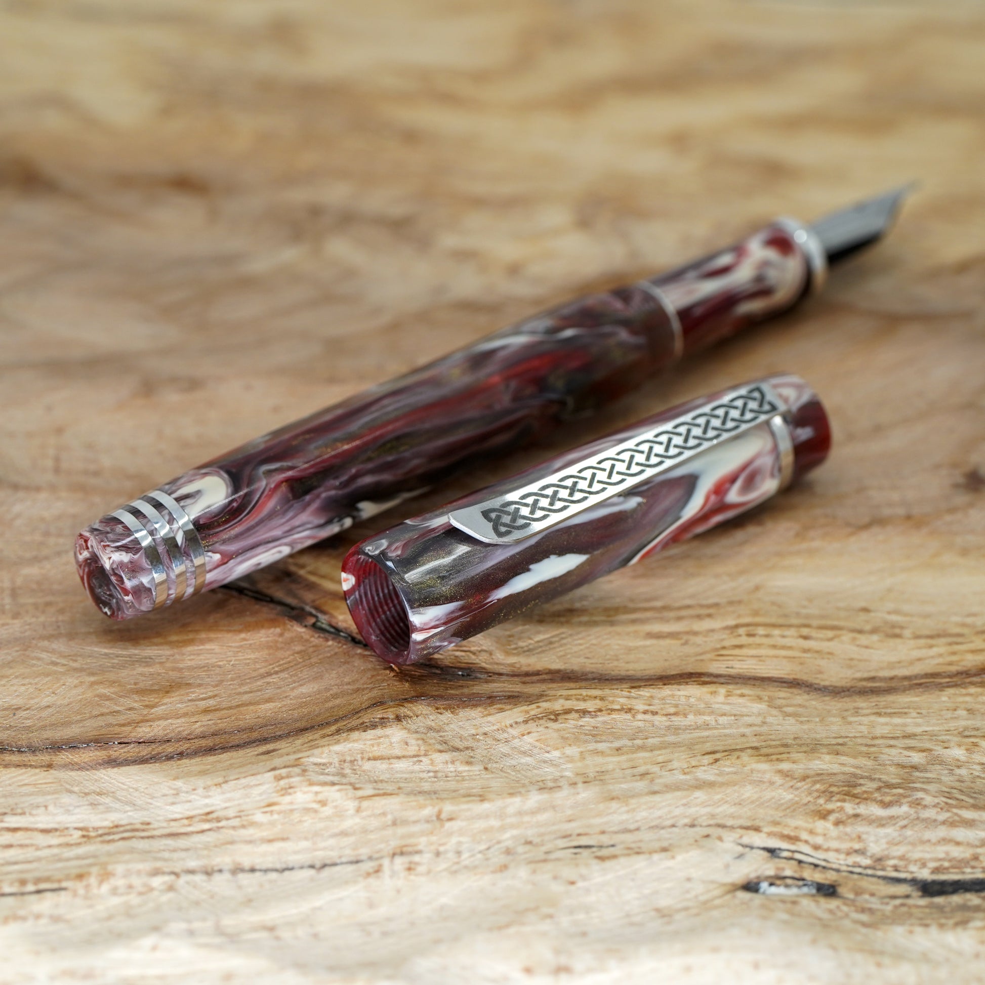 Black Cherry Koi Nonagon fitted with a polished steel Jowo nib size 6. PEN SIZE: Approximately is 145m/m long including cap. 135m/m nib to body end. Body diameter 15m/m with a 13m/m thread. Cap diameter 16m/m. Nib make fitted is a Jowo size six polished steel medium tip other tip sizes available at no extra cost extra fine, fine, broad. The pen comes with a Schmidt K5 ink converter. Other nibs are available; please contact john@silverburlpens.com to discuss alternatives and prices. I`ll be pleased to offer advice. A totally hand crafted pen including all the silver work.