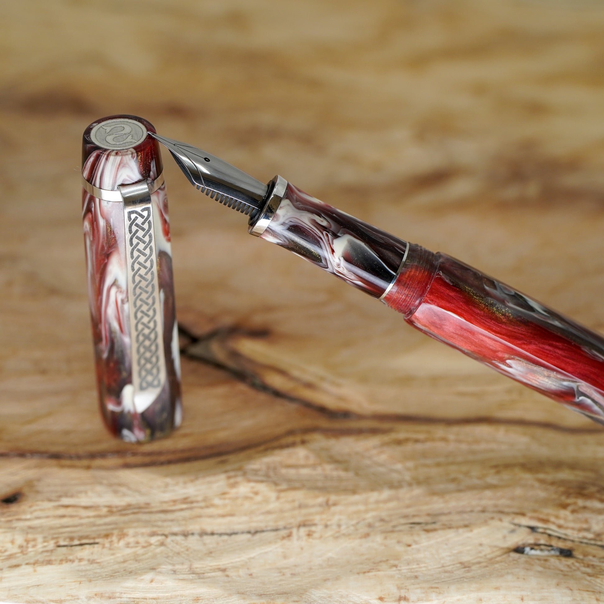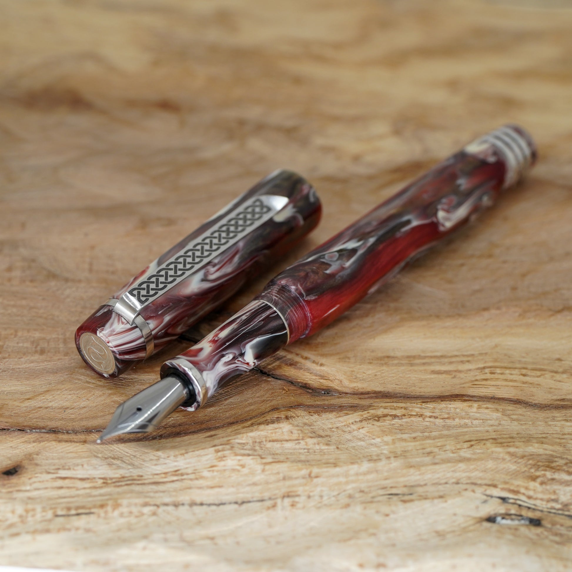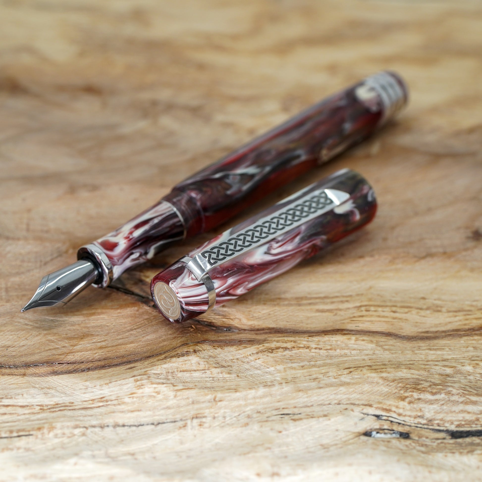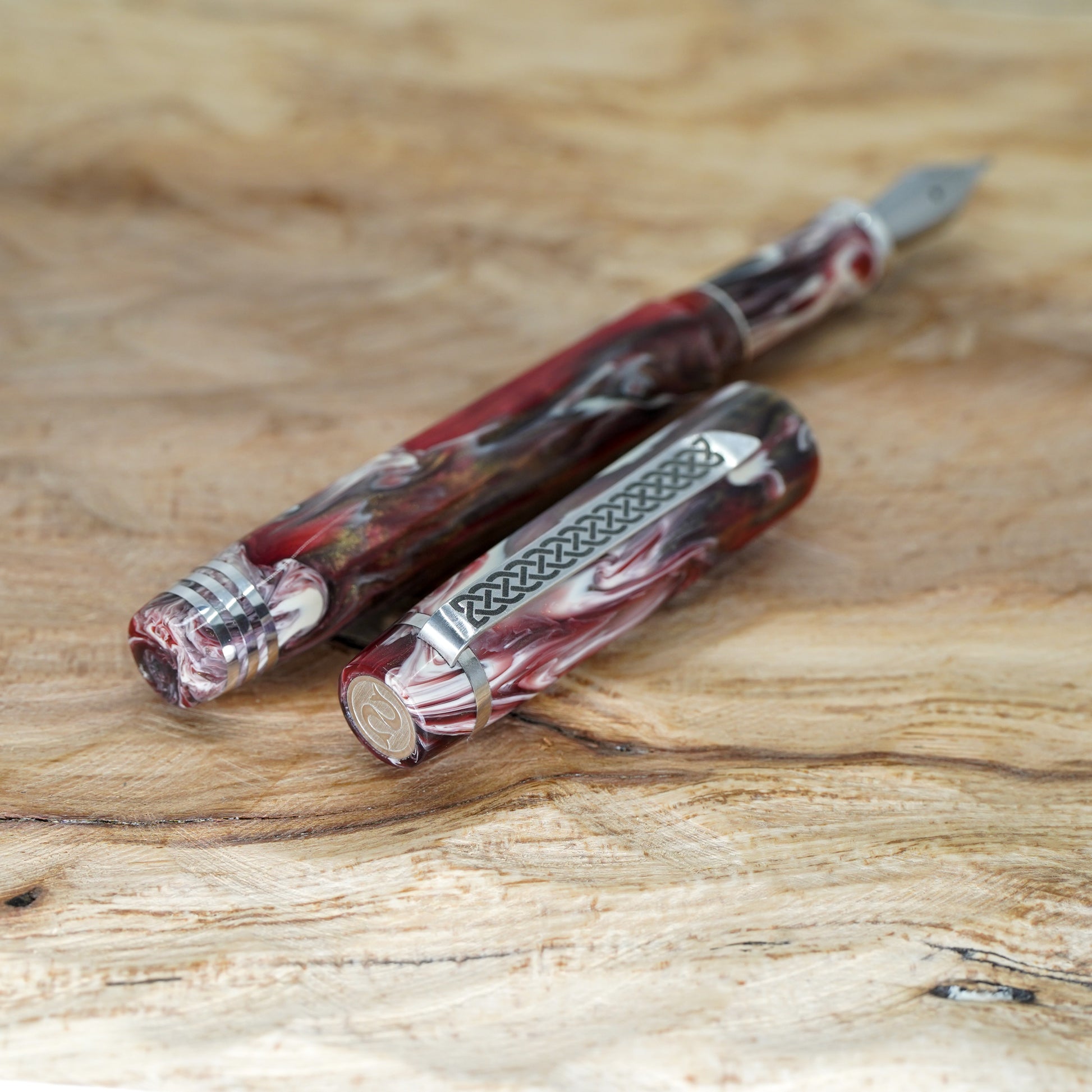 Black Cherry Koi Nonagon fitted with a polished steel Jowo nib size 6. PEN SIZE: Approximately is 145m/m long including cap. 135m/m nib to body end. Body diameter 15m/m with a 13m/m thread. Cap diameter 16m/m. Nib make fitted is a Jowo size six polished steel medium tip other tip sizes available at no extra cost extra fine, fine, broad. The pen comes with a Schmidt K5 ink converter. Other nibs are available; please contact john@silverburlpens.com to discuss alternatives and prices. I`ll be pleased to offer advice. A totally hand crafted pen including all the silver work.