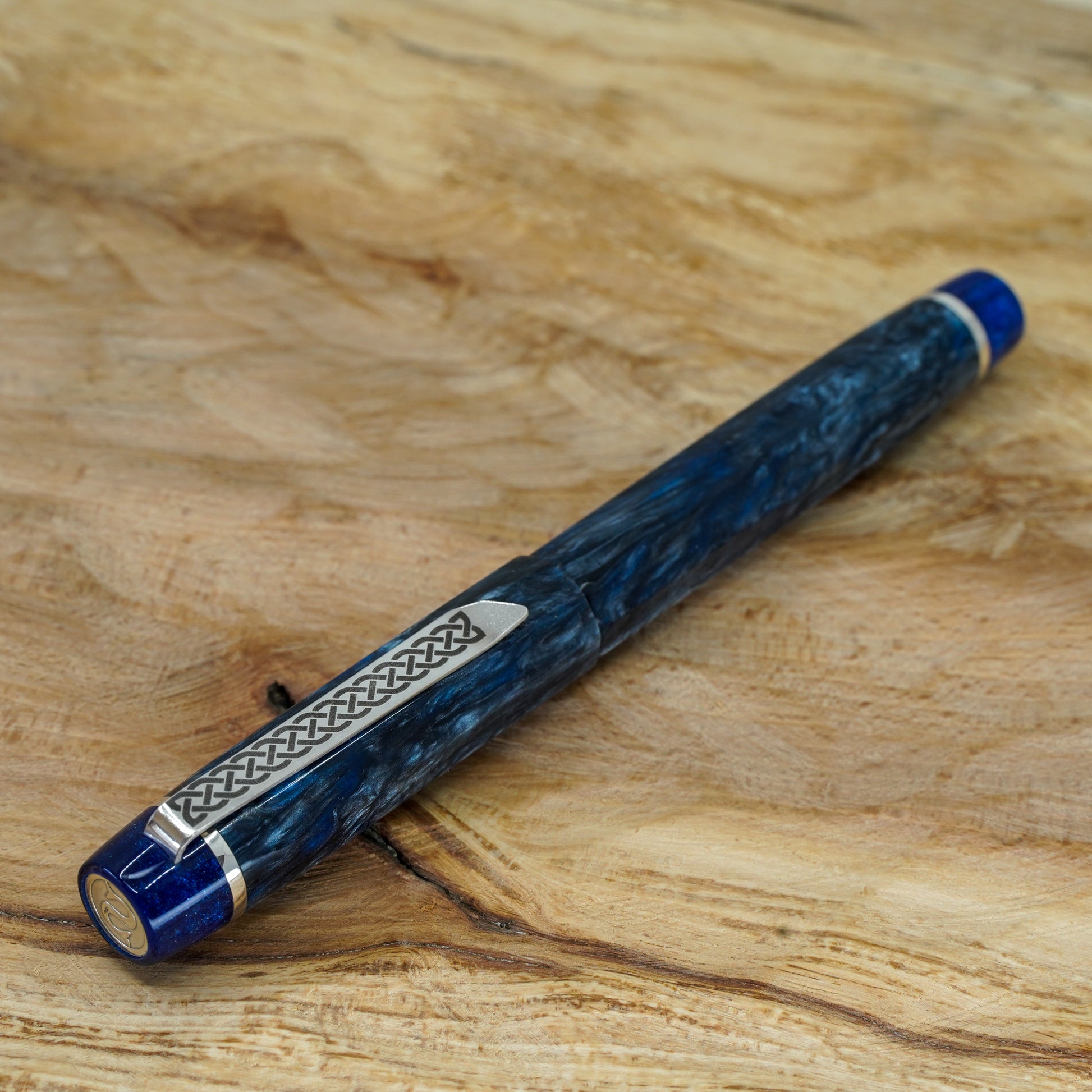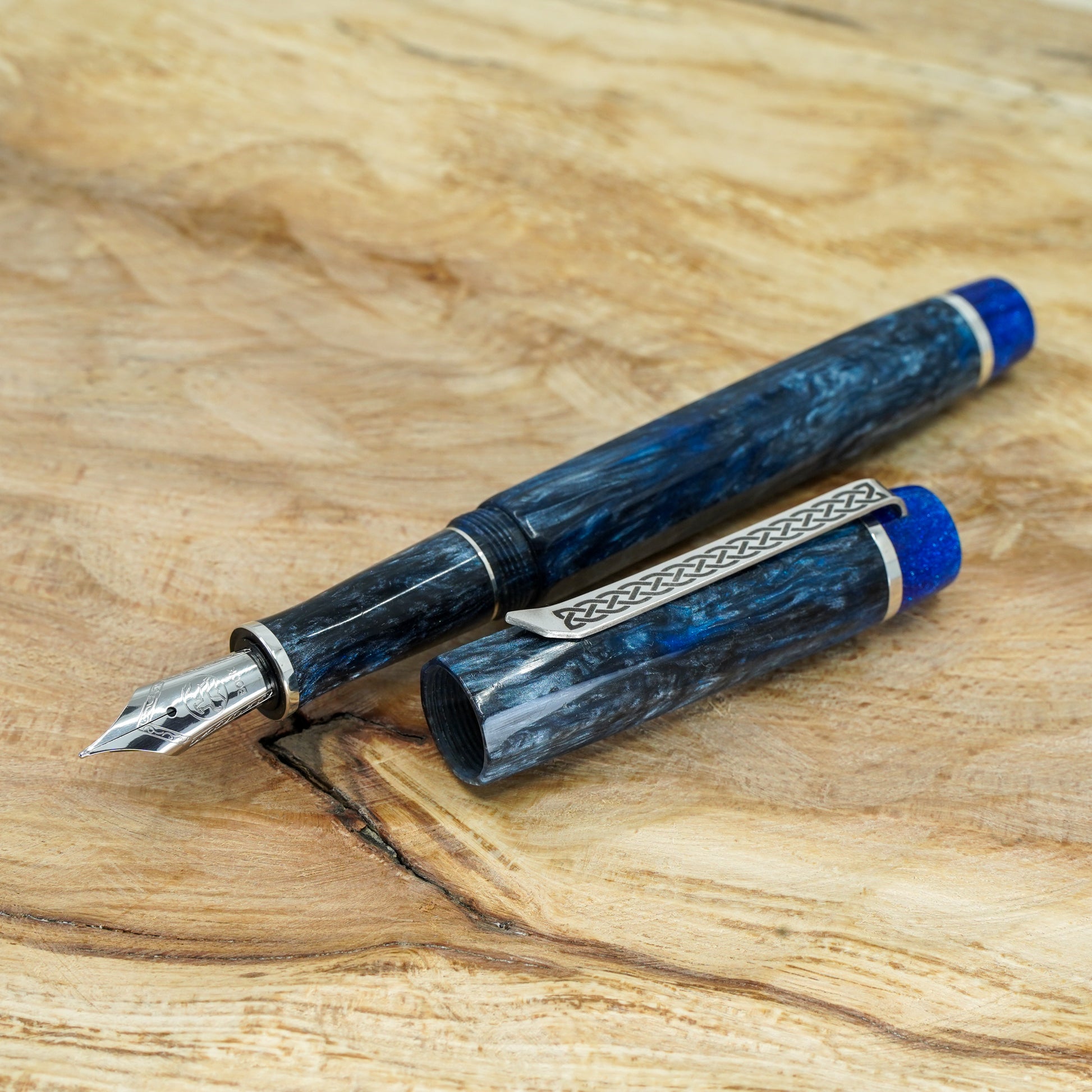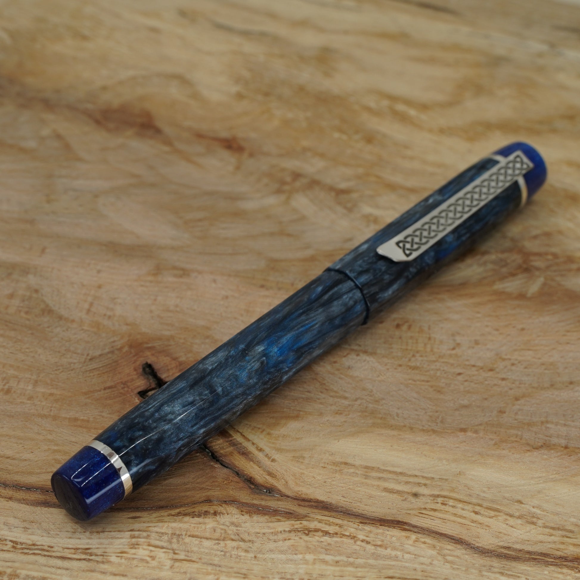 The Blue Mamba Nonagon is a totally hand crafted pen with a polished steel Bock nib size 6. It is approximately 145m/m long including cap and 135m/m nib to body end, with a body diameter of 15m/m and a cap diameter of 16m/m. The pen comes with a Schmidt K5 ink converter, and other nib options are available upon request. The silver used is Argentium .940, which is whiter and brighter than traditional .925 sterling and much more tarnish resistant. Argentium is also hypoallergenic and has antibacterial properties, and does not contain nickel.