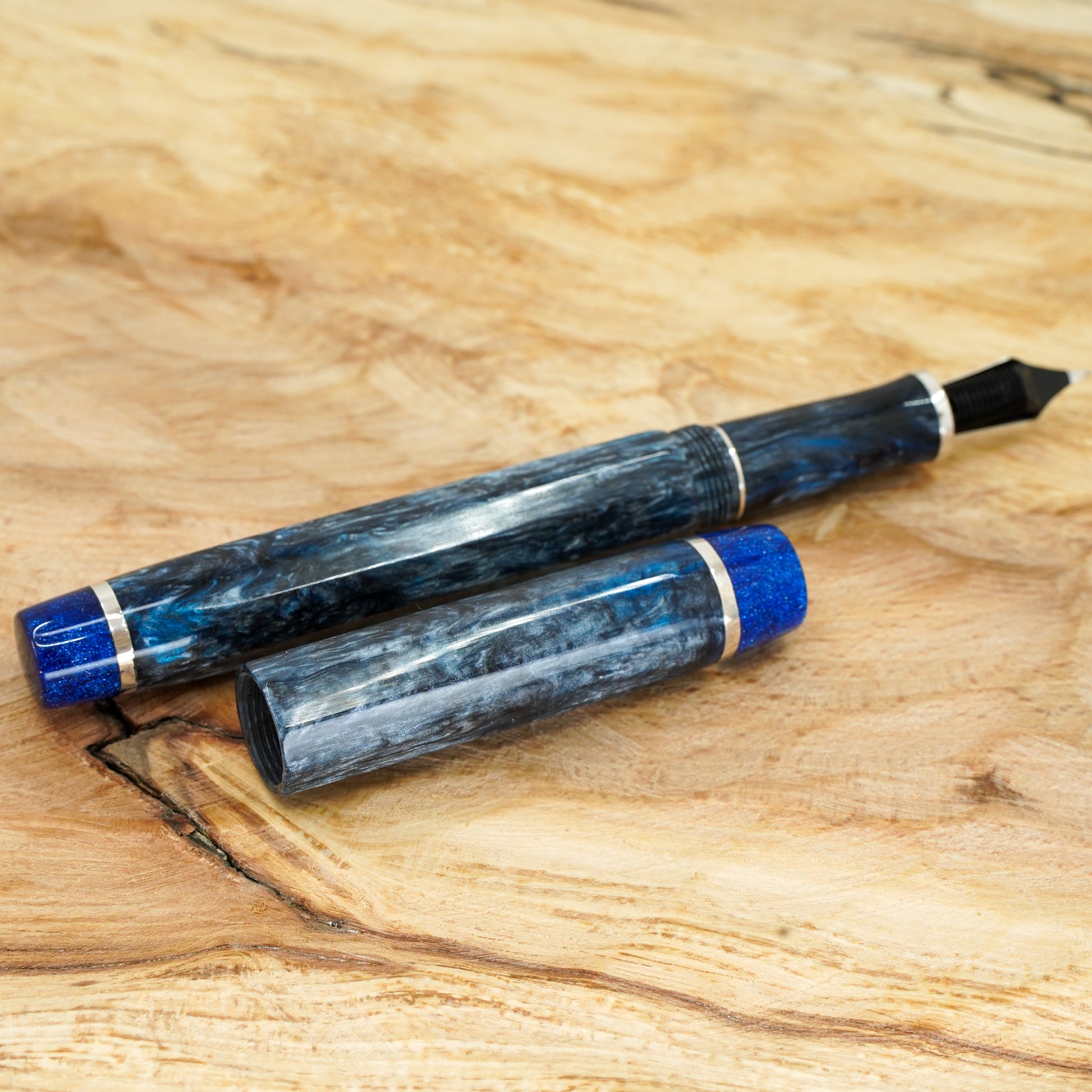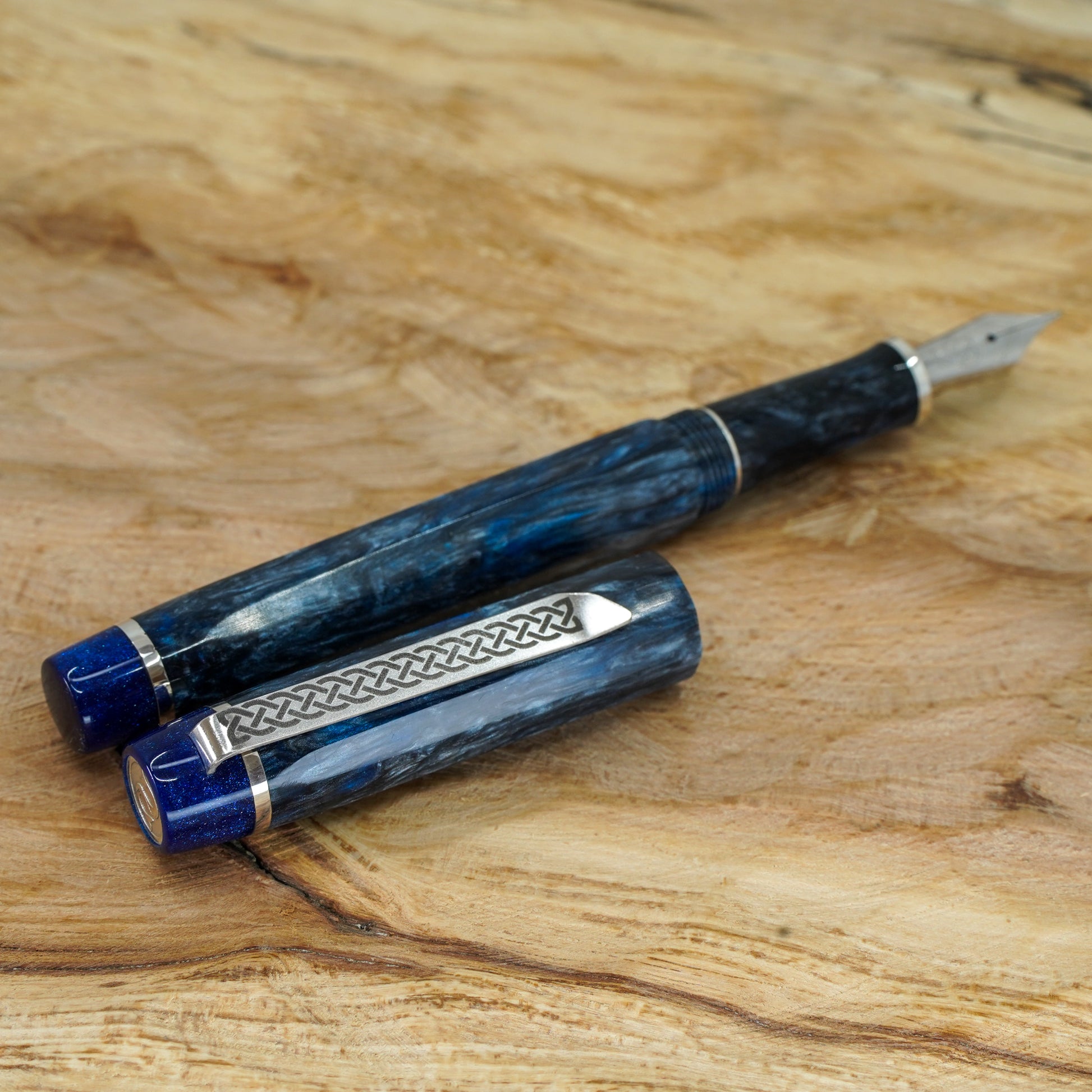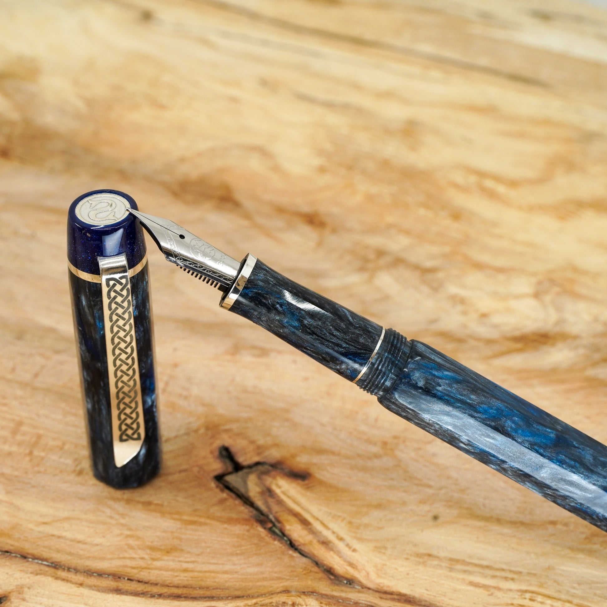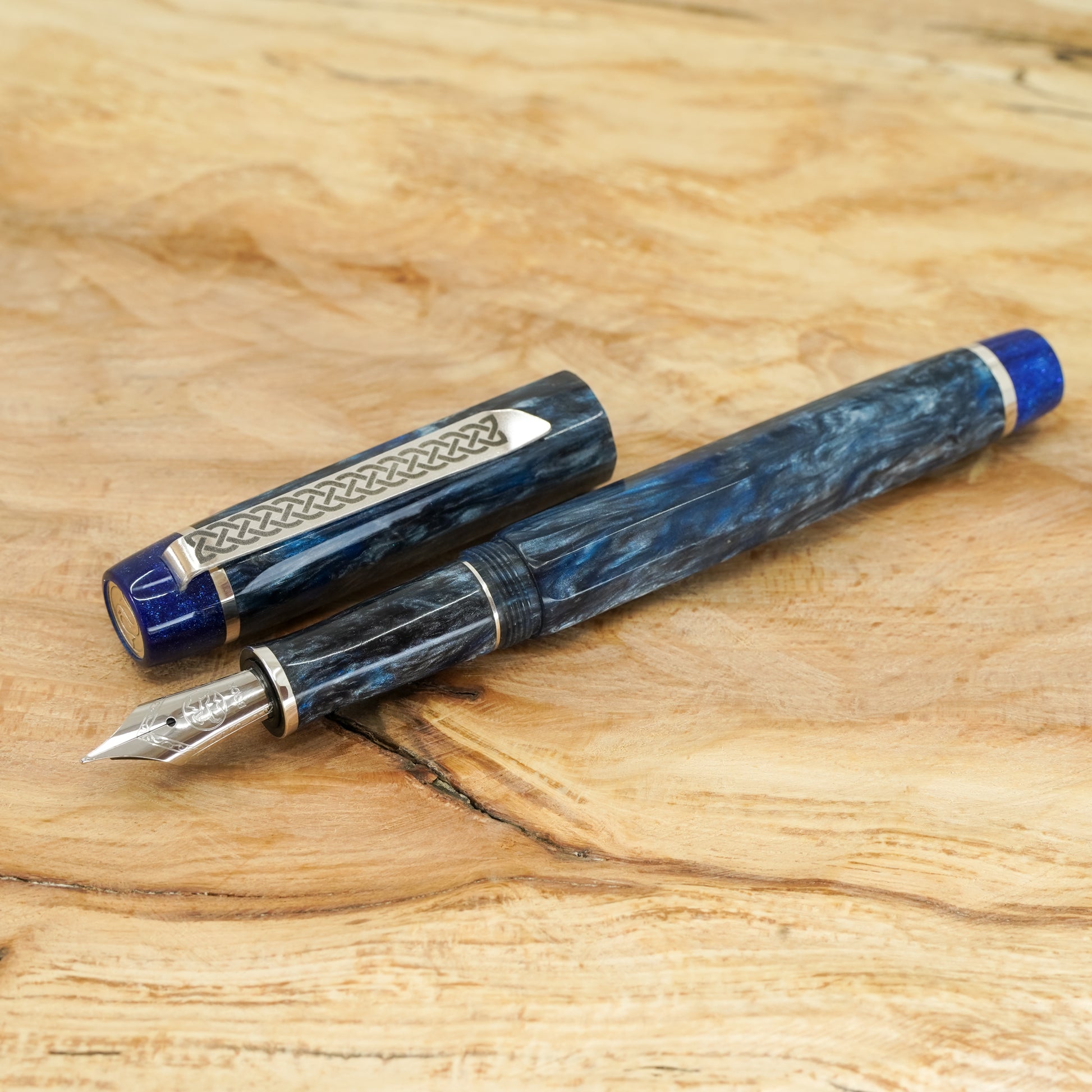The Blue Mamba Nonagon is a totally hand crafted pen with a polished steel Bock nib size 6. It is approximately 145m/m long including cap and 135m/m nib to body end, with a body diameter of 15m/m and a cap diameter of 16m/m. The pen comes with a Schmidt K5 ink converter, and other nib options are available upon request. The silver used is Argentium .940, which is whiter and brighter than traditional .925 sterling and much more tarnish resistant. Argentium is also hypoallergenic and has antibacterial properties, and does not contain nickel.