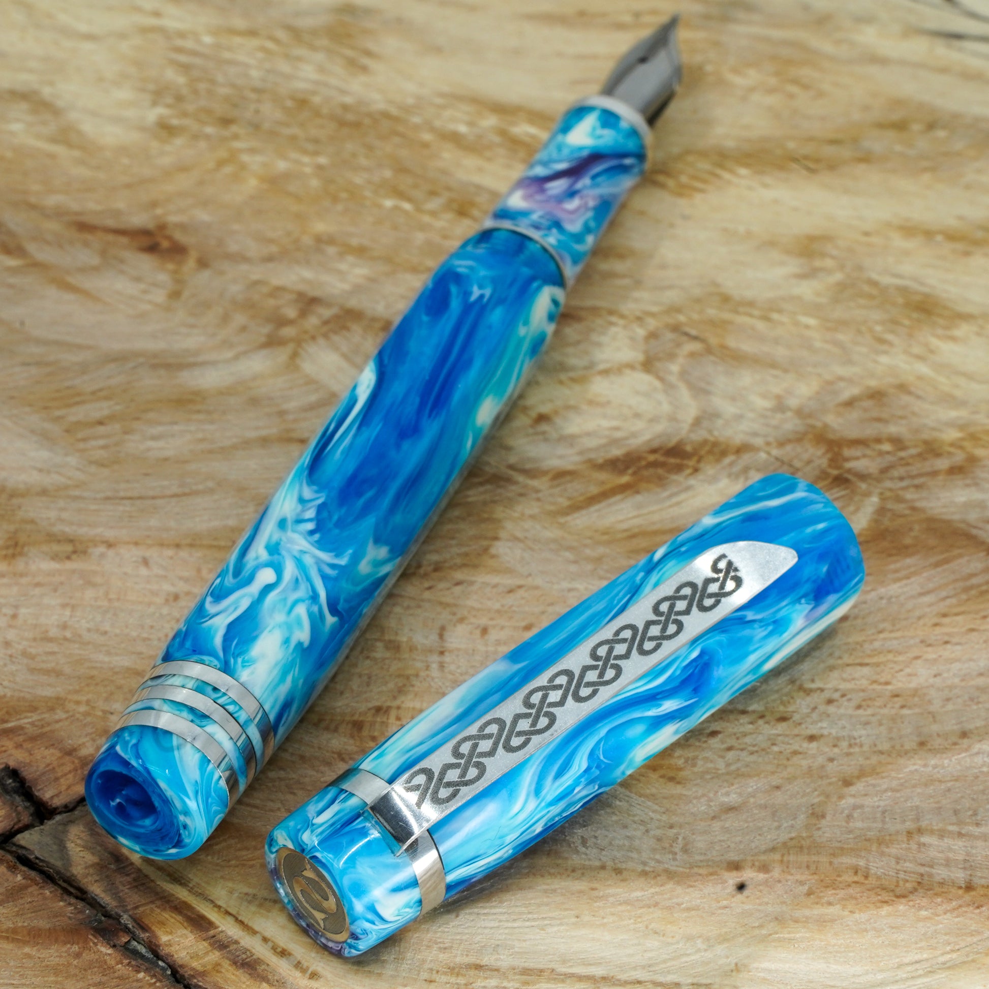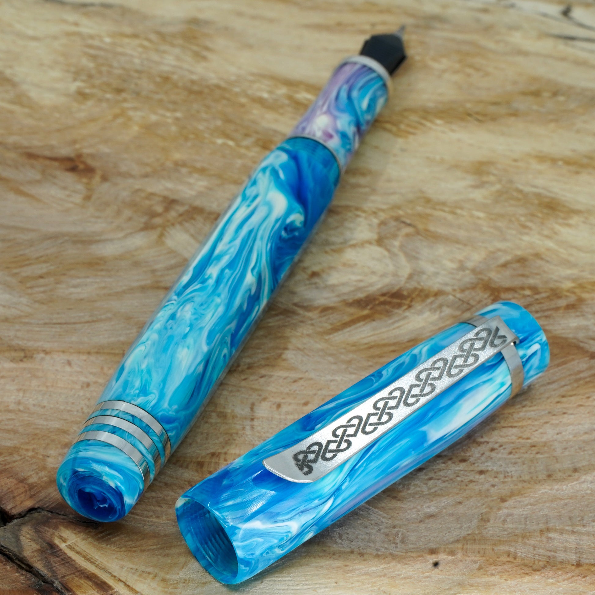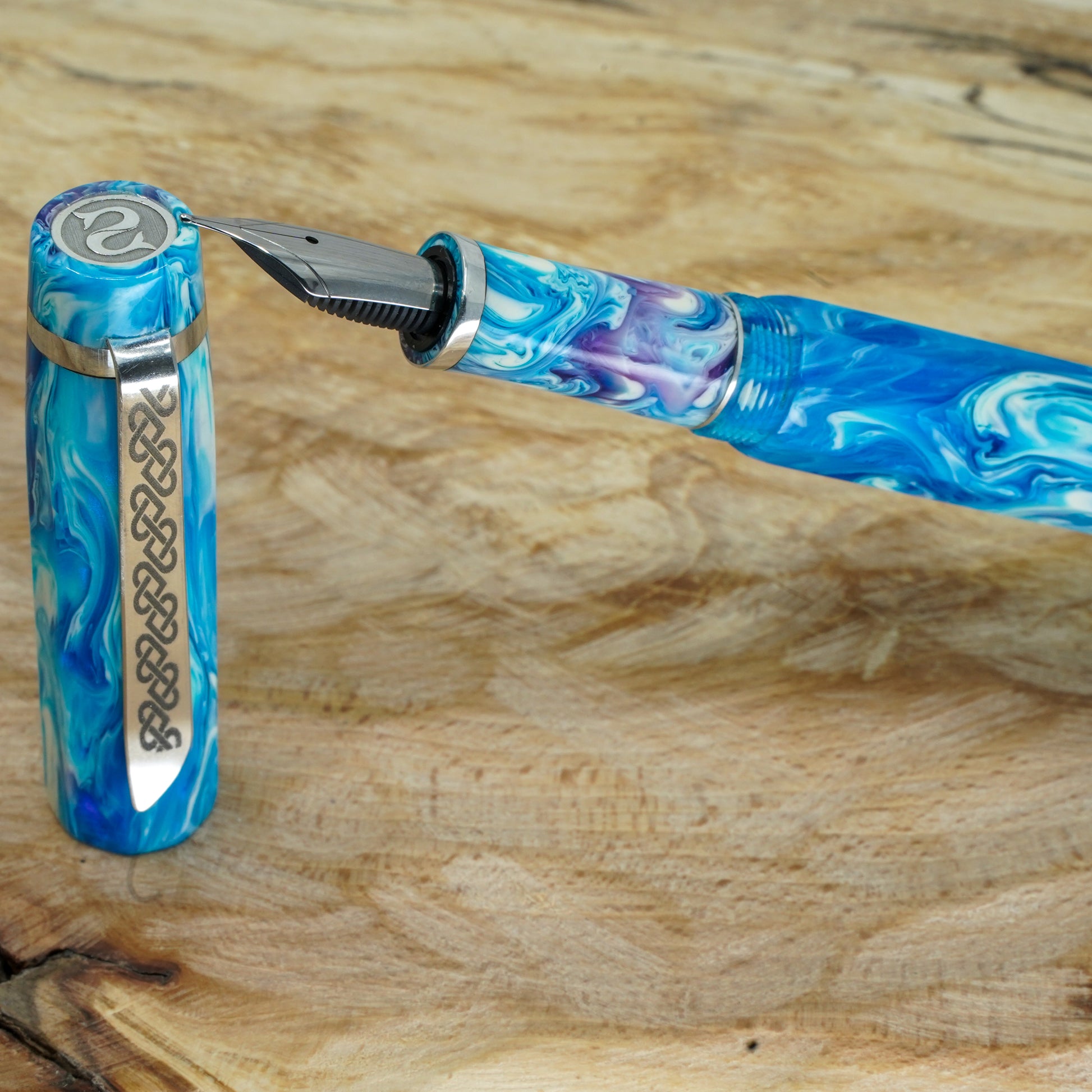 Bohemian Rose Koi Nonagon is a handcrafted pen fitted with a polished steel Jowo nib size 6. It measures 145m/m long including cap and 135m/m nib to body end, with a body diameter of 15m/m and a cap diameter of 16m/m. It comes with a Schmidt K5 ink converter, and other nib options are available upon request. The silver used is Argentium .940, which is whiter and brighter than traditional .925 sterling and is more tarnish resistant. Argentium is also hypoallergenic and has antibacterial properties, and does not contain nickel.