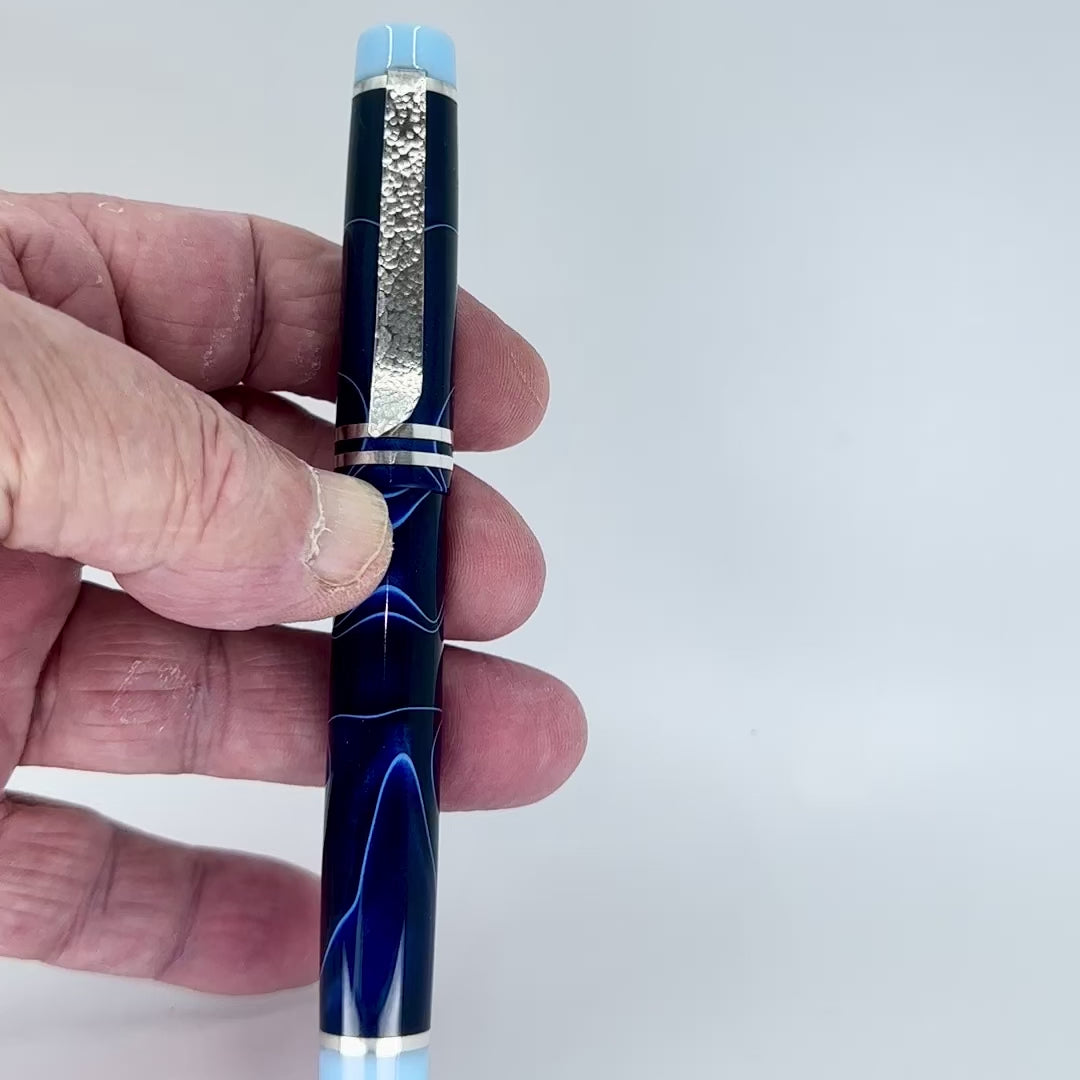 Conway Stewart Blue with White Swirl, from Silverburlpens is a totally hand crafted pen, made from material created by the Carolina pen co, It is fitted with a polished steel Jowo nib size 6, and comes with any nib tip size and Schmidt K5 ink converter. Other nibs are available upon request.