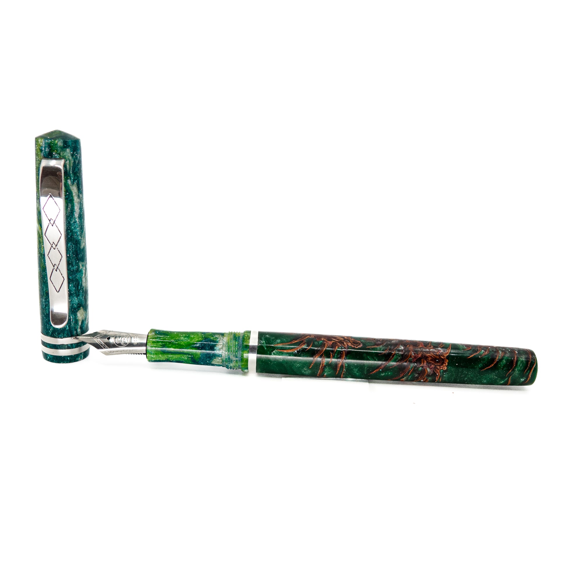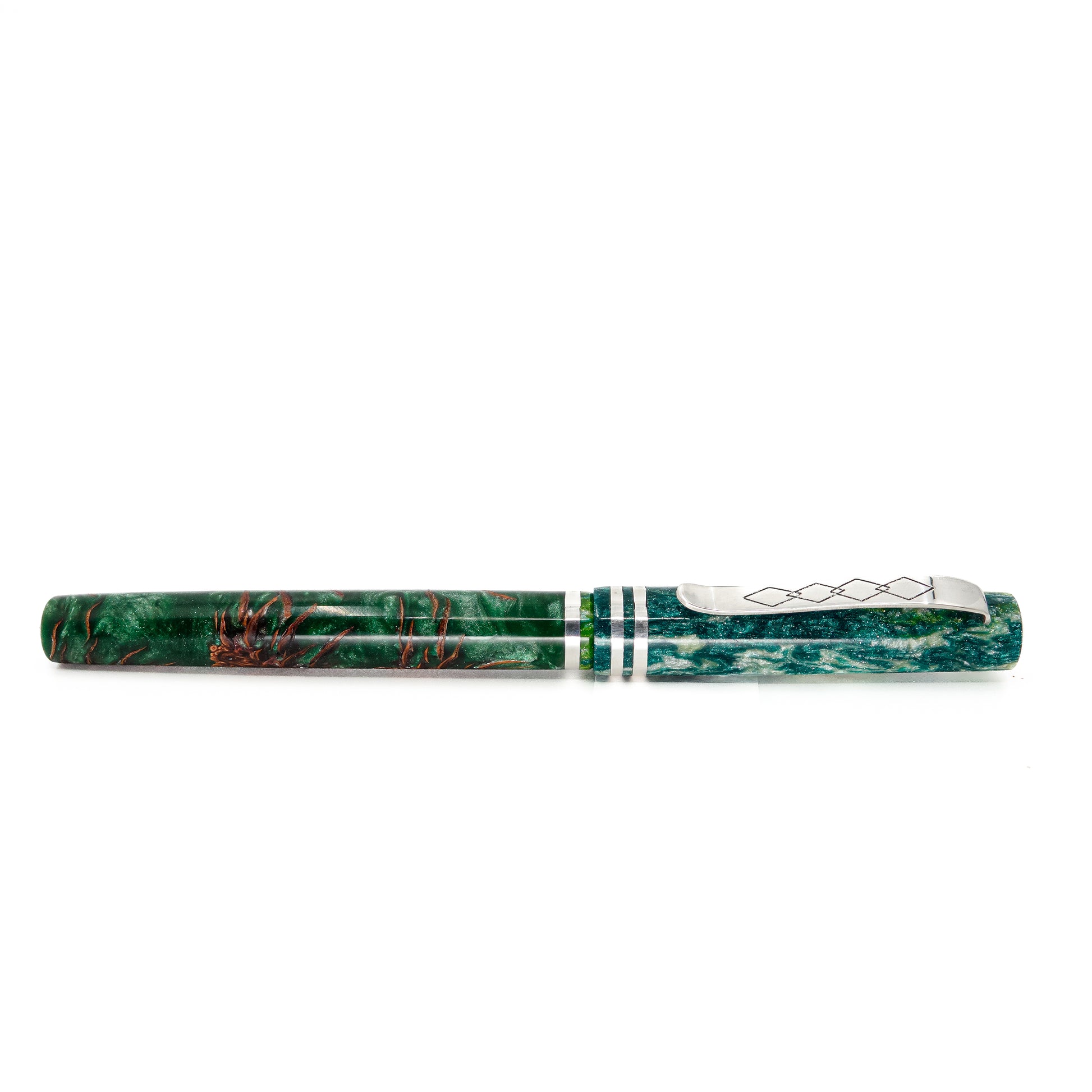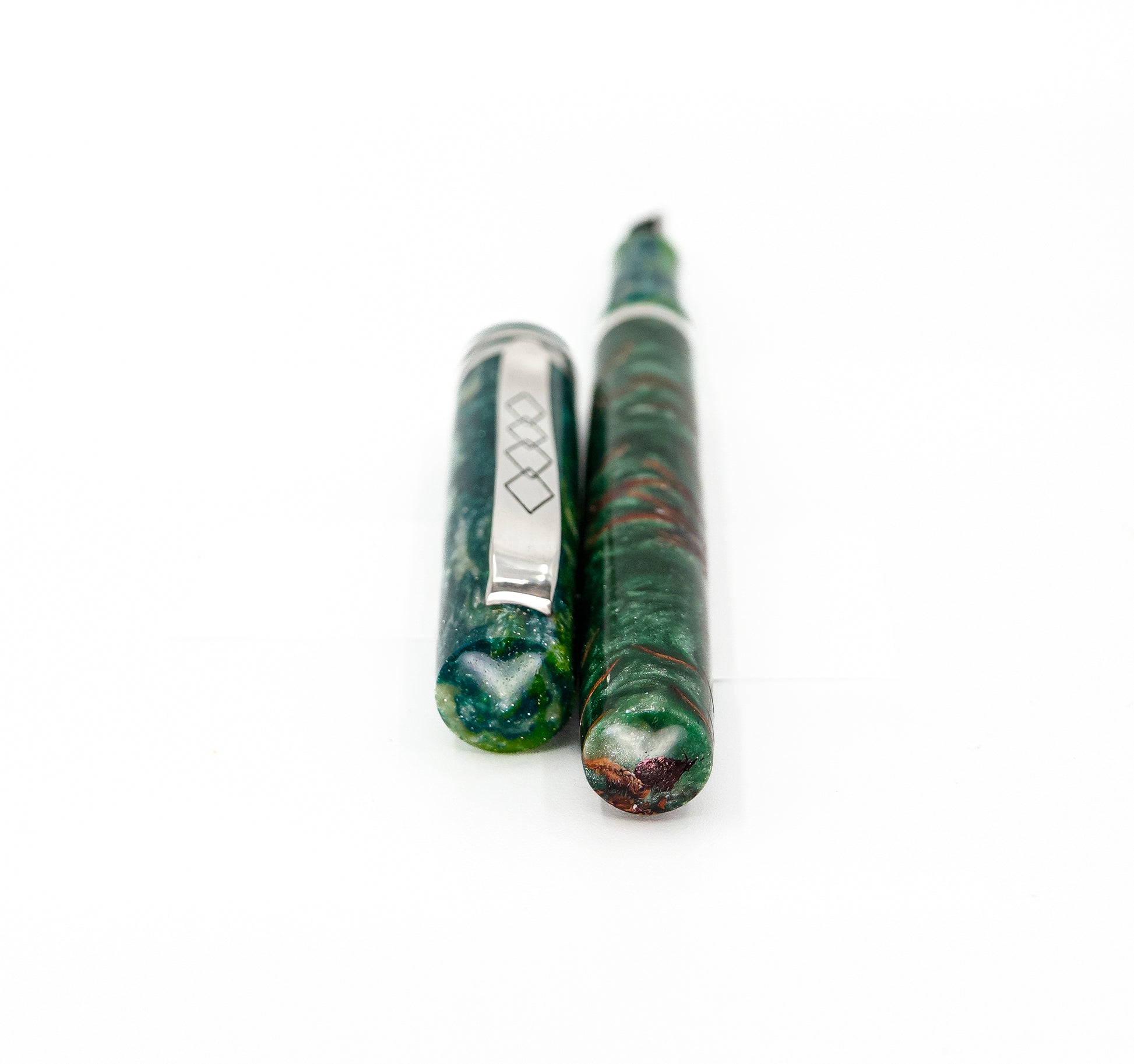 This Forest Green Pine cone Hybrid is a one of a kind, completely hand turned and polished to an ultra fine finish to show the amazing lustre achievable with this adorable material. Solid Argentium silver .935 is used to make the pen clip and accent rings, providing increased tarnish resistance, a whiter colour, antibacterial and hypoallergenic properties. It is fitted with a polished steel iridium tip Bock nib - medium size 6, and a K5 Premium ink converter refilling system. It can also be fitted with a range of different nib tip sizes and materials, Gold plate, Rose Gold plate, Two tone Gold plate, calligraphy nibs and solid gold.