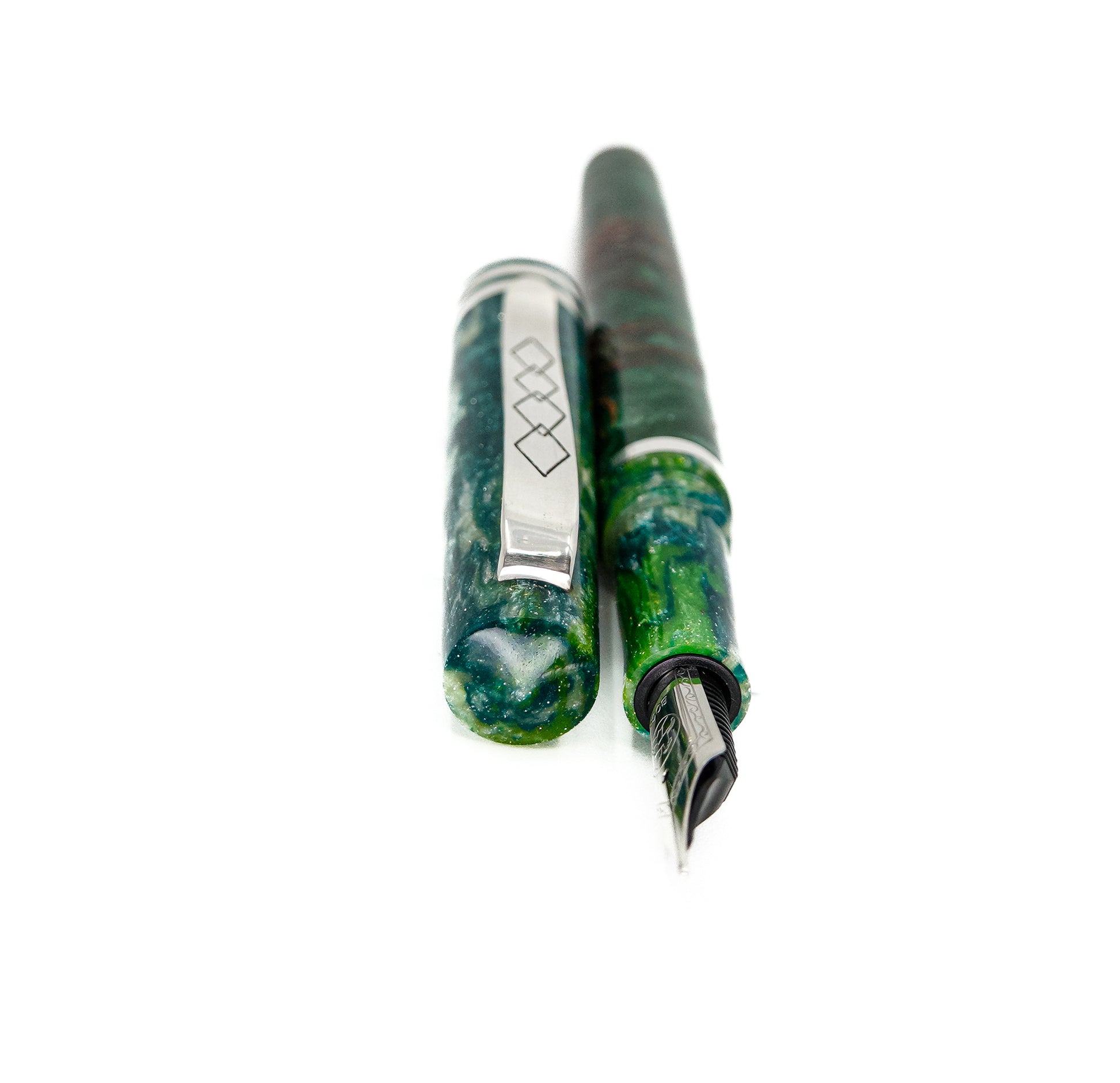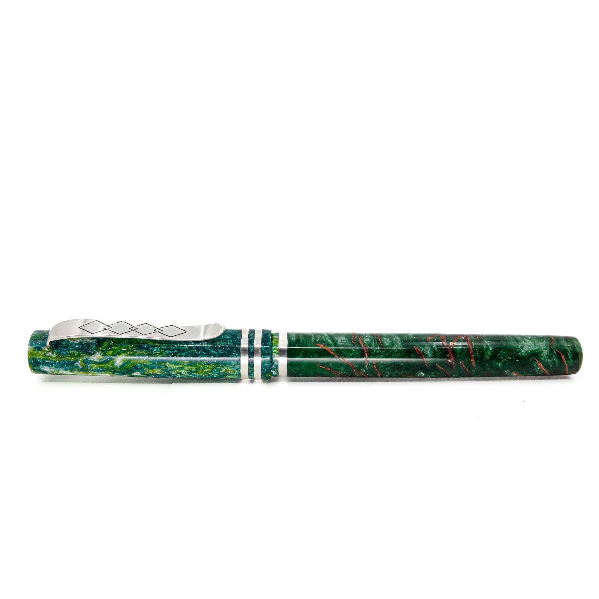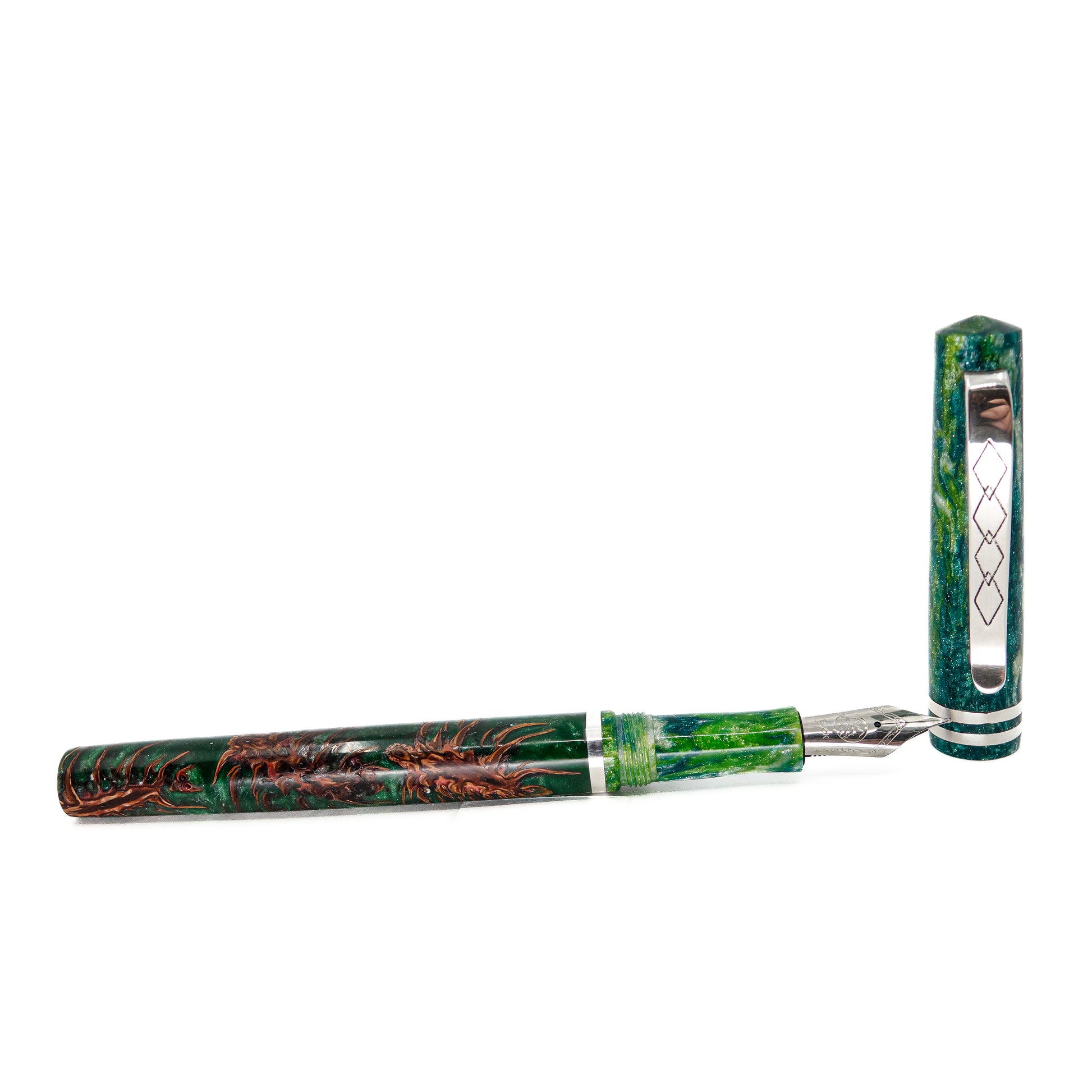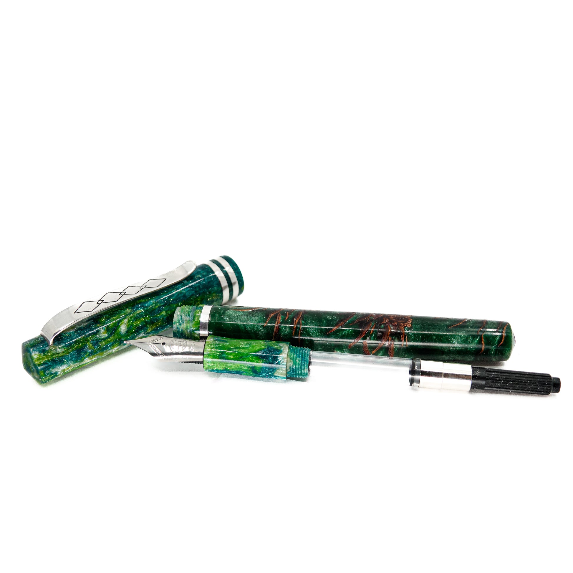 This Forest Green Pine cone Hybrid is a one of a kind, completely hand turned and polished to an ultra fine finish to show the amazing lustre achievable with this adorable material. Solid Argentium silver .935 is used to make the pen clip and accent rings, providing increased tarnish resistance, a whiter colour, antibacterial and hypoallergenic properties. It is fitted with a polished steel iridium tip Bock nib - medium size 6, and a K5 Premium ink converter refilling system. It can also be fitted with a range of different nib tip sizes and materials, Gold plate, Rose Gold plate, Two tone Gold plate, calligraphy nibs and solid gold.