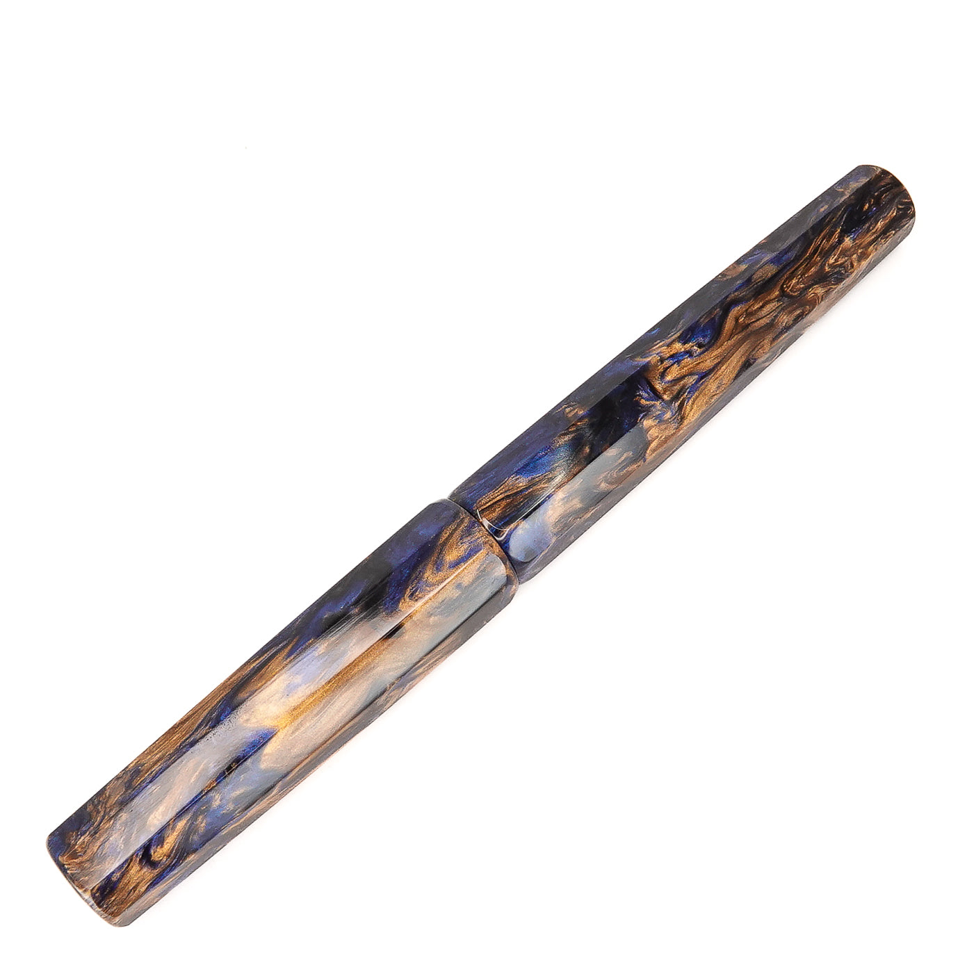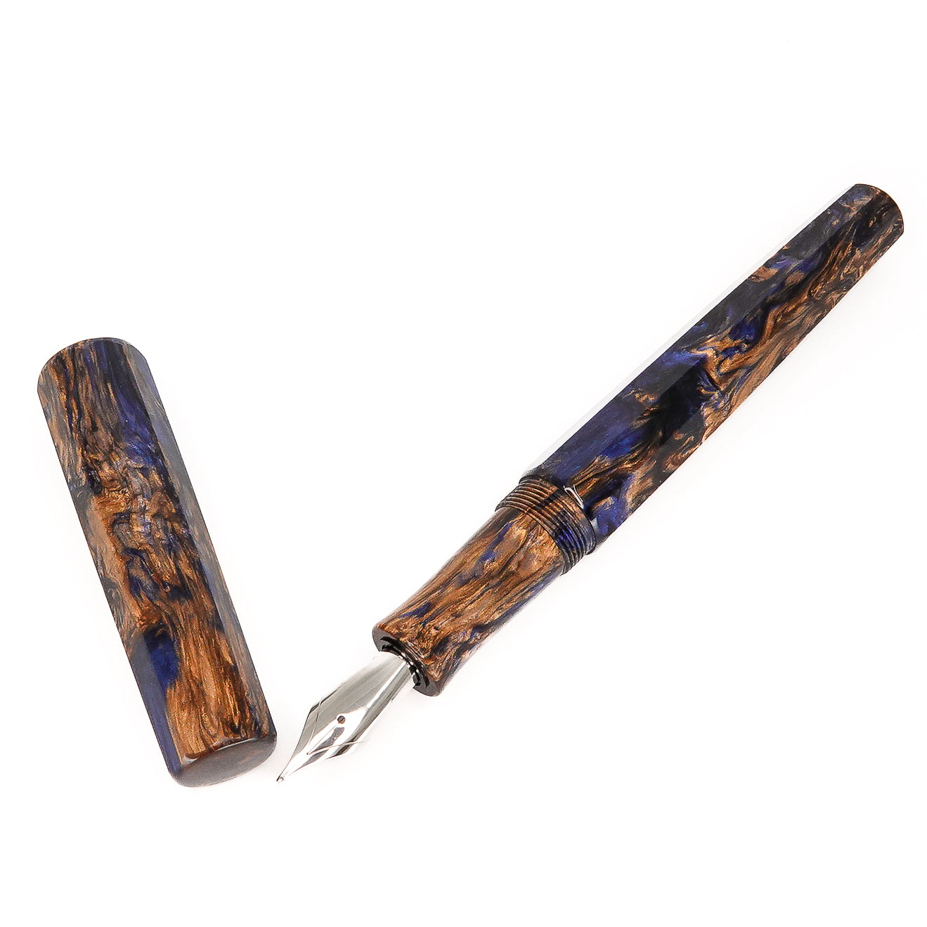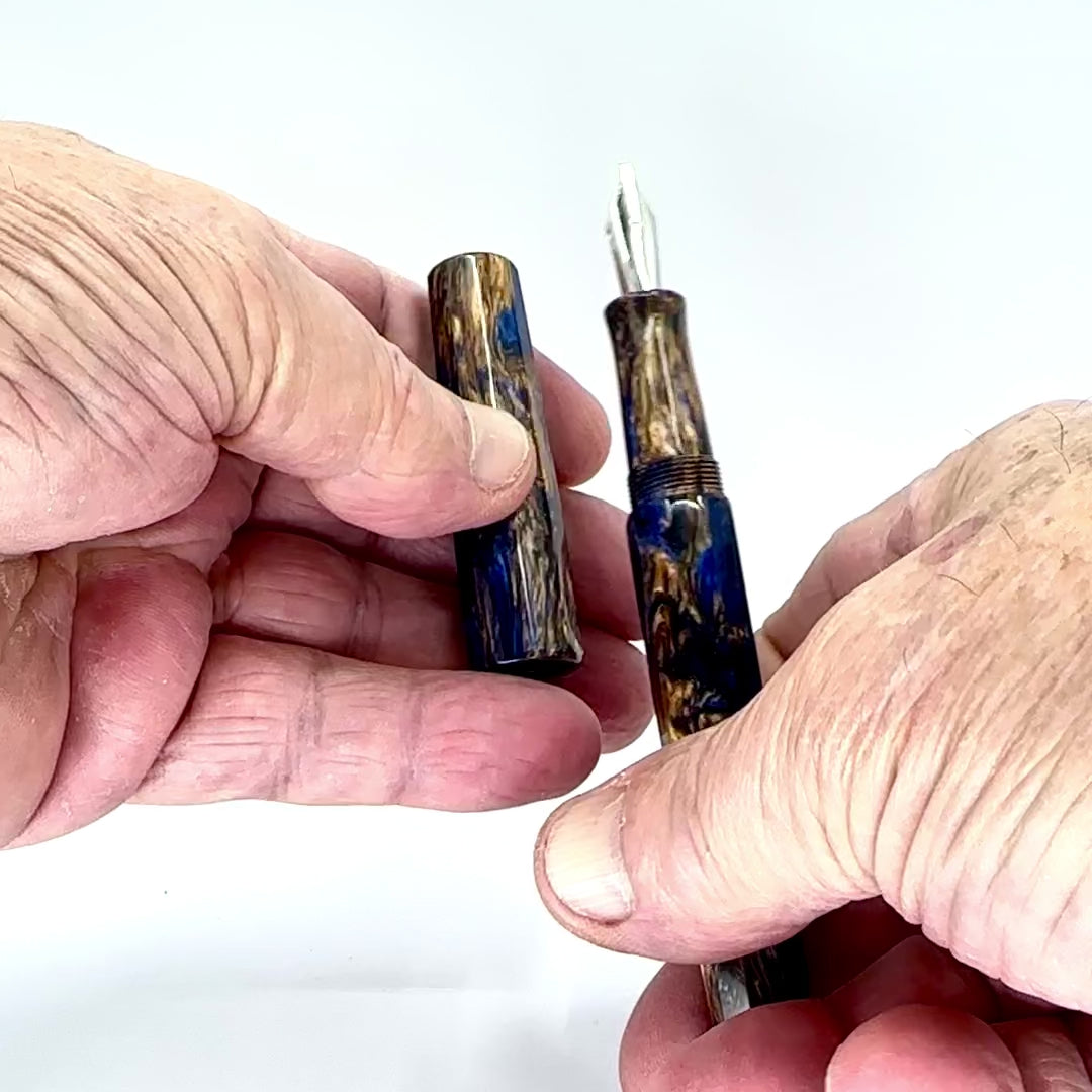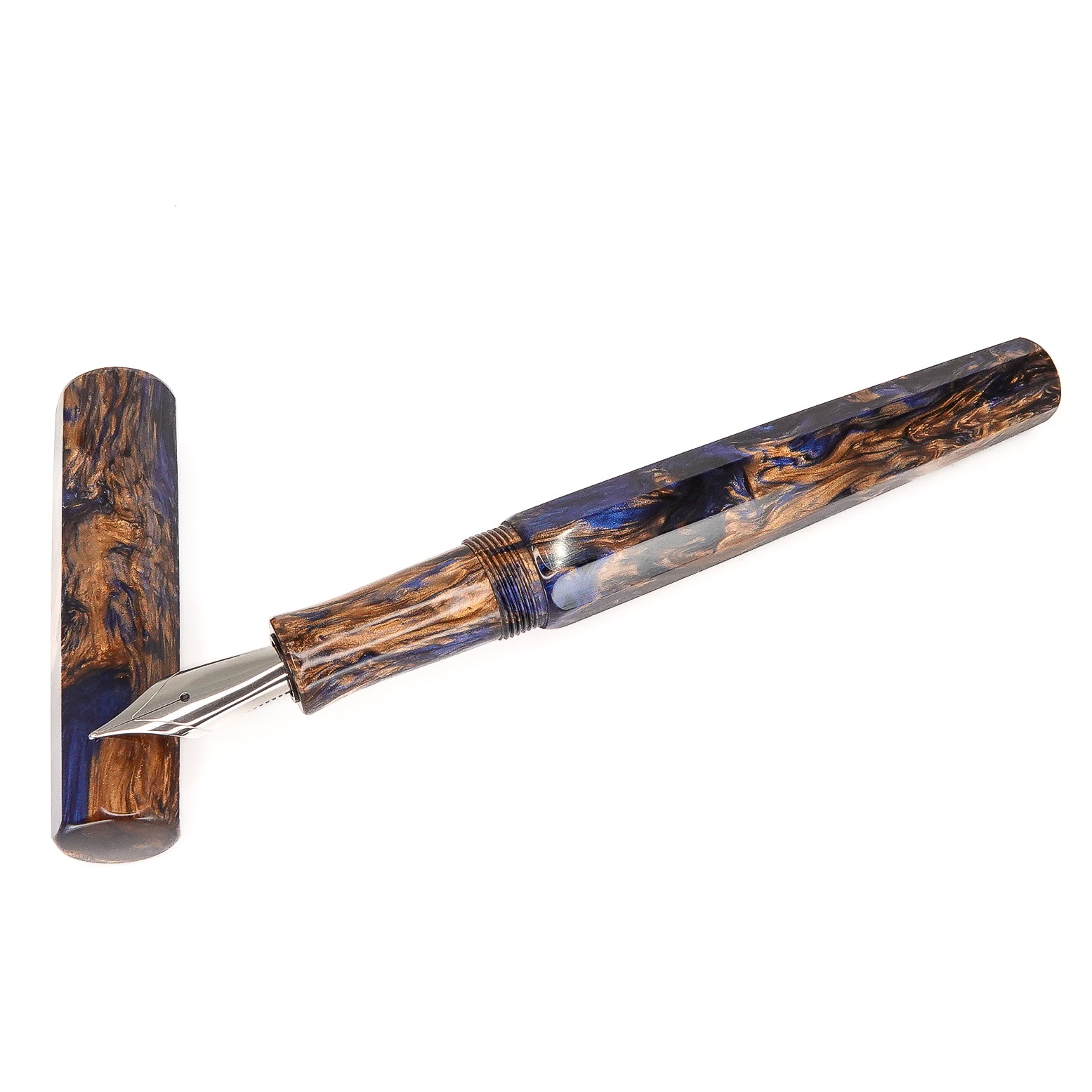 Golden blue Jay nine sided nonagon the pen has a convex taper to both the barrel and the cap, this series of pens were created to satisfy the discerning writer with a no frills pen that is not only comfortable in the hand but is also easy to slip into a pocket or bag but is equally at home sat on a desk, this range of pens come in various shapes and sizes all finished to a very high standard this pen is fitted with a size six Jowo nib and Schmidt K5 ink converter. Comes standard with a polished steel nib in the tip size of your choosing. Other nibs are available; please contact john@silverburlpens.com to discuss alternatives and prices. I`ll be pleased to offer advice.