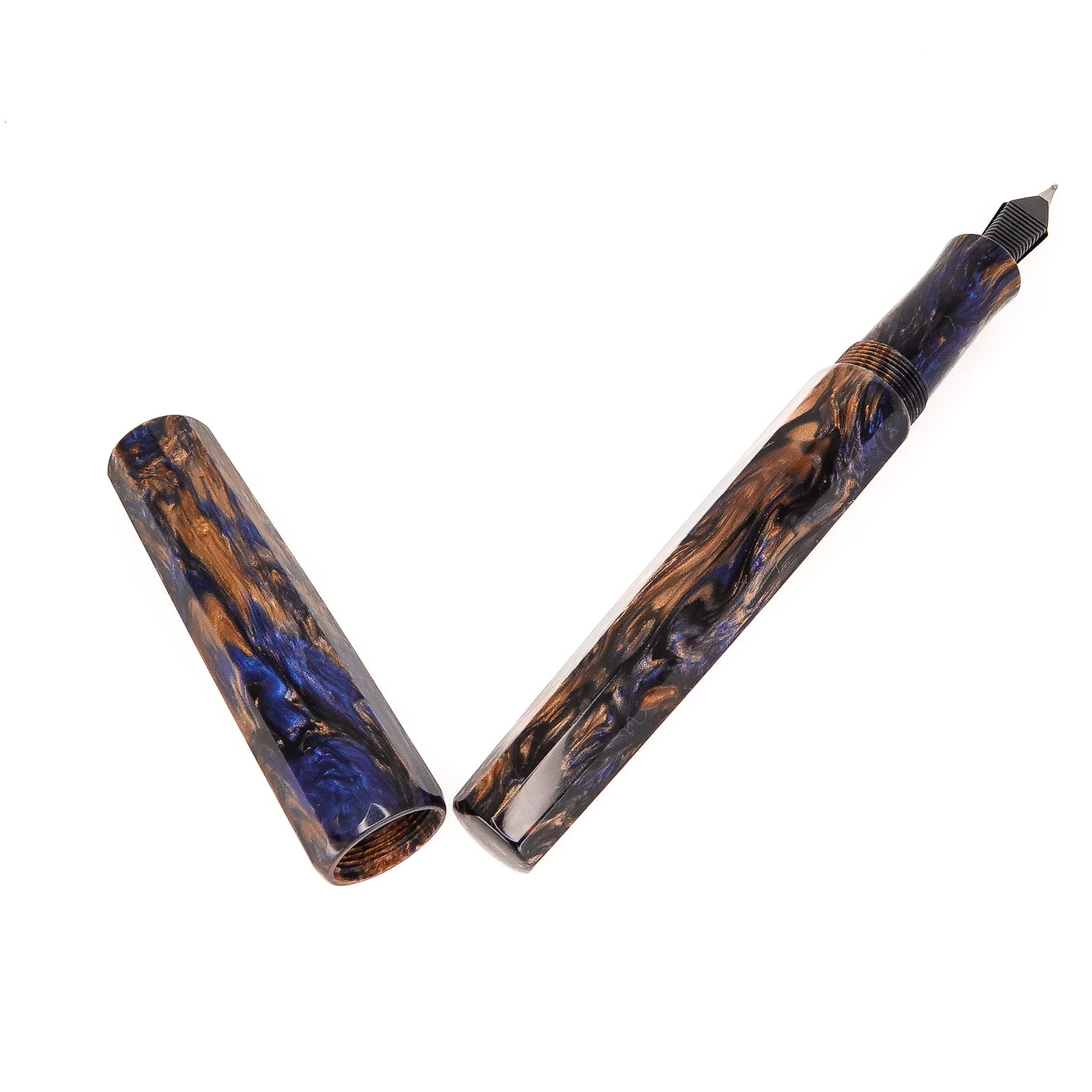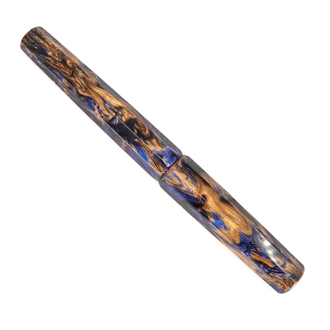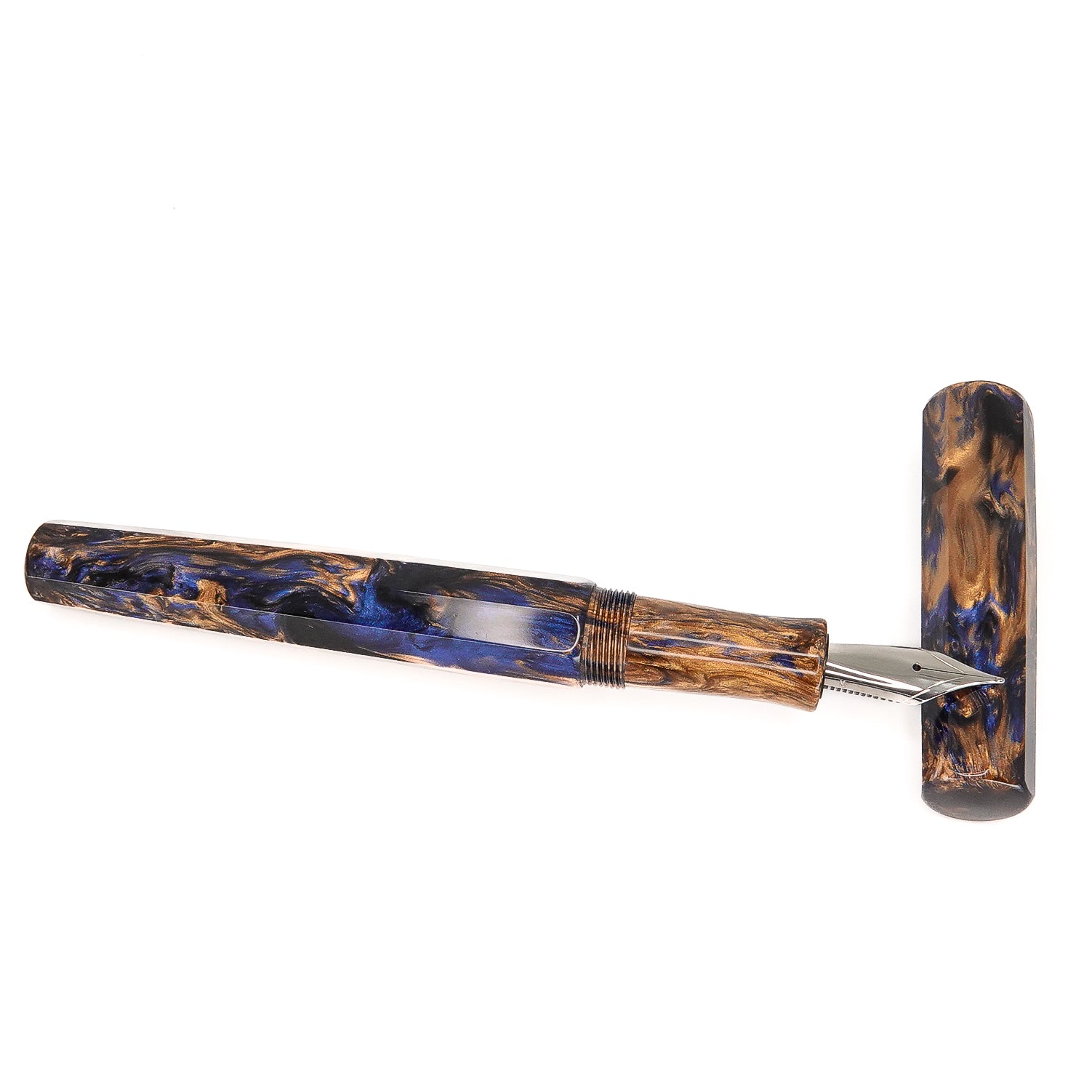 Golden blue Jay nine sided nonagon the pen has a convex taper to both the barrel and the cap, this series of pens were created to satisfy the discerning writer with a no frills pen that is not only comfortable in the hand but is also easy to slip into a pocket or bag but is equally at home sat on a desk, this range of pens come in various shapes and sizes all finished to a very high standard this pen is fitted with a size six Jowo nib and Schmidt K5 ink converter. Comes standard with a polished steel nib in the tip size of your choosing. Other nibs are available; please contact john@silverburlpens.com to discuss alternatives and prices. I`ll be pleased to offer advice.