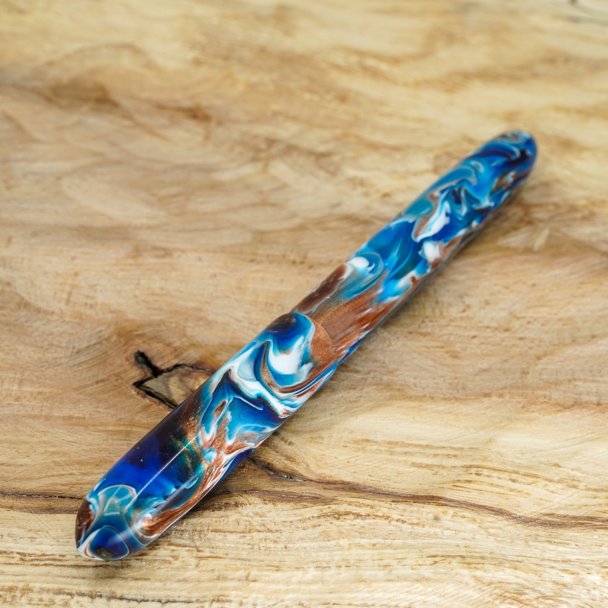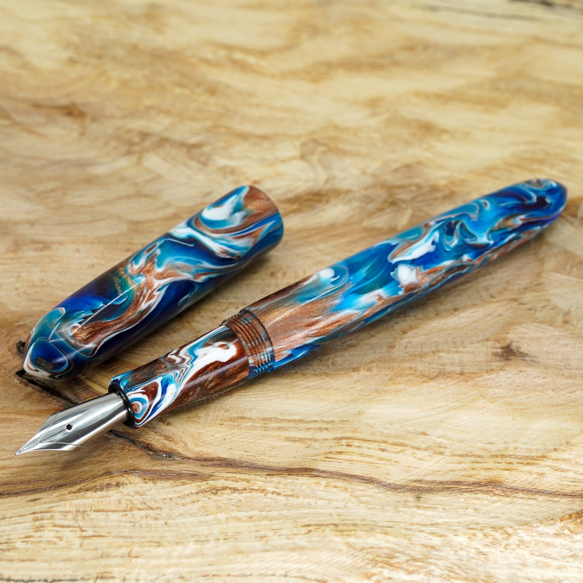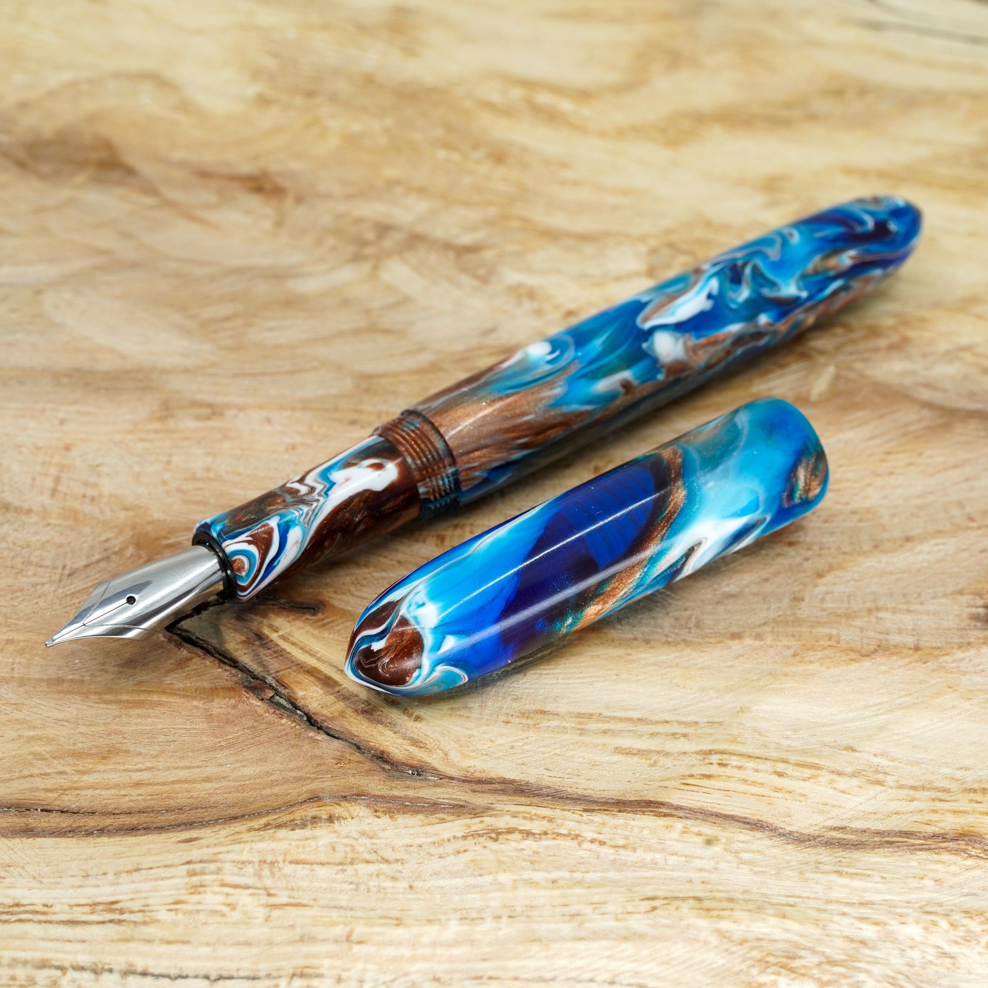 My Simply Elegant series of pens were created to satisfy the discerning writer with a no frills pen that is not only comfortable in the hand but is also easy to slip into a pocket or bag but is equally at home sat on a desk. Greek Isle, turned to a pointed rocket shape, fitted with a size six Jowo nib and Schmidt K5 ink converter. Comes as standard with a polished steel nib, your choice of tip size, other nibs available please contact to discus options and prices.