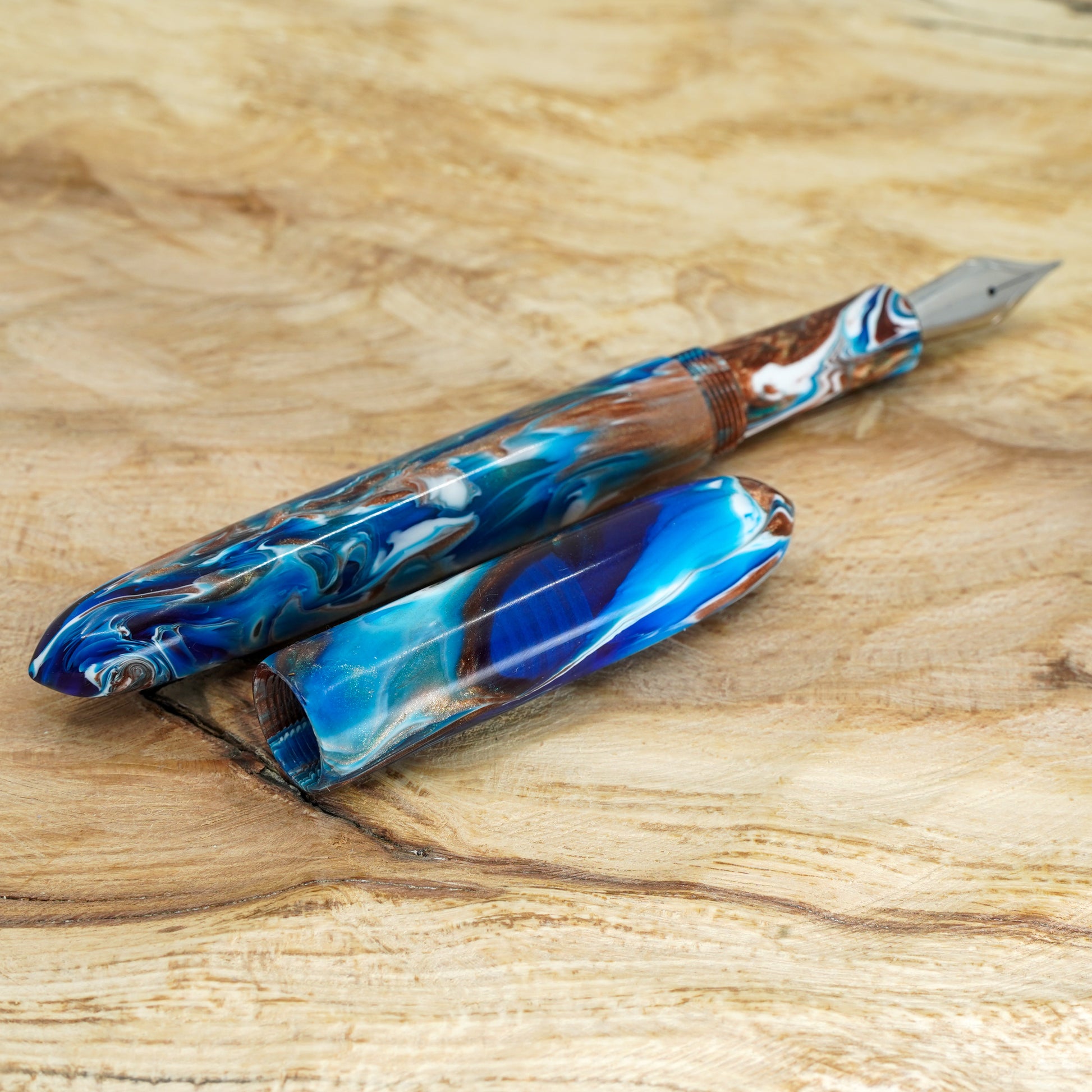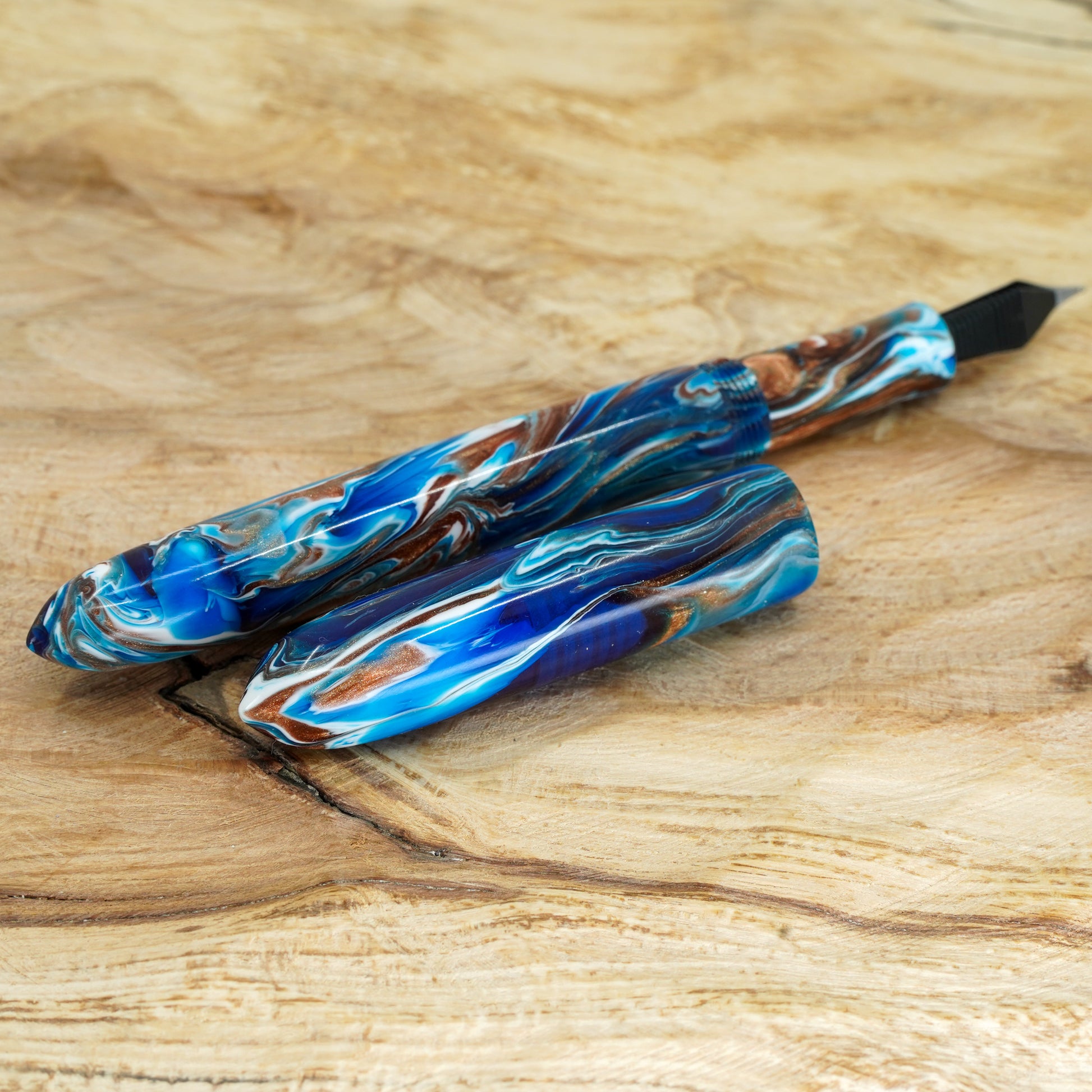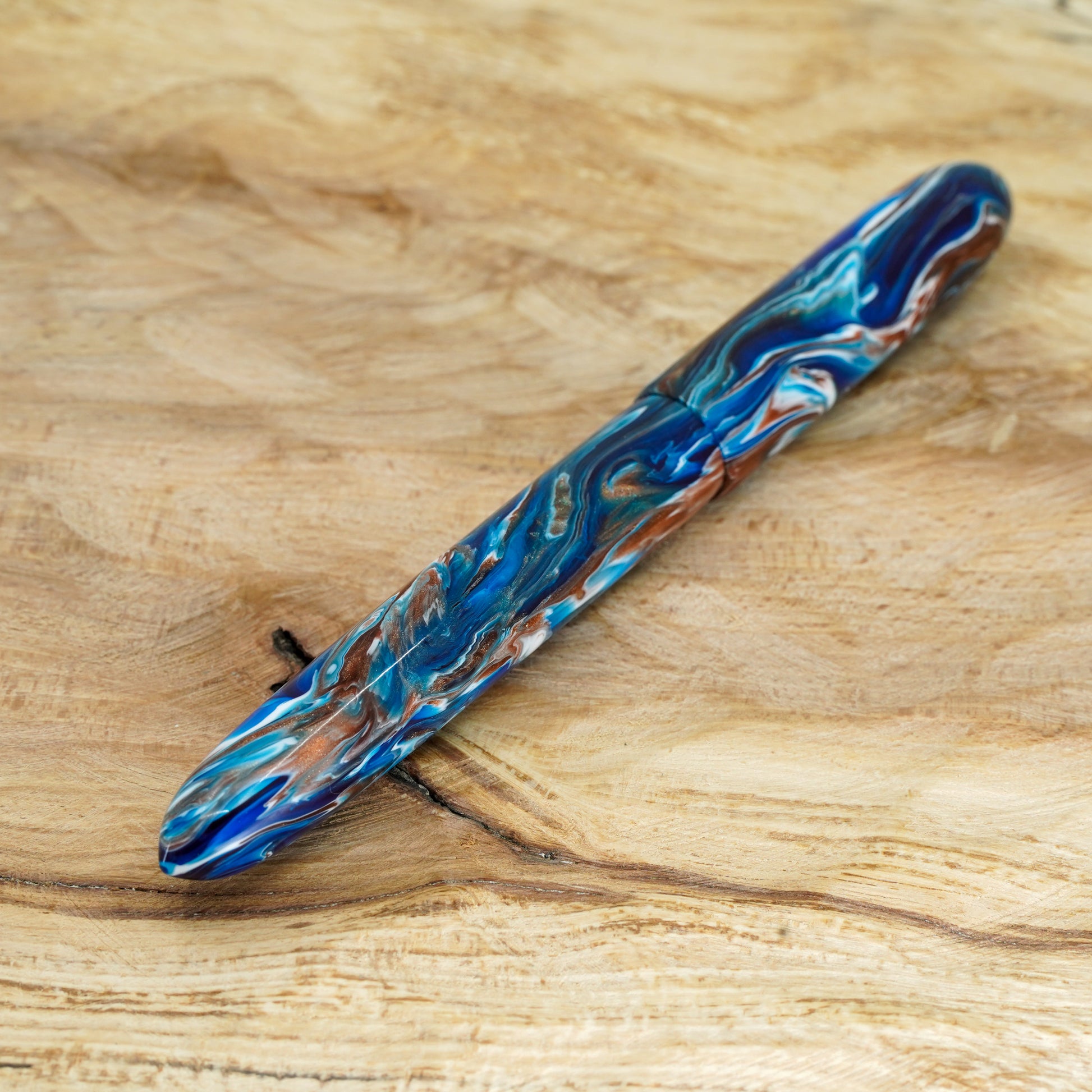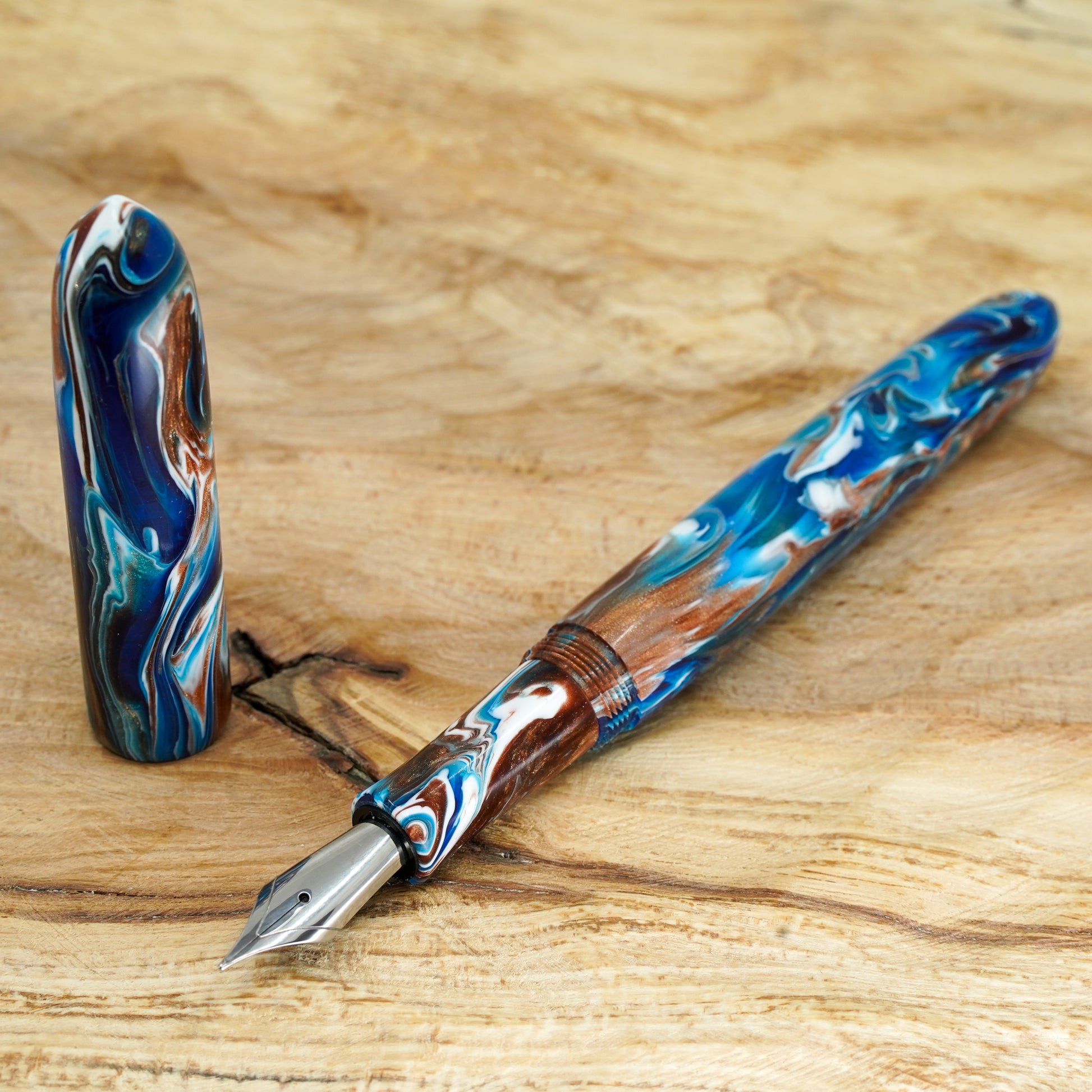 My Simply Elegant series of pens were created to satisfy the discerning writer with a no frills pen that is not only comfortable in the hand but is also easy to slip into a pocket or bag but is equally at home sat on a desk. Greek Isle, turned to a pointed rocket shape, fitted with a size six Jowo nib and Schmidt K5 ink converter. Comes as standard with a polished steel nib, your choice of tip size, other nibs available please contact to discus options and prices.