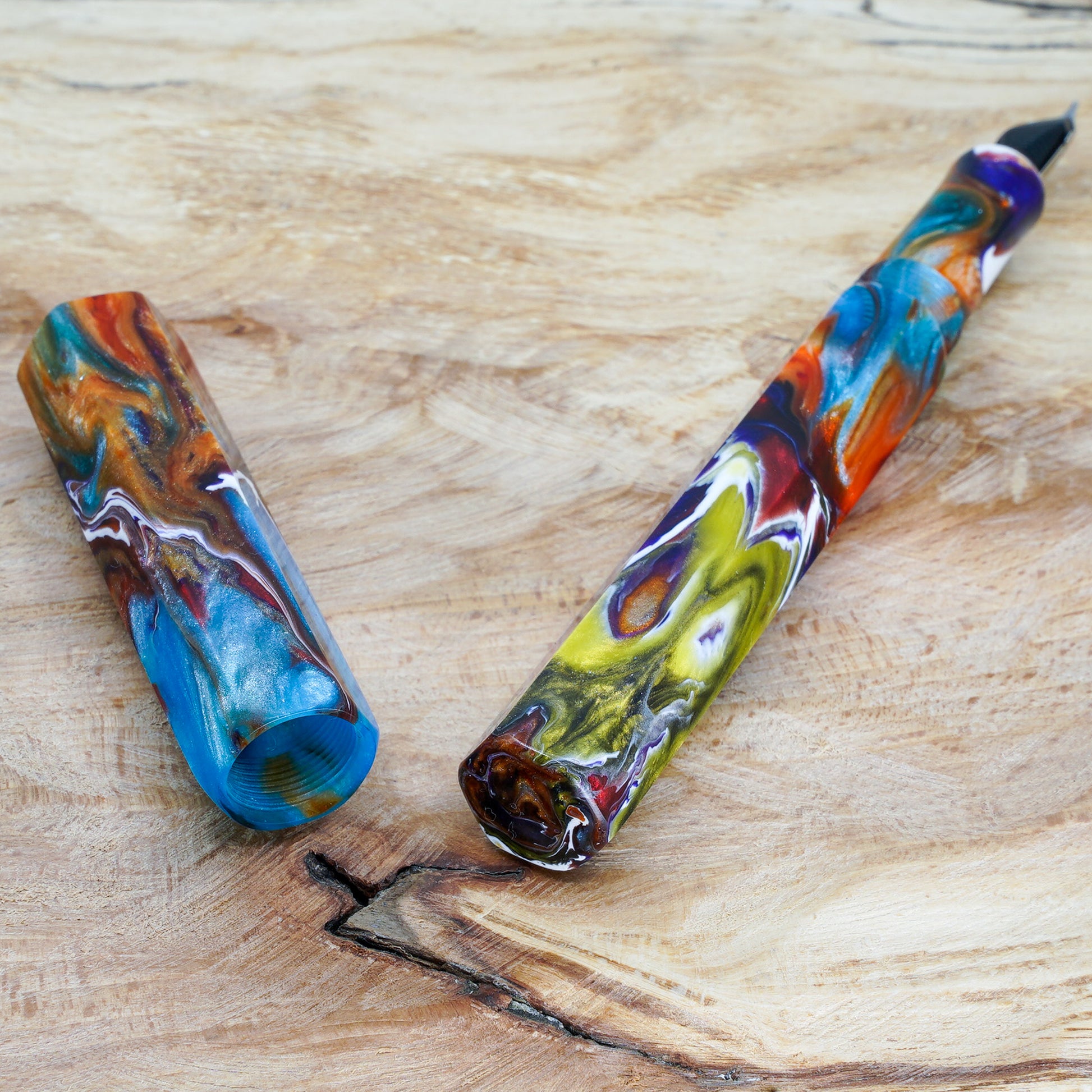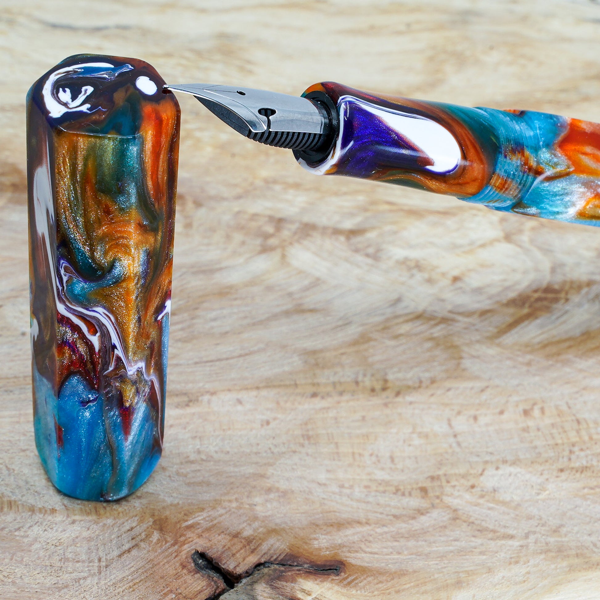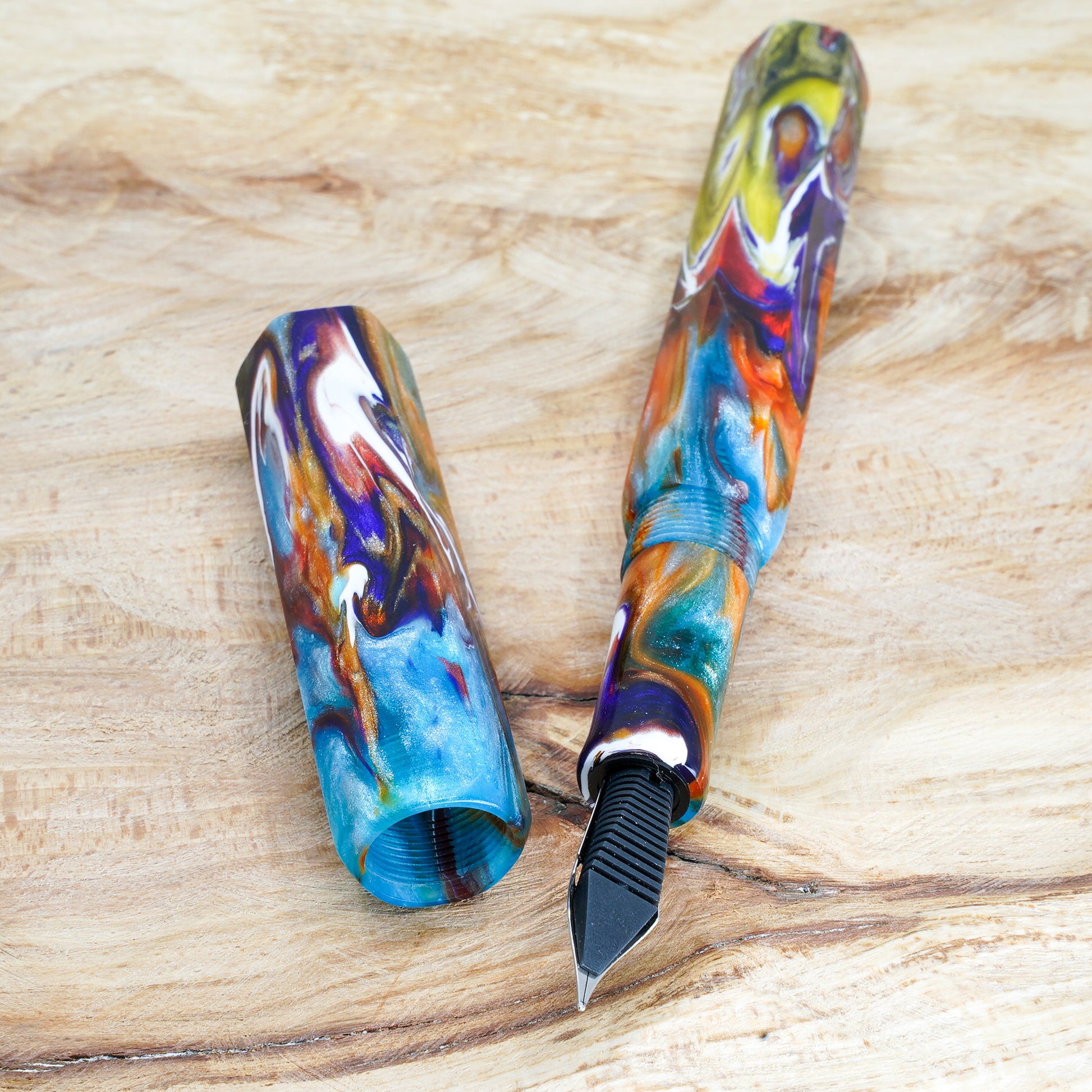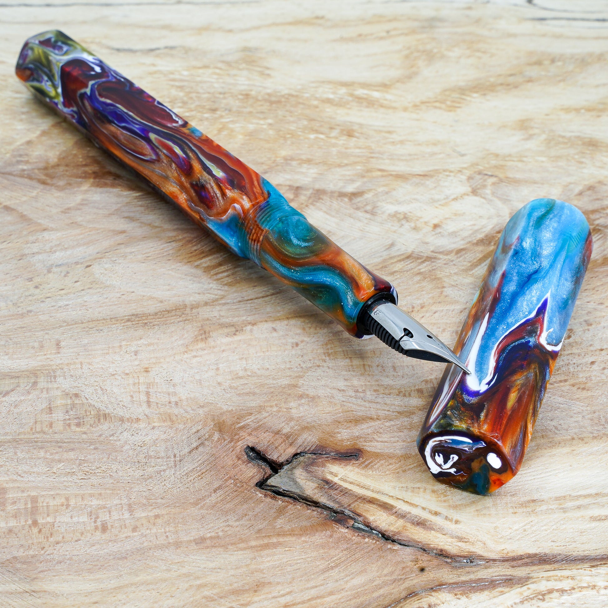 The Hexagon Bad Fish pen is a totally hand crafted pen with a polished steel Jowo nib size 6. It measures approximately 145m/m long including the cap, with a 135m/m nib to body end. The body diameter is 15m/m with a 13m/m thread, and the cap diameter is 16m/m. It comes with any nib tip size and a Schmidt K5 ink converter. Other nibs are available; please contact us to discuss alternatives and prices. We'll be pleased to offer advice.