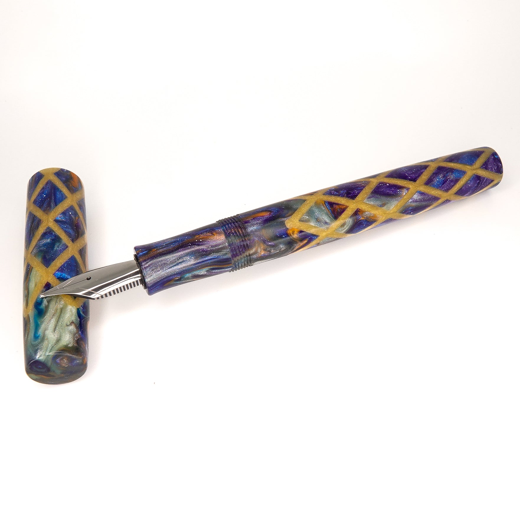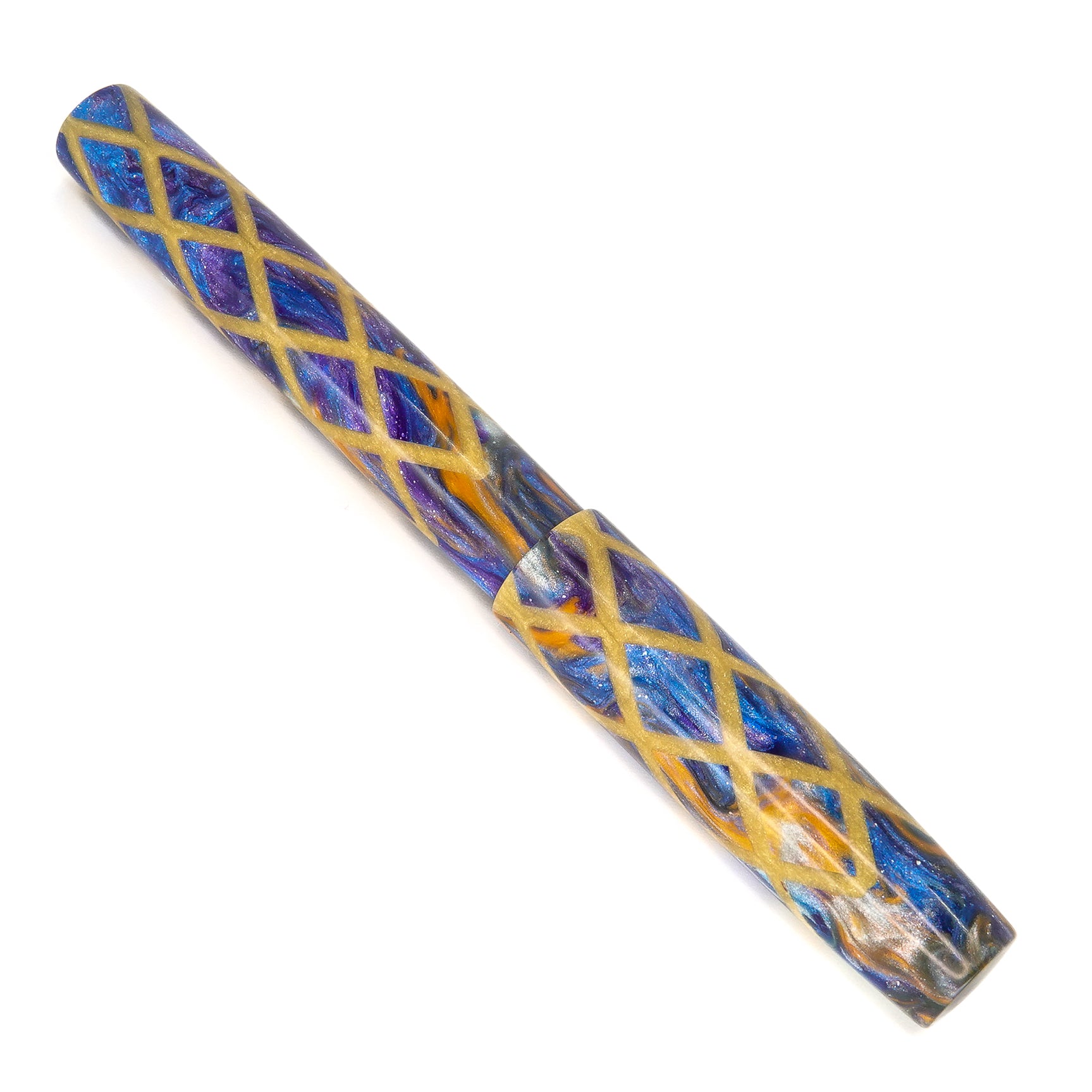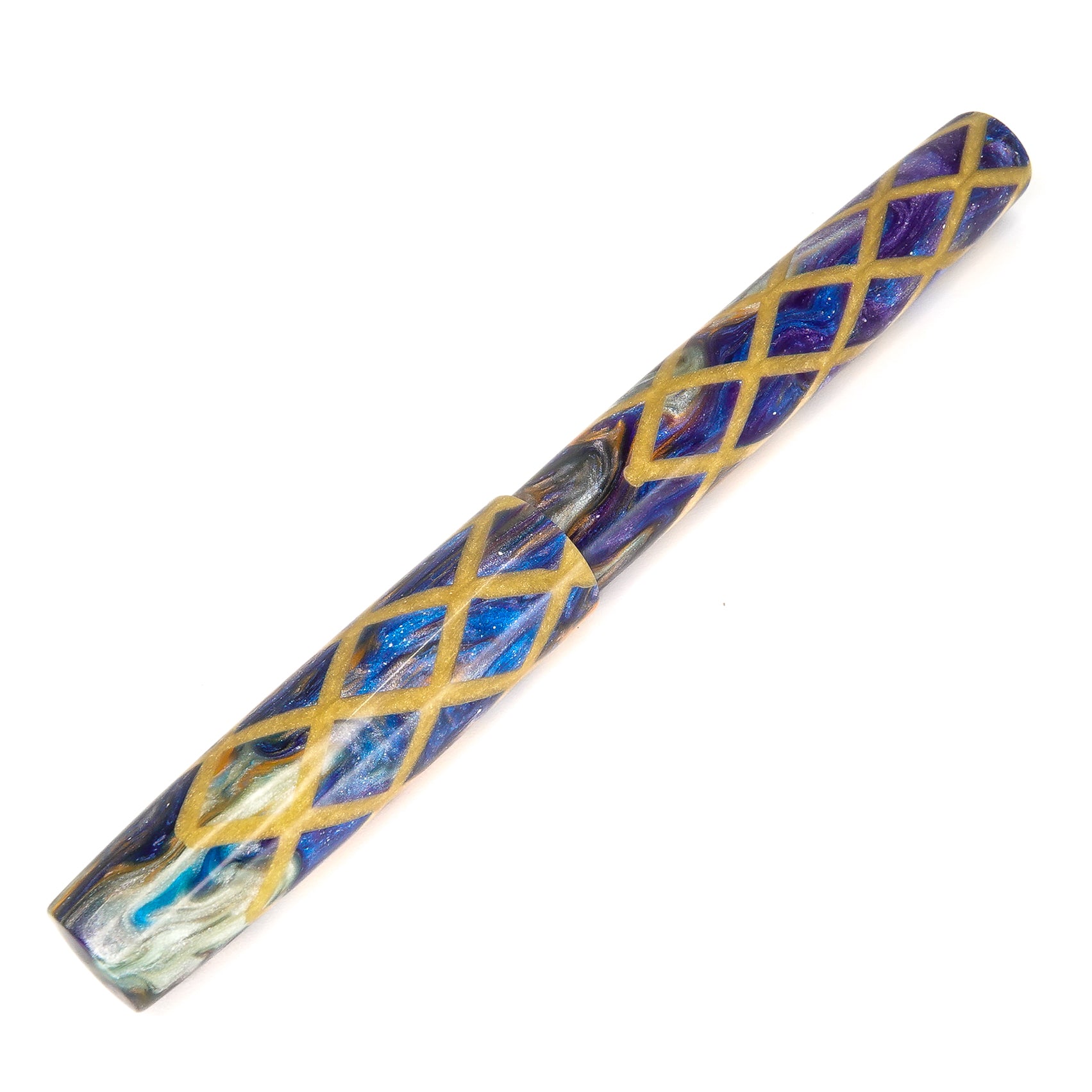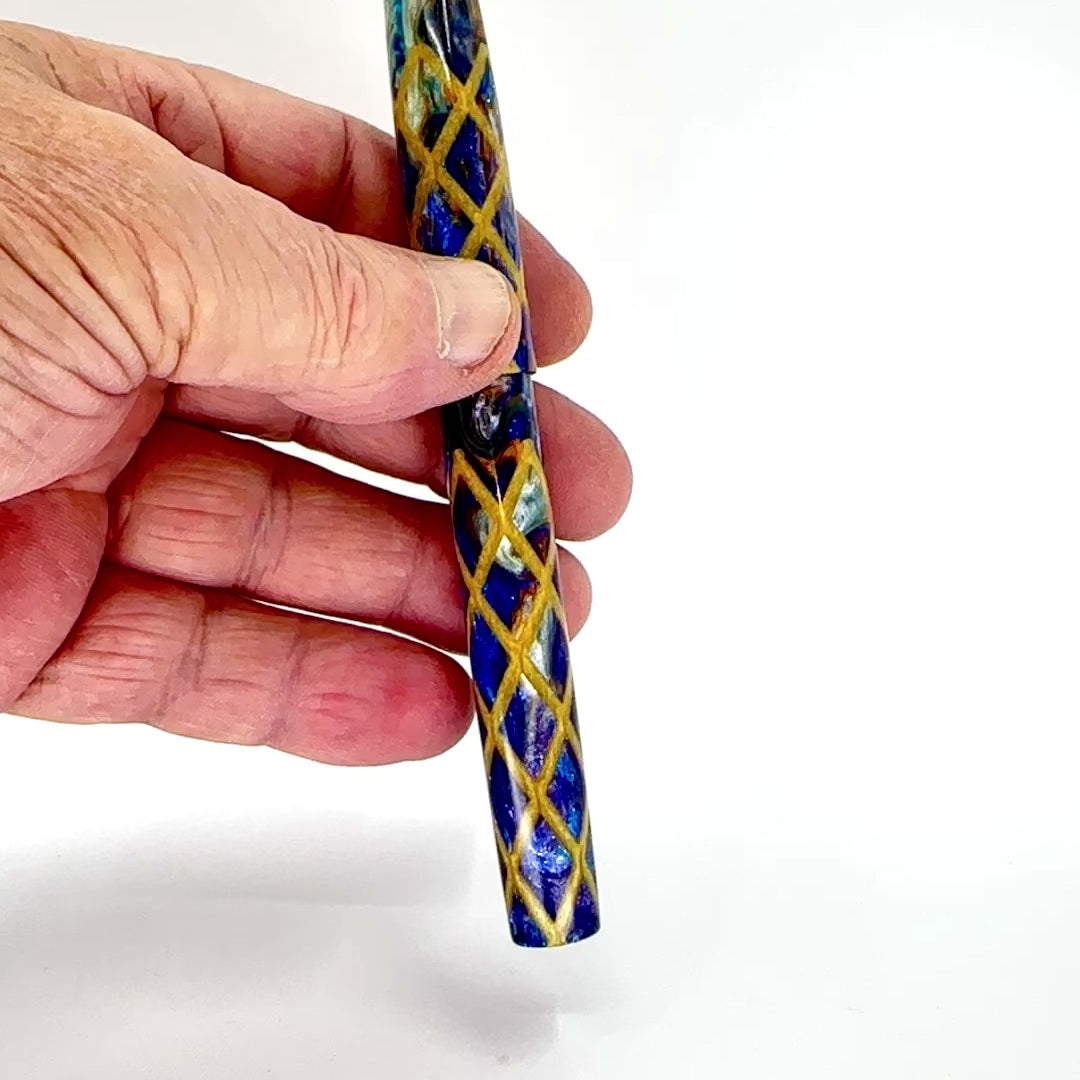 Honey Badger Harlequin is a stepless 14mm fountain pen from the Simply Elegant series by Silver Burl Pens. This pen is designed for the discerning writer who values comfort and functionality. It is compact enough to fit into a pocket or bag, but also looks elegant on a desk. The pen comes in various shapes and sizes, all finished to a high standard. The A Galaxy Beyond model is fitted with a size six Jowo nib and Schmidt K5 ink converter, and comes with a polished steel nib in the tip size of your choosing.