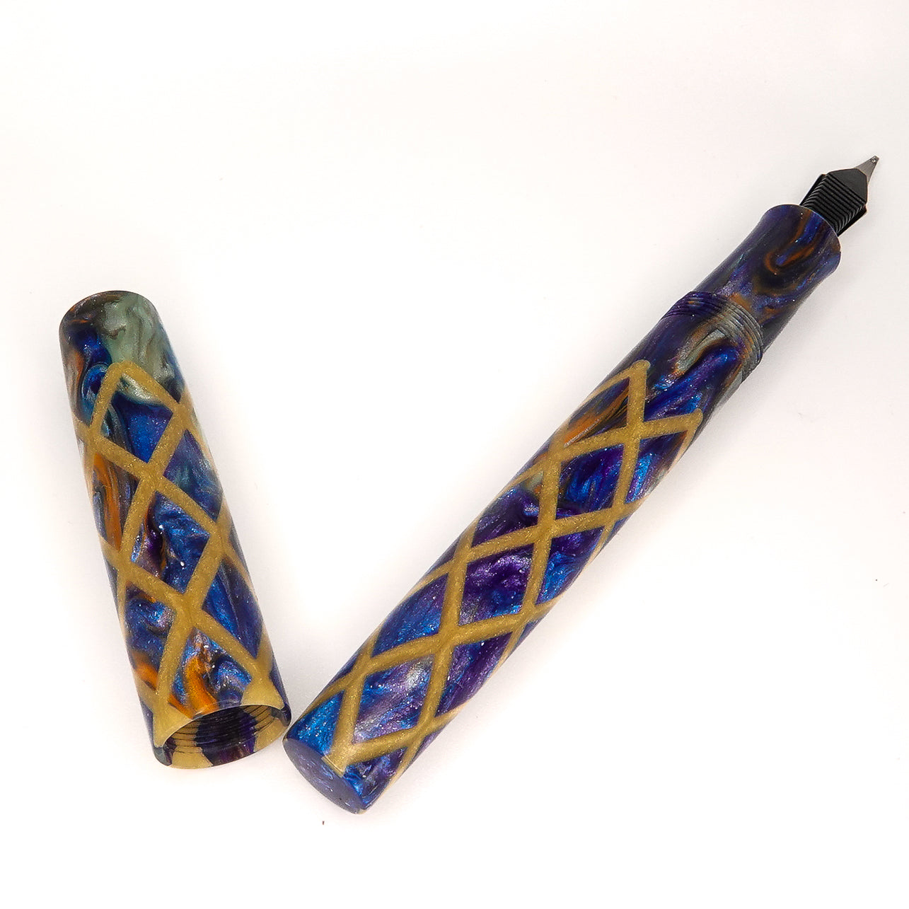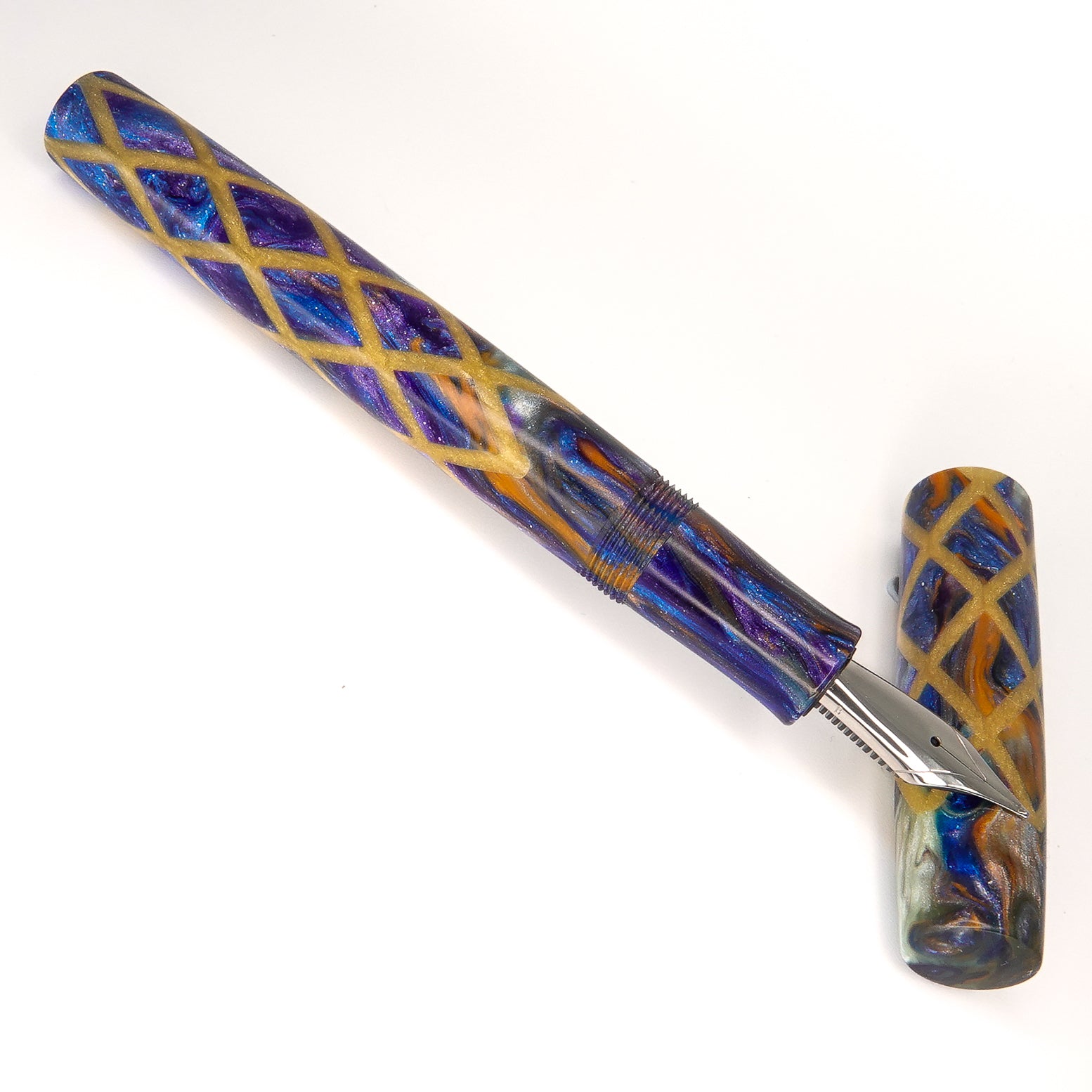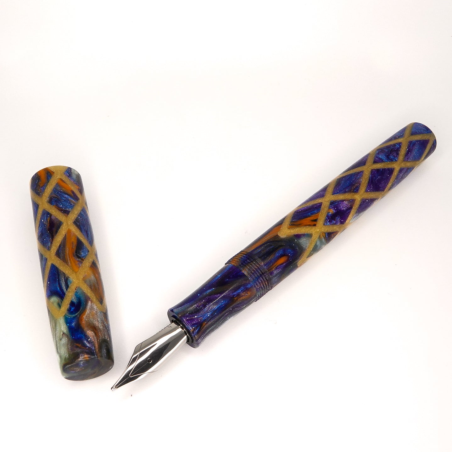 Honey Badger Harlequin is a stepless 14mm fountain pen from the Simply Elegant series by Silver Burl Pens. This pen is designed for the discerning writer who values comfort and functionality. It is compact enough to fit into a pocket or bag, but also looks elegant on a desk. The pen comes in various shapes and sizes, all finished to a high standard. The A Galaxy Beyond model is fitted with a size six Jowo nib and Schmidt K5 ink converter, and comes with a polished steel nib in the tip size of your choosing.