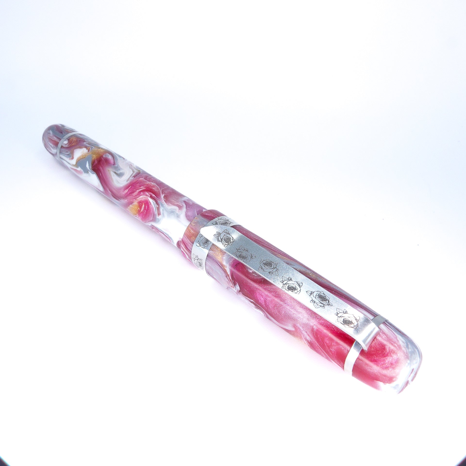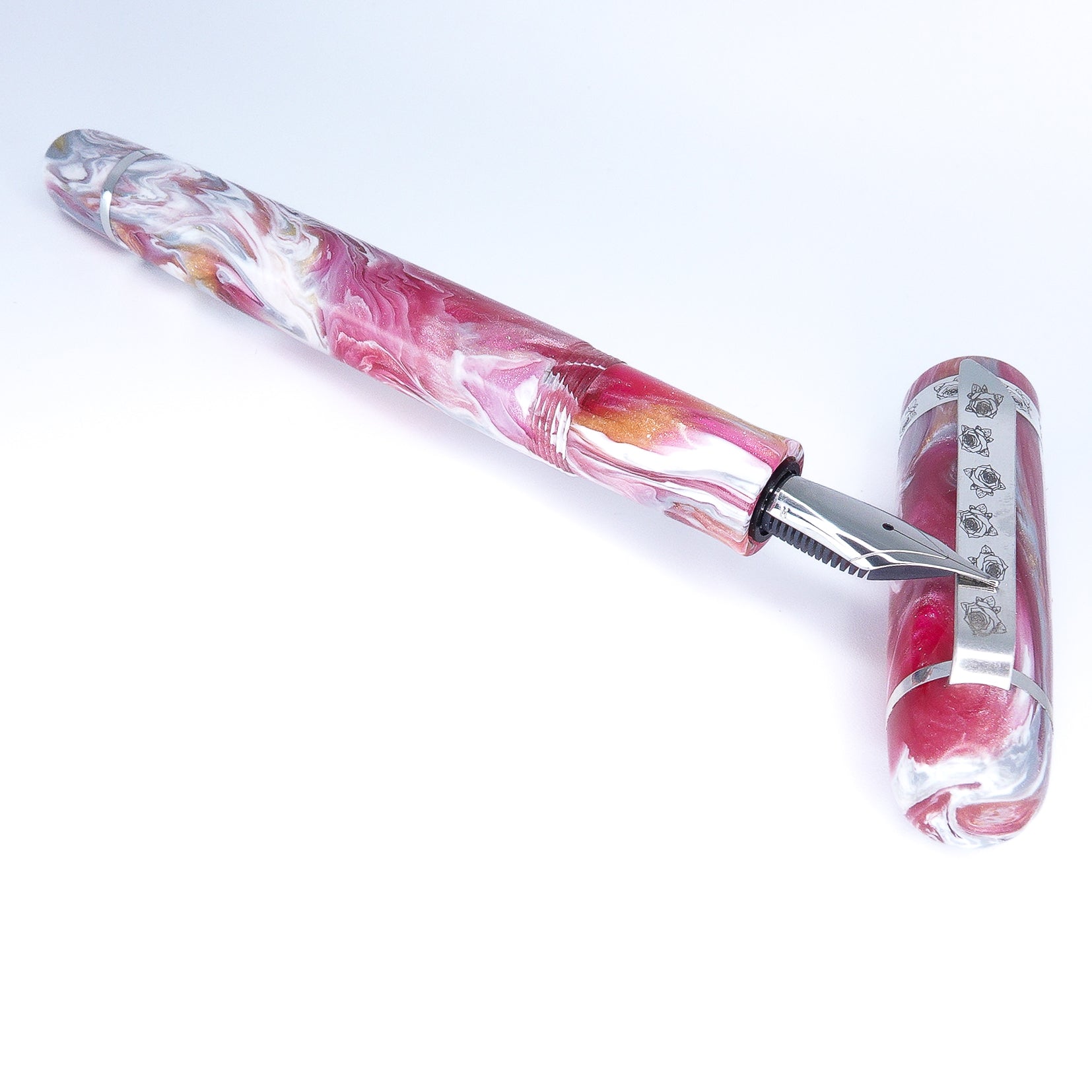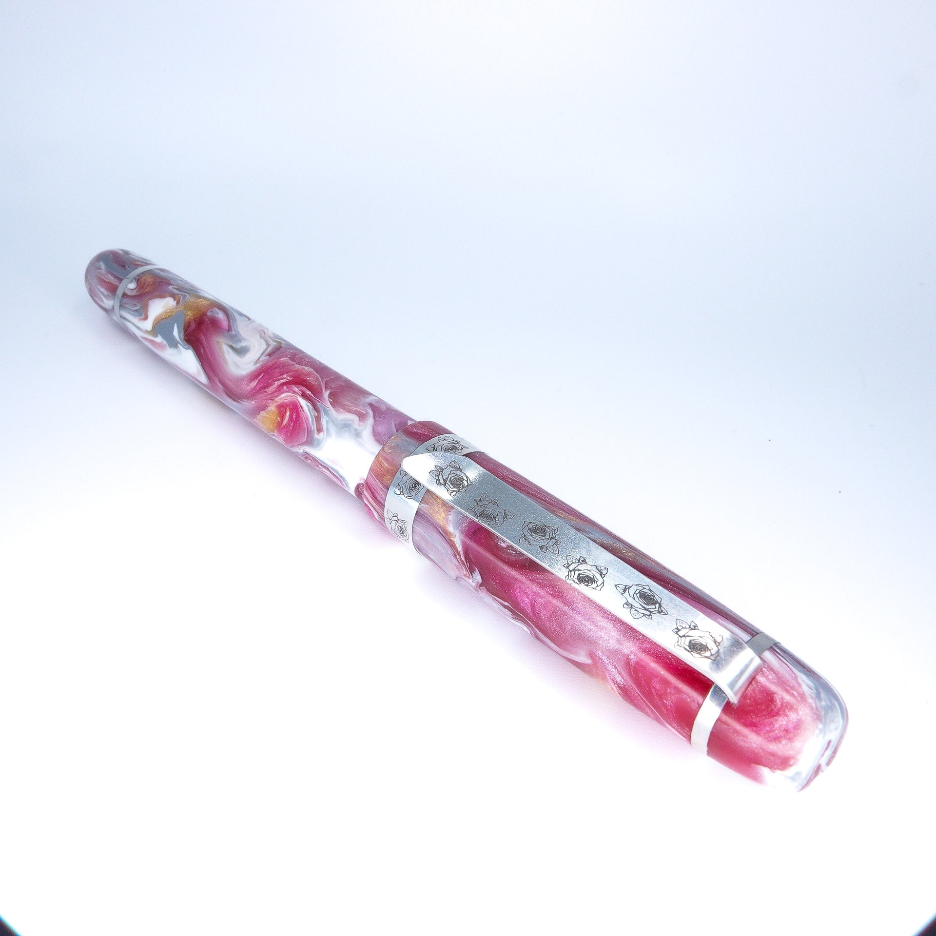 Inca Rose from Silverburlpens is a totally hand crafted pen, made from material created by the Carolina pen co, It is fitted with a polished steel Jowo nib size 6, and comes with any nib tip size and Schmidt K5 ink converter. Other nibs are available upon request.