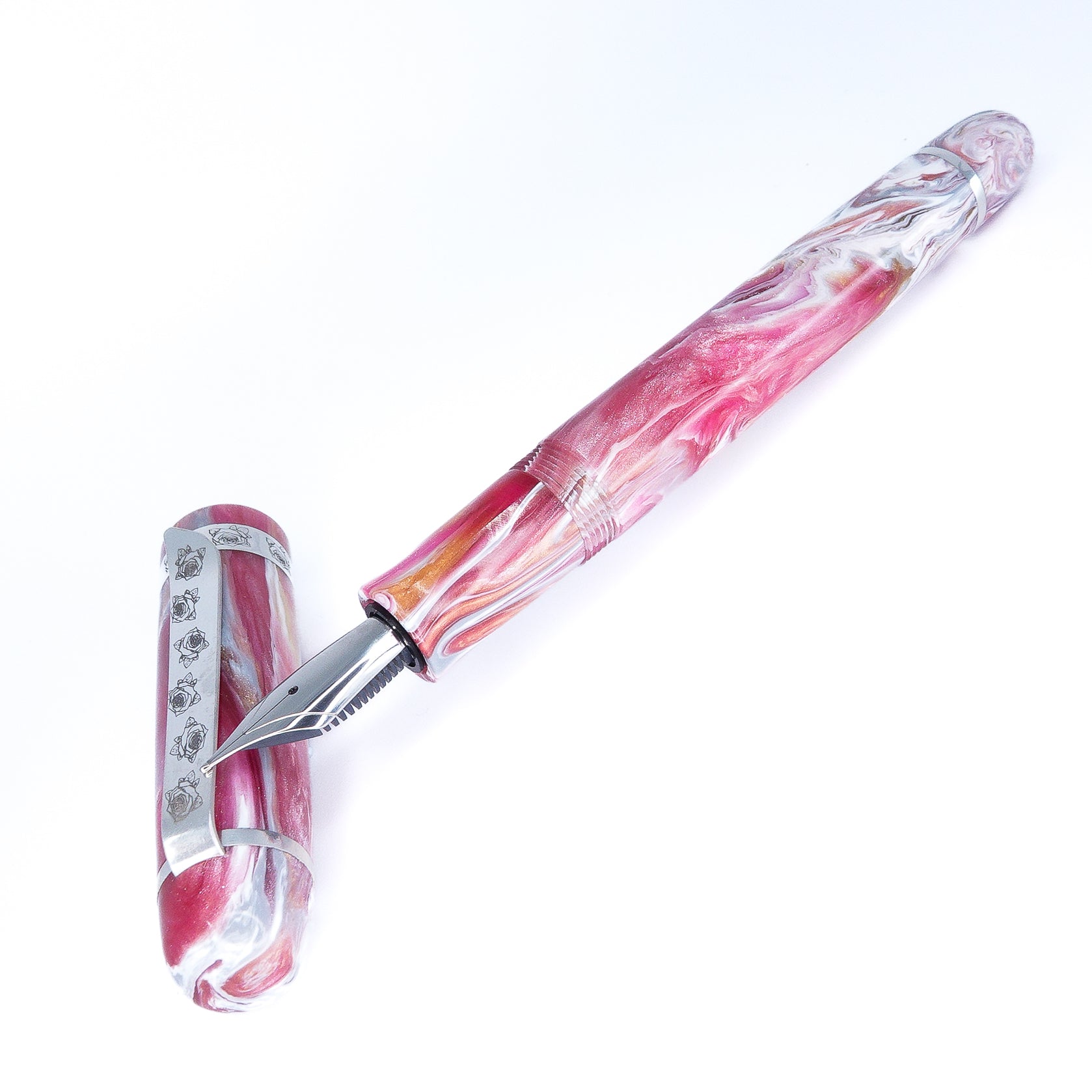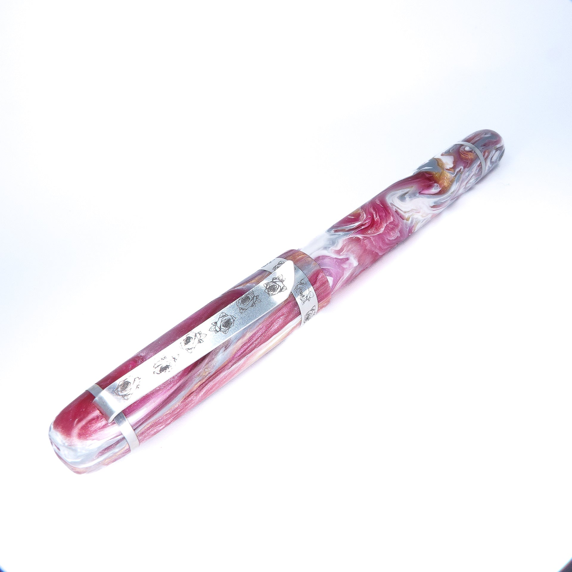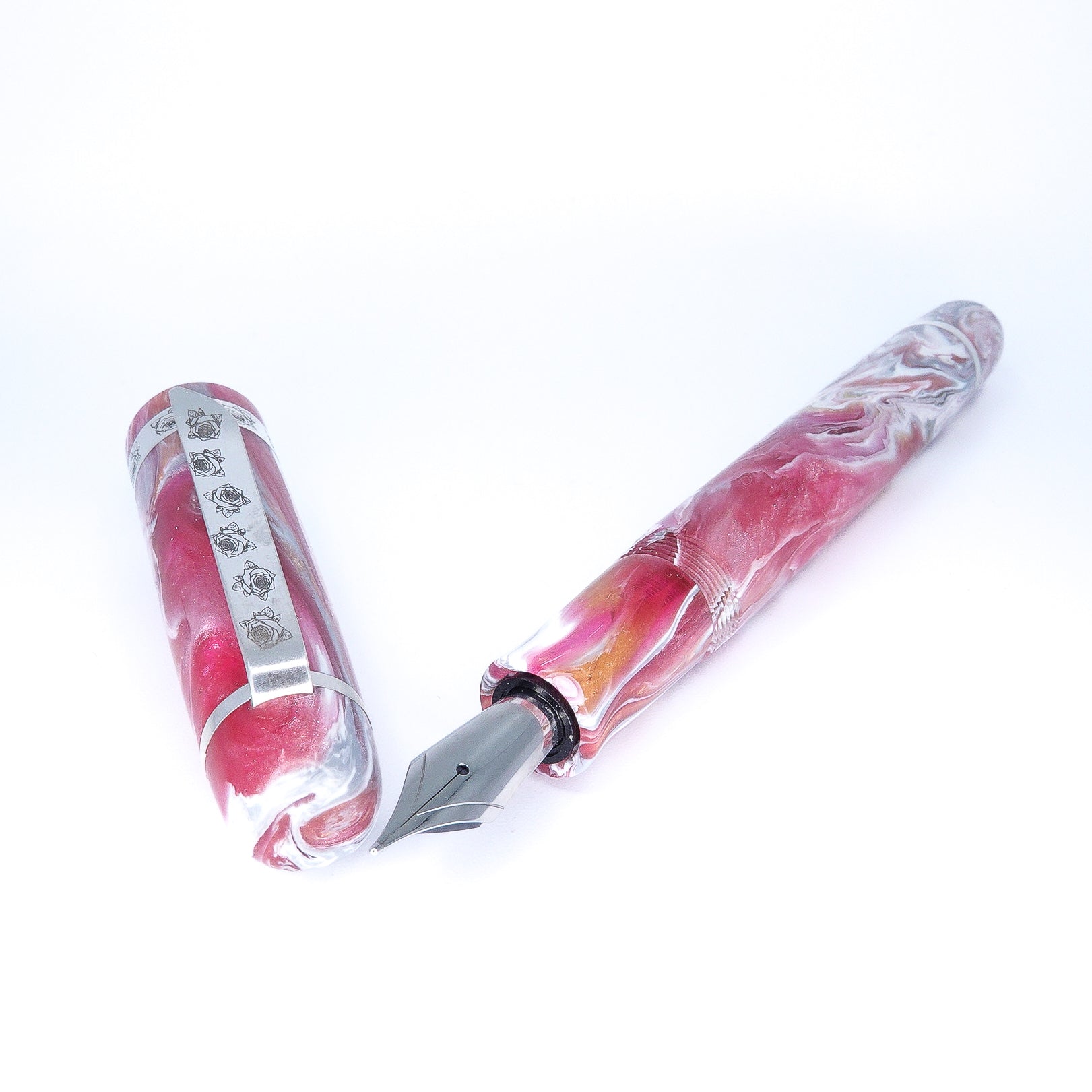 Inca Rose from Silverburlpens is a totally hand crafted pen, made from material created by the Carolina pen co, It is fitted with a polished steel Jowo nib size 6, and comes with any nib tip size and Schmidt K5 ink converter. Other nibs are available upon request.