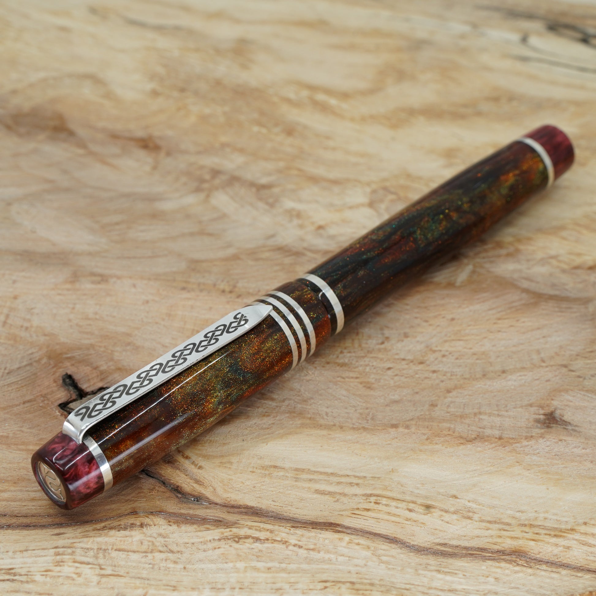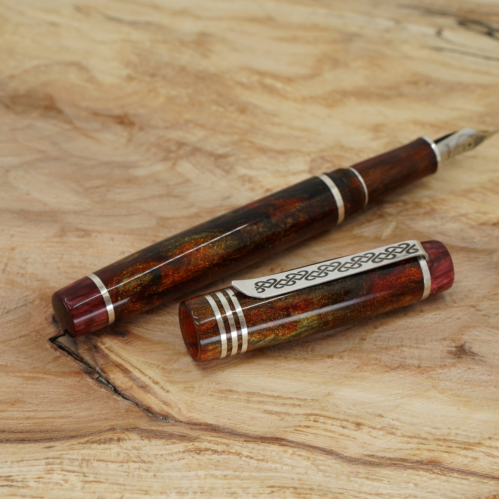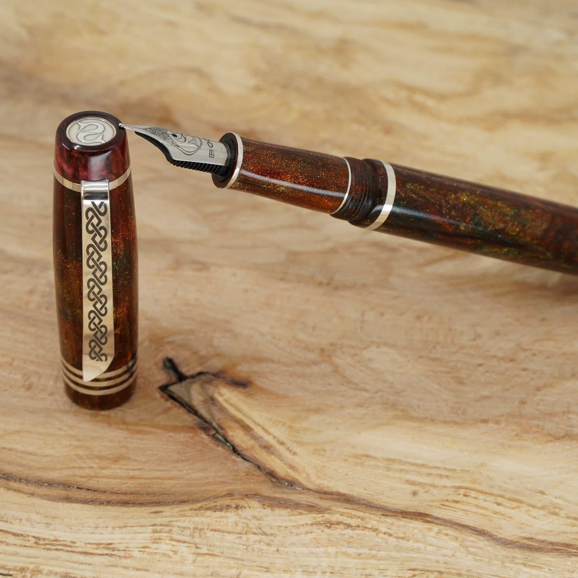 Japanese Autumn fitted with a polished steel Bock nib size 6. PEN SIZE: Approximately is 145m/m long including cap. 135m/m nib to body end. Body diameter 15m/m with a 13m/m thread. Cap diameter 16m/m. Nib make Bock polished steel. The pen comes with any nib tip size and Schmidt K5 ink converter. Other nibs are available; please contact john@silverburlpens.com to discuss alternatives and prices. I`ll be pleased to offer advice. A totally hand crafted pen including all the silver work.