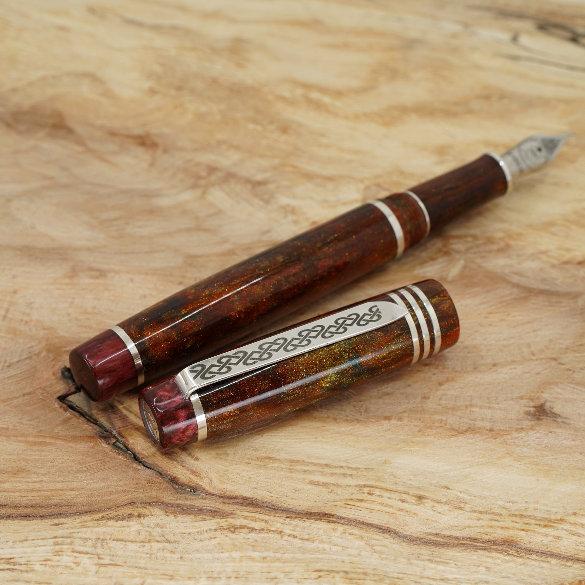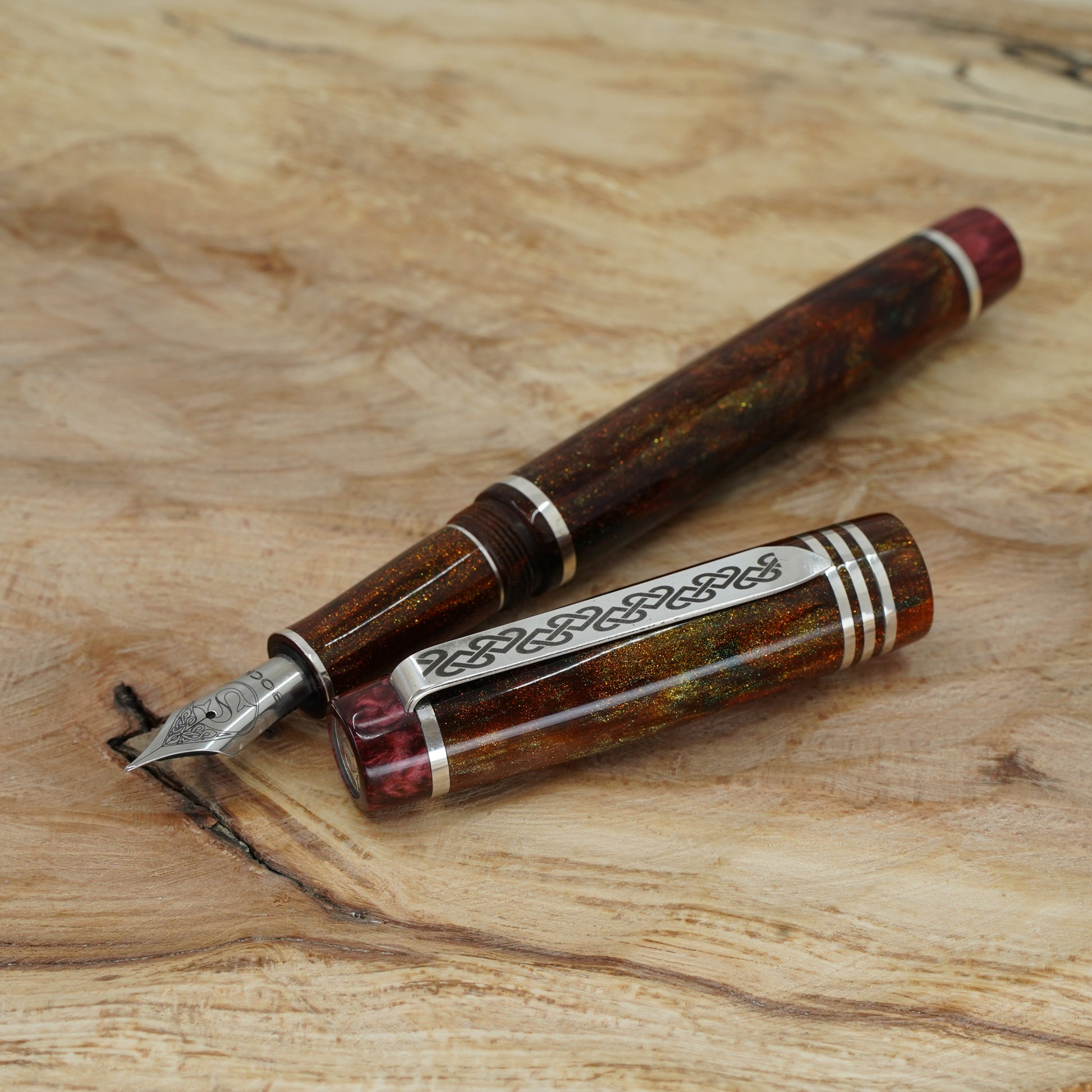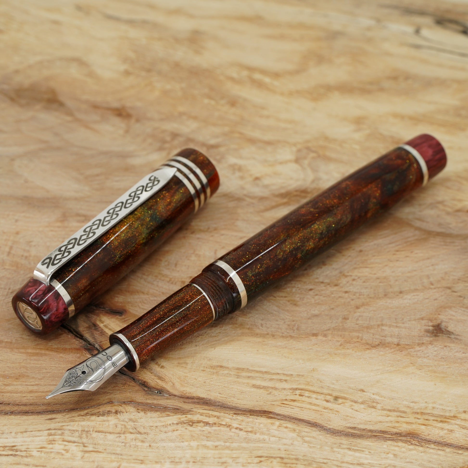 Japanese Autumn fitted with a polished steel Bock nib size 6. PEN SIZE: Approximately is 145m/m long including cap. 135m/m nib to body end. Body diameter 15m/m with a 13m/m thread. Cap diameter 16m/m. Nib make Bock polished steel. The pen comes with any nib tip size and Schmidt K5 ink converter. Other nibs are available; please contact john@silverburlpens.com to discuss alternatives and prices. I`ll be pleased to offer advice. A totally hand crafted pen including all the silver work.
