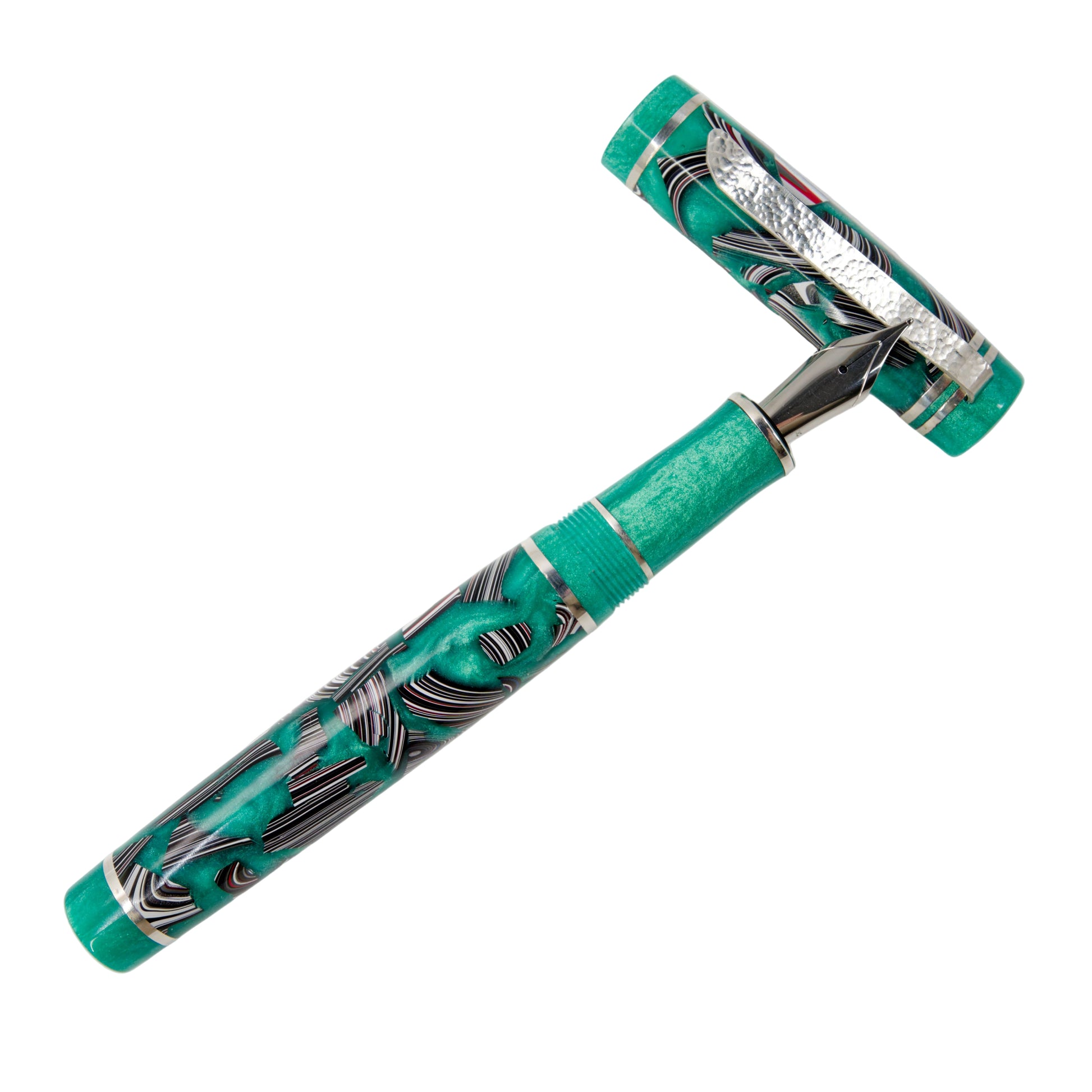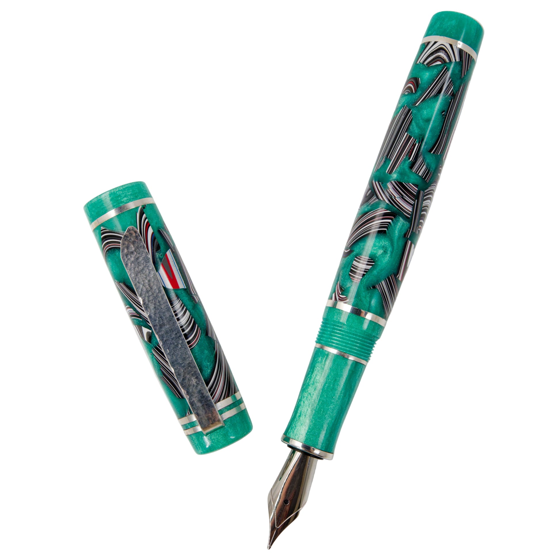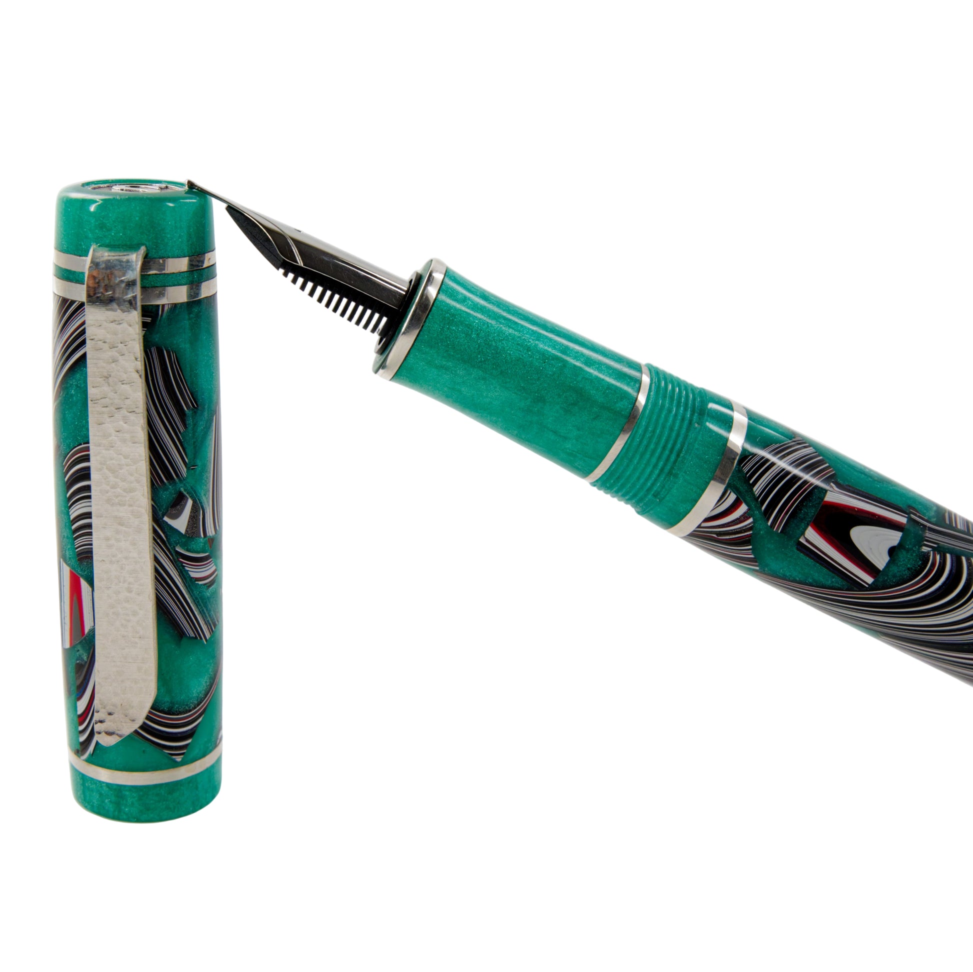 This vintage Fordite is carefully handcrafted and preserved in resin, showcasing the stunning layers of automotive paint slag from decades ago. Made with .940 argentium silver and a size six Jowo nib, this pen is both durable and stylish. Indulge in the rich history and unique beauty of a byproduct that was once discarded, and add this remarkable piece to your collection. Choose your preferred nib size before checkout and enjoy the smooth ink filling system with a Schmidt K5 converter. Don't miss out on the opportunity to own a piece of automotive history.