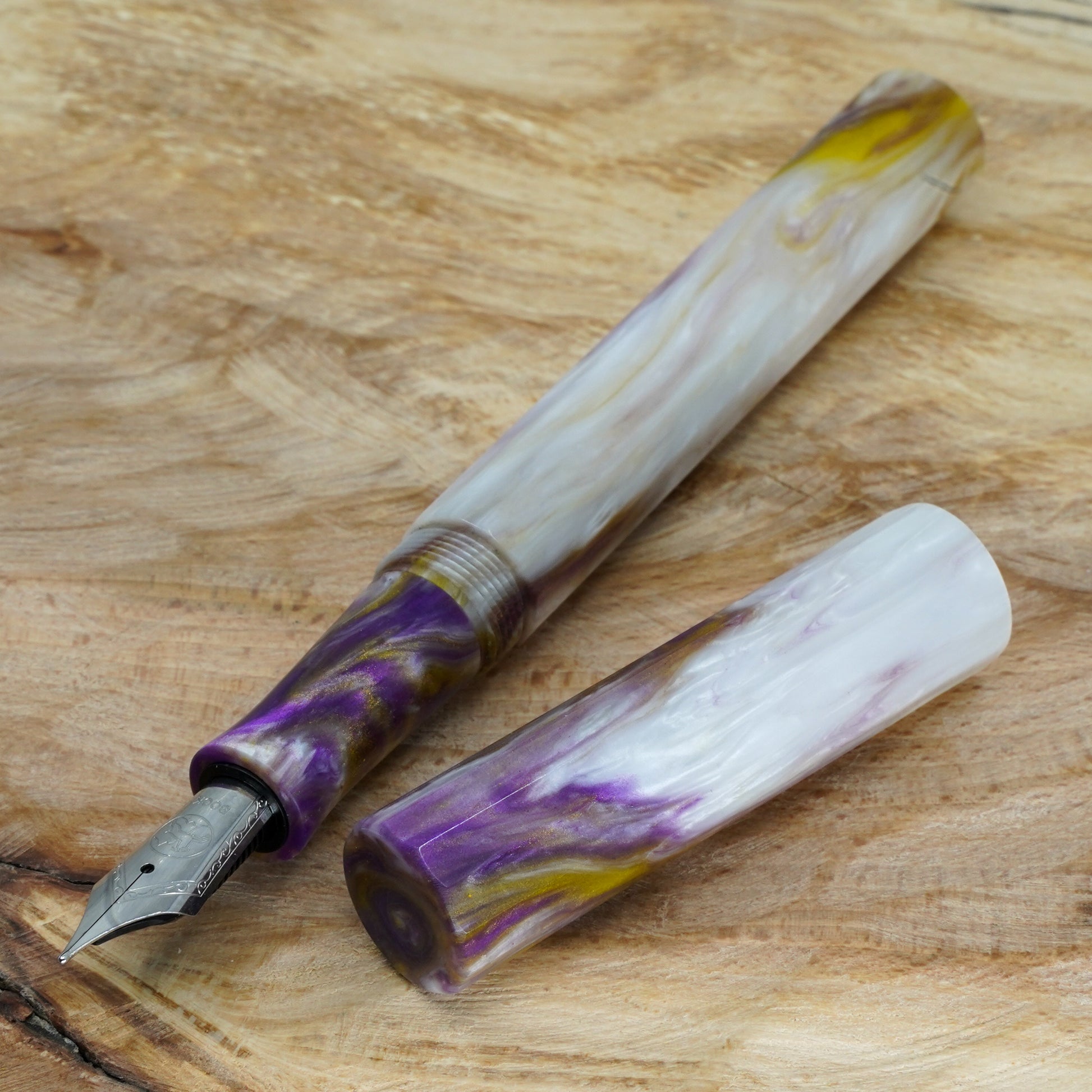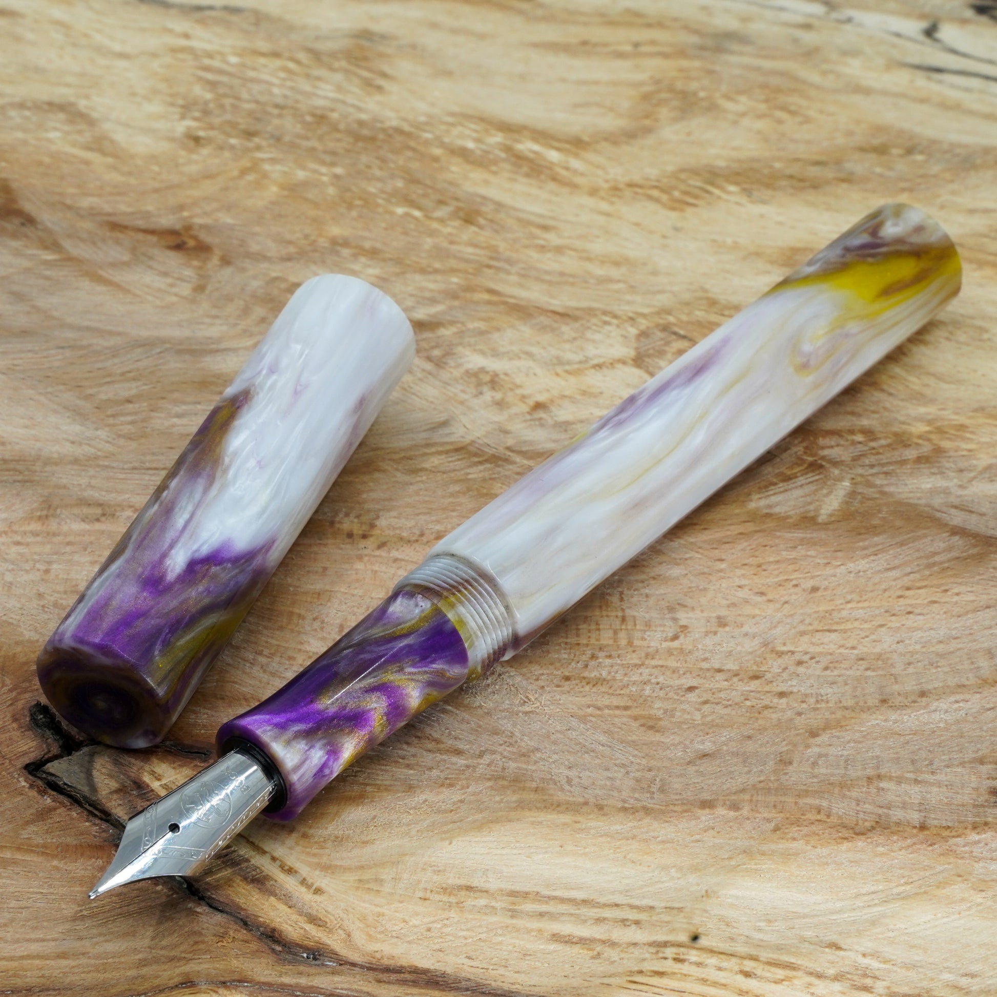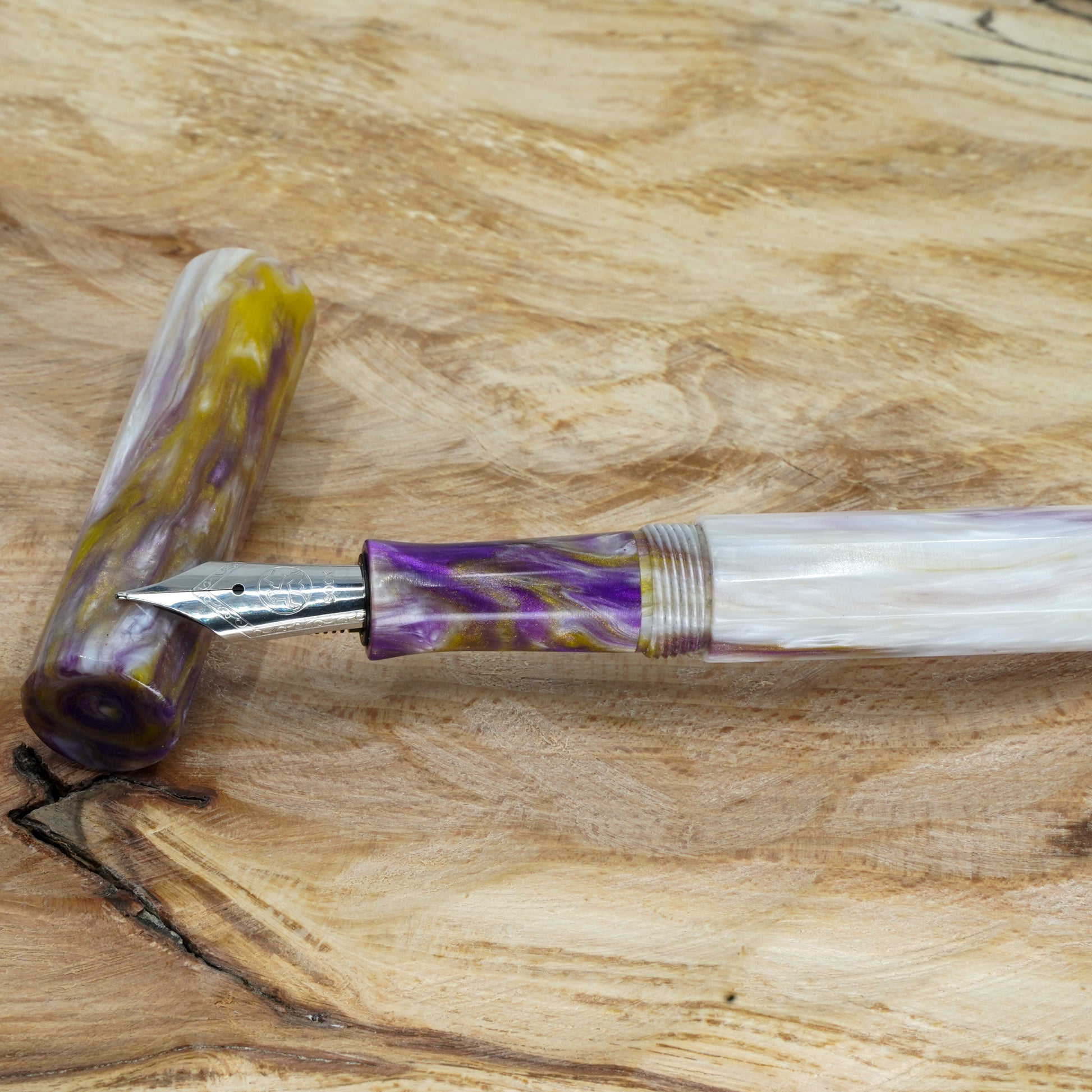 My Simply Elegant series of pens were created to satisfy the discerning writer with a no frills pen that is not only comfortable in the hand but is also easy to slip into a pocket or bag but is equally at home sat on a desk, this range of pens come in various shapes and sizes all finished to a very high standard. Lemon and Lavender Dodecagon 12 sided Pen, fitted with a size six Jowo nib and Schmidt K5 ink converter. Comes as standard with a polished steel nib, your choice of tip size. Other nibs are available; please contact john@silverburlpens.com to discuss alternatives and prices.
