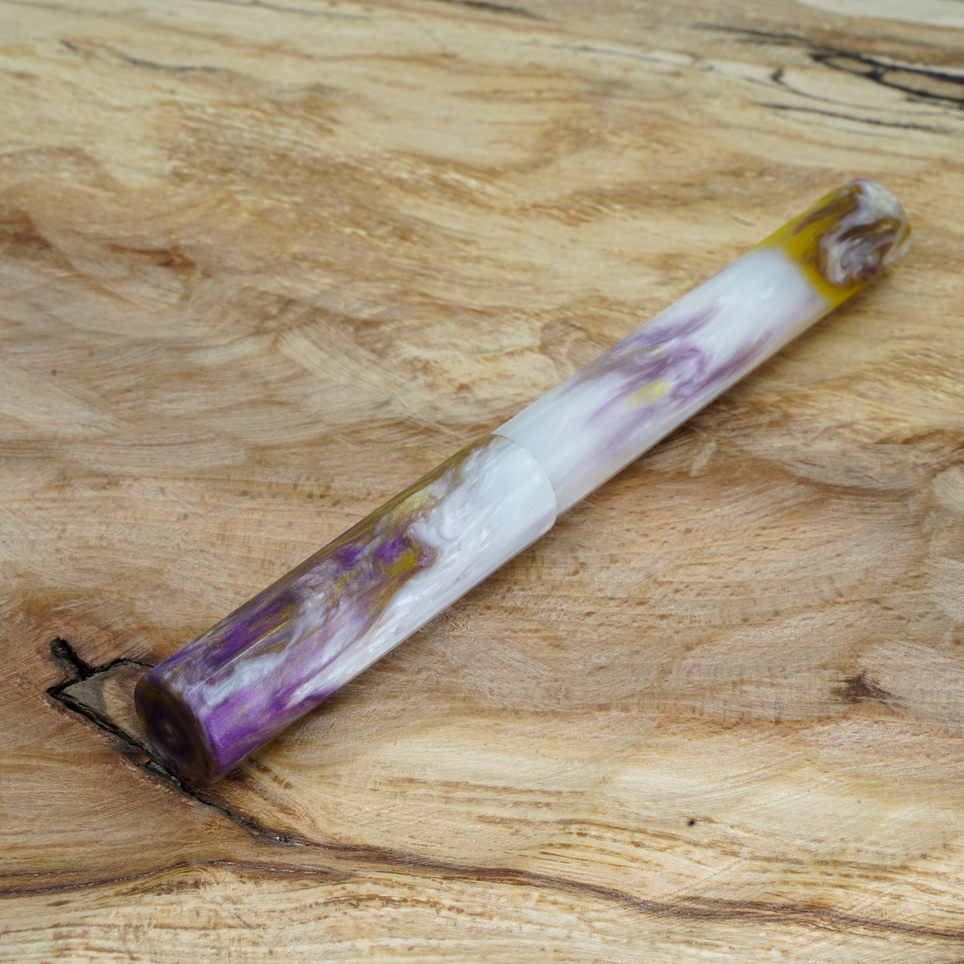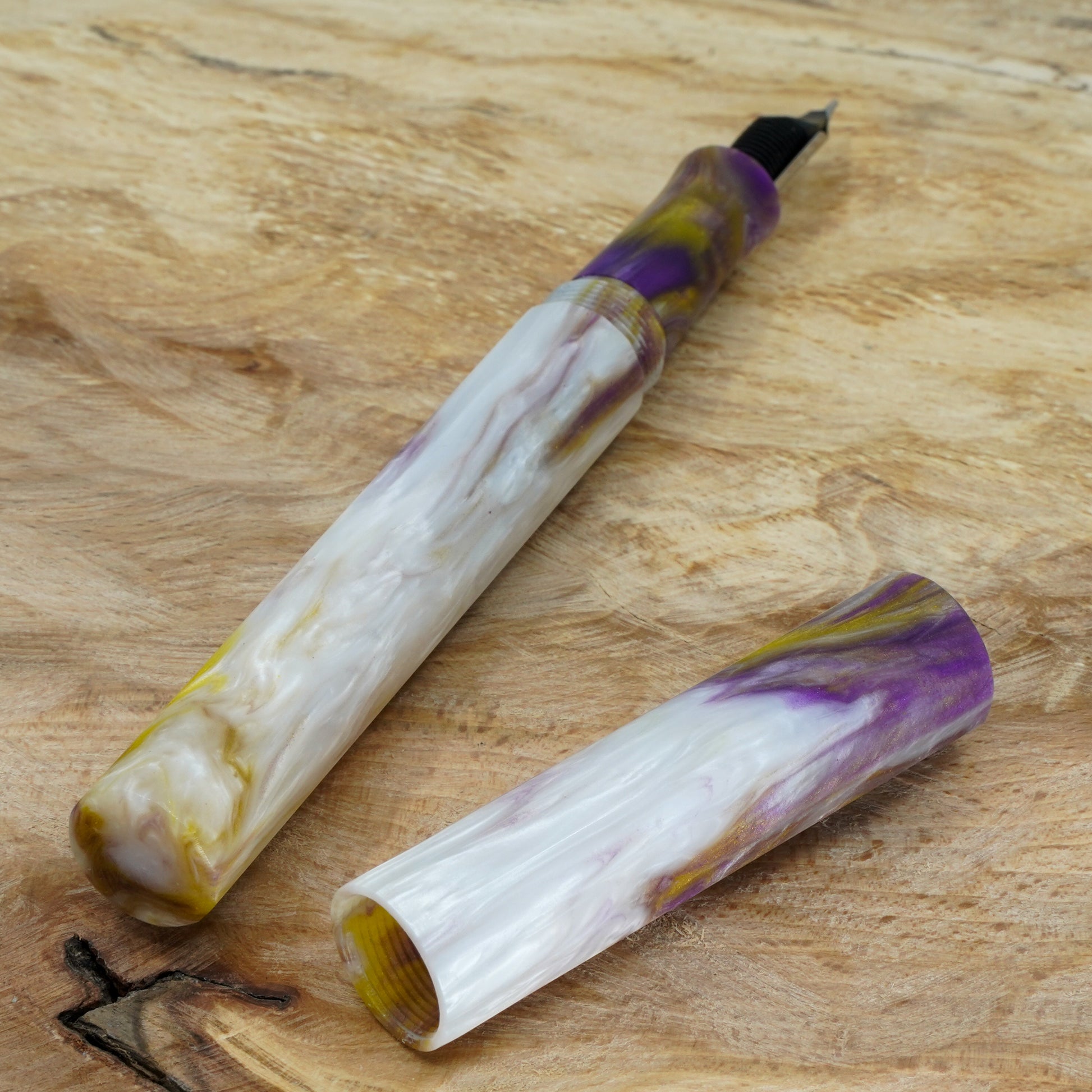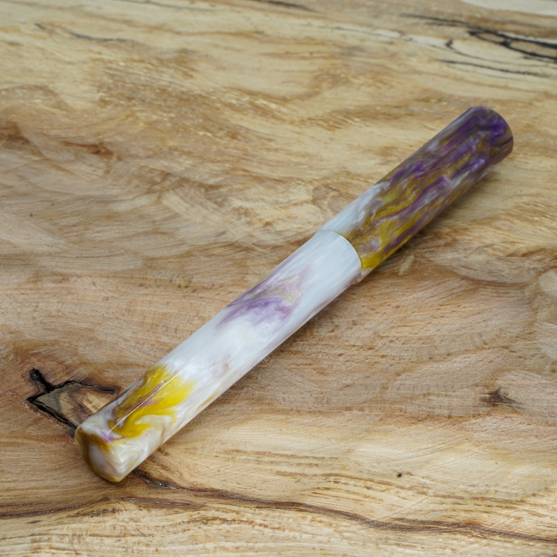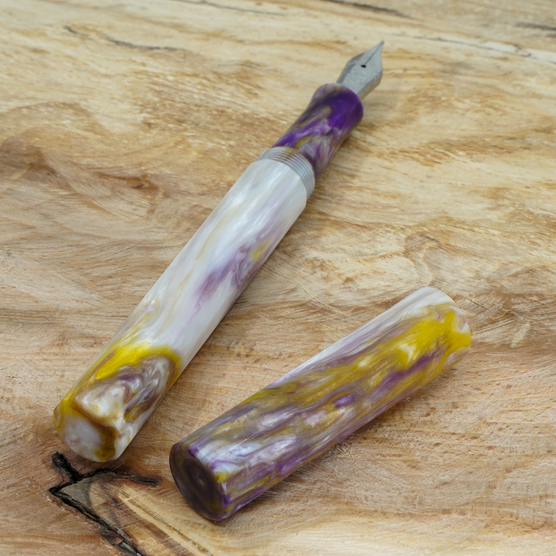 My Simply Elegant series of pens were created to satisfy the discerning writer with a no frills pen that is not only comfortable in the hand but is also easy to slip into a pocket or bag but is equally at home sat on a desk, this range of pens come in various shapes and sizes all finished to a very high standard. Lemon and Lavender Dodecagon 12 sided Pen, fitted with a size six Jowo nib and Schmidt K5 ink converter. Comes as standard with a polished steel nib, your choice of tip size. Other nibs are available; please contact john@silverburlpens.com to discuss alternatives and prices.