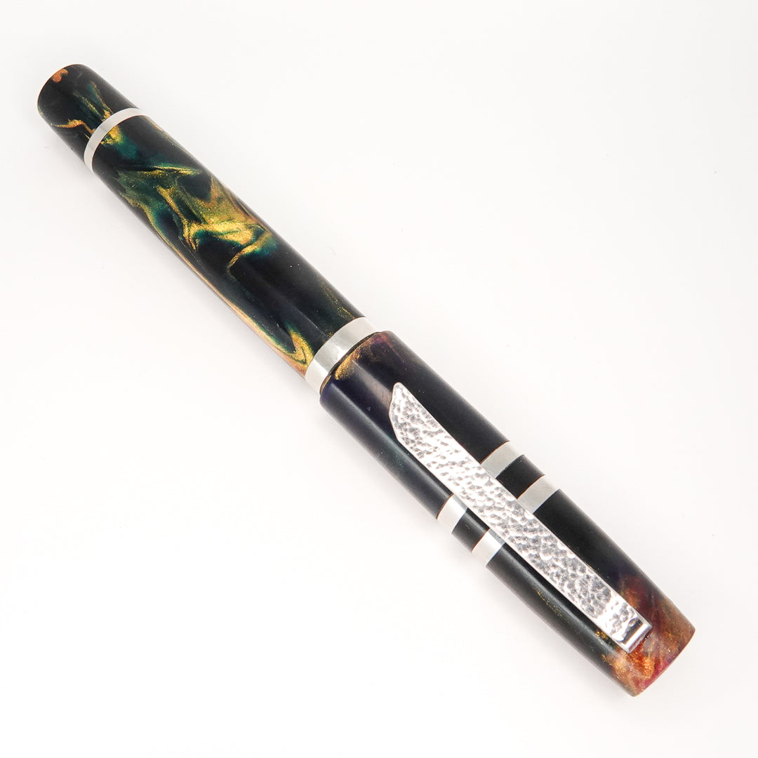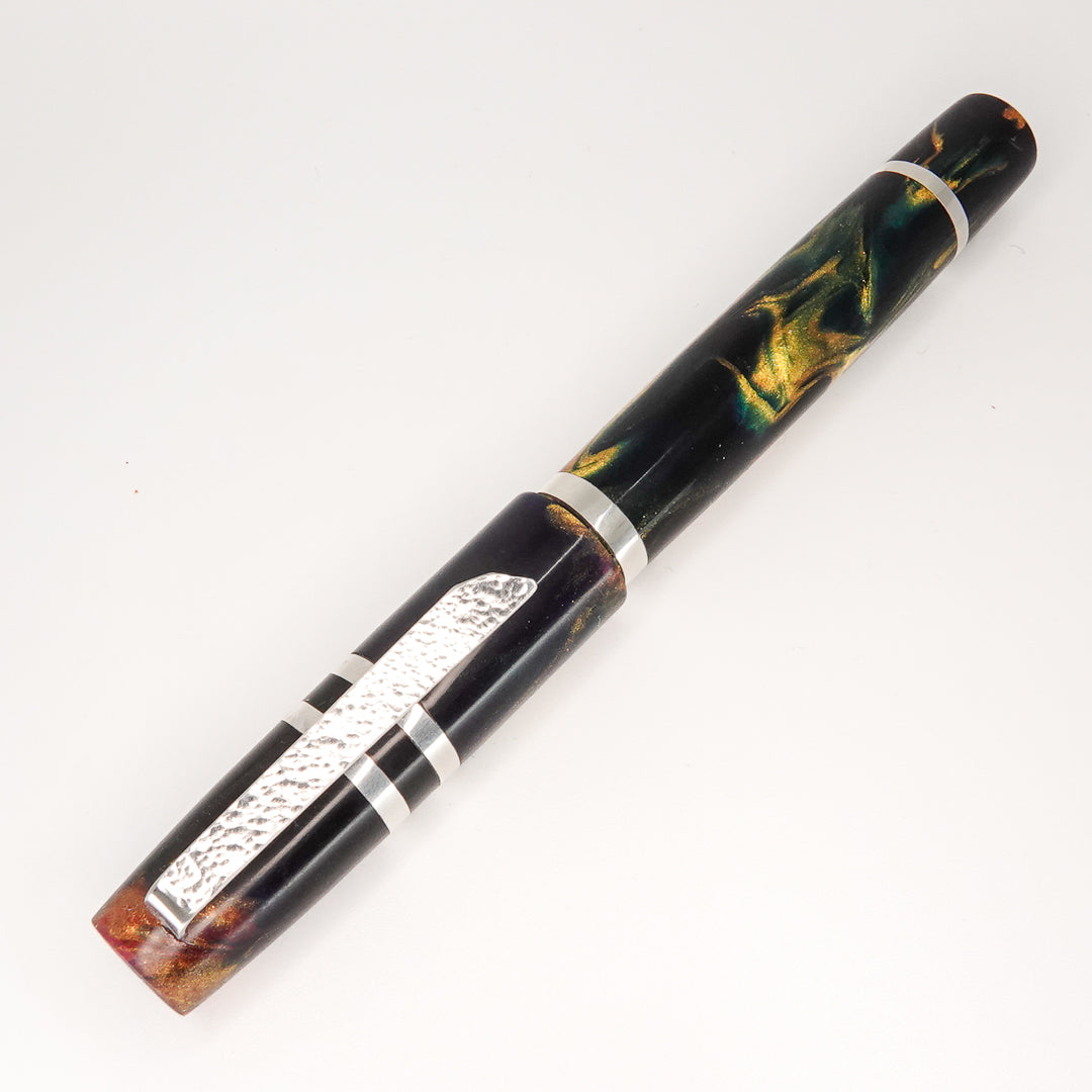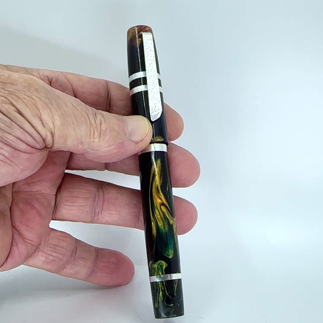Introducing the Mystic Sucker Punch 8, a revolutionary pen from Silverburlpens. This one-of-a-kind writing instrument is meticulously handcrafted using material from the renowned Carolina pen co. The pen is equipped with a polished steel Magna Carta nib size 8, featuring a medium nib tip and a Schmidt K5 ink converter. For those who prefer a different nib size, custom options are available upon request. Measuring at approximately 145m/m in length (including cap), 135m/m from nib to body end, and with a body diameter of 15.75m/m and a 15m/m thread, this pen is the perfect size for a comfortable writing experience. The cap diameter is 16.75 m/m, making it easy to grip and use. What sets this pen apart is the use of Argentium .940 silver, which is brighter and whiter than traditional .925 sterling silver. Not only is it more visually appealing, but it is also highly resistant to tarnishing. Additionally, Argentium silver is hypoallergenic, making it suitable for those with sensitivities to traditional sterling silver. It also has antibacterial properties, ensuring a clean and hygienic writing experience. Please note that this pen comes with a medium nib only. If you require a different tip size, please contact us before making your purchase. Elevate your writing game with the Mystic Sucker Punch 8 from Silverburlpens.