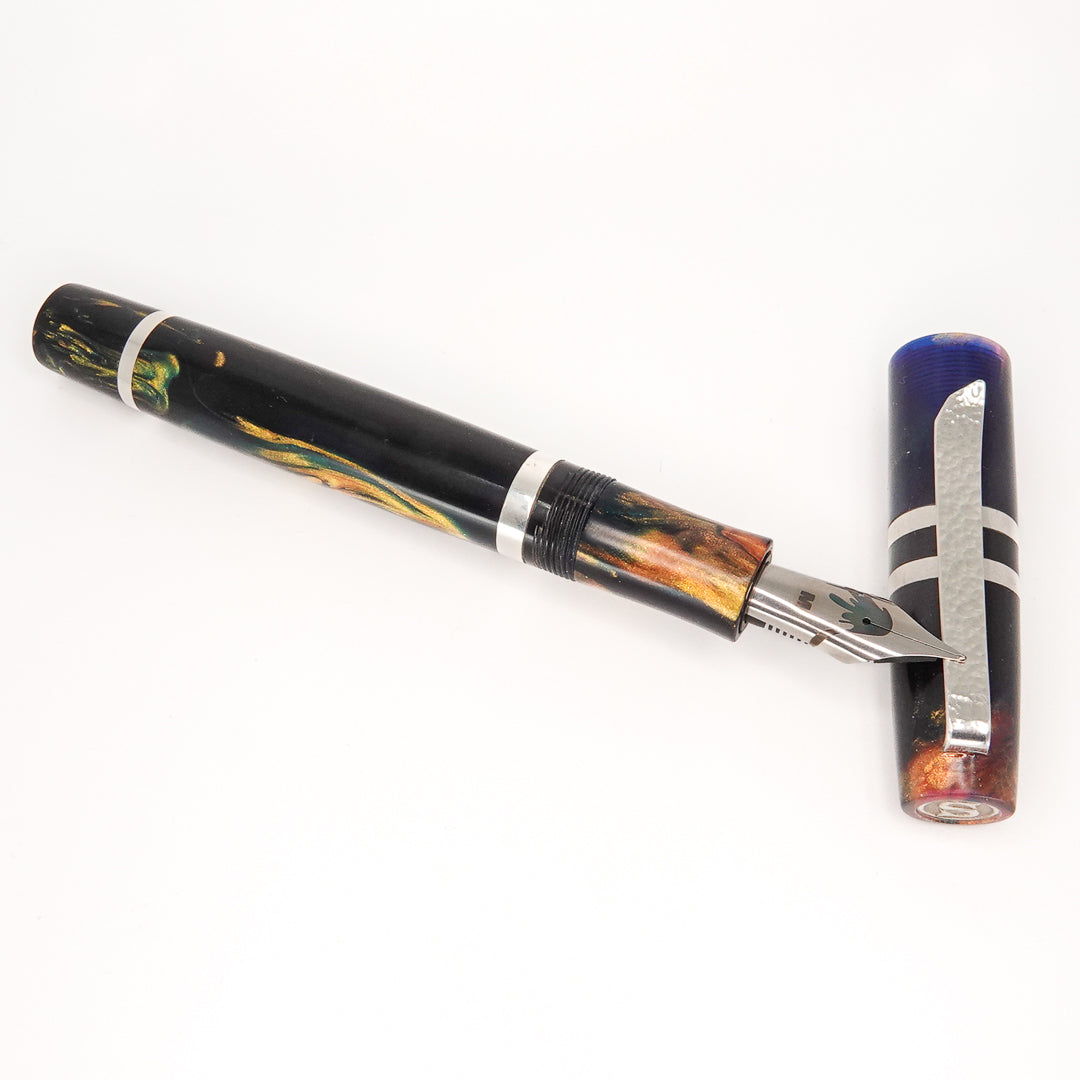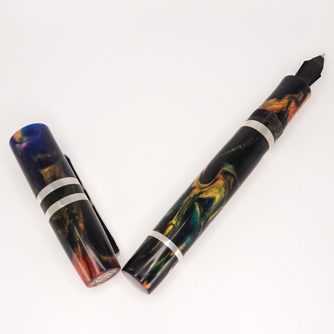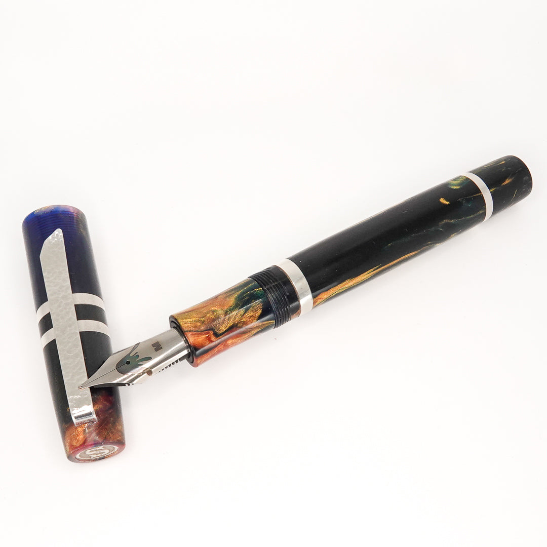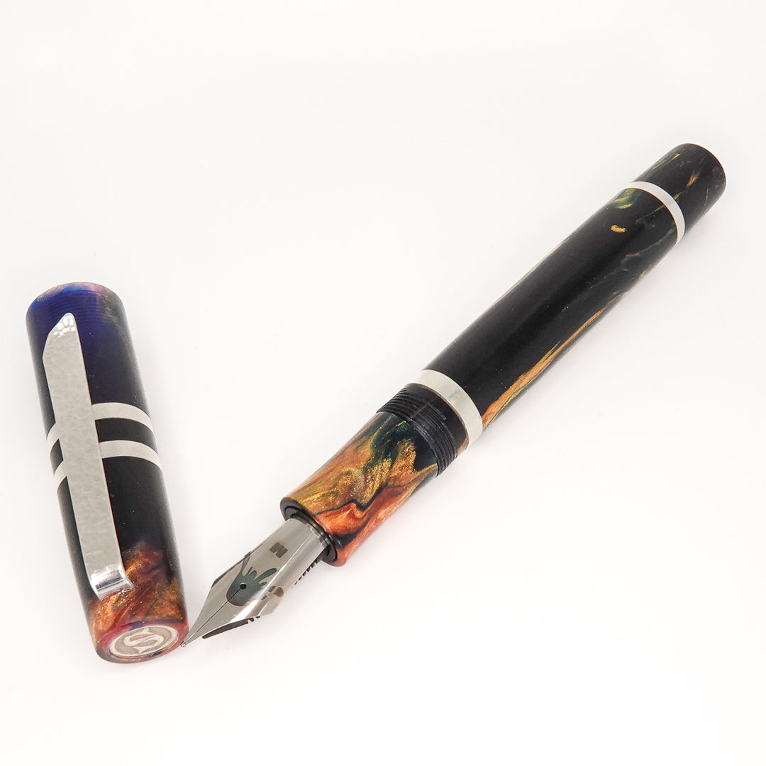 Introducing the Mystic Sucker Punch 8, a revolutionary pen from Silverburlpens. This one-of-a-kind writing instrument is meticulously handcrafted using material from the renowned Carolina pen co. The pen is equipped with a polished steel Magna Carta nib size 8, featuring a medium nib tip and a Schmidt K5 ink converter. For those who prefer a different nib size, custom options are available upon request. Measuring at approximately 145m/m in length (including cap), 135m/m from nib to body end, and with a body diameter of 15.75m/m and a 15m/m thread, this pen is the perfect size for a comfortable writing experience. The cap diameter is 16.75 m/m, making it easy to grip and use. What sets this pen apart is the use of Argentium .940 silver, which is brighter and whiter than traditional .925 sterling silver. Not only is it more visually appealing, but it is also highly resistant to tarnishing. Additionally, Argentium silver is hypoallergenic, making it suitable for those with sensitivities to traditional sterling silver. It also has antibacterial properties, ensuring a clean and hygienic writing experience. Please note that this pen comes with a medium nib only. If you require a different tip size, please contact us before making your purchase. Elevate your writing game with the Mystic Sucker Punch 8 from Silverburlpens.
