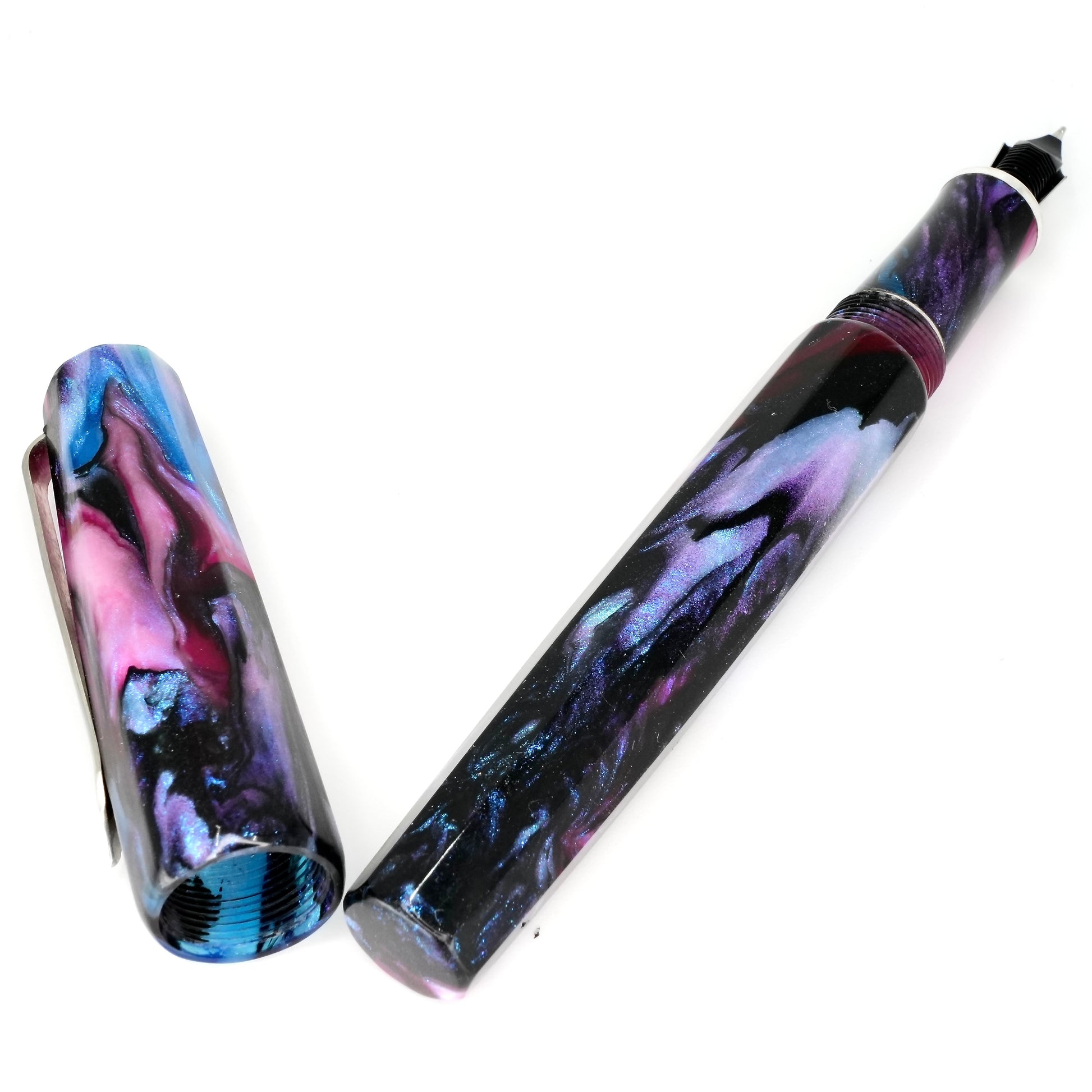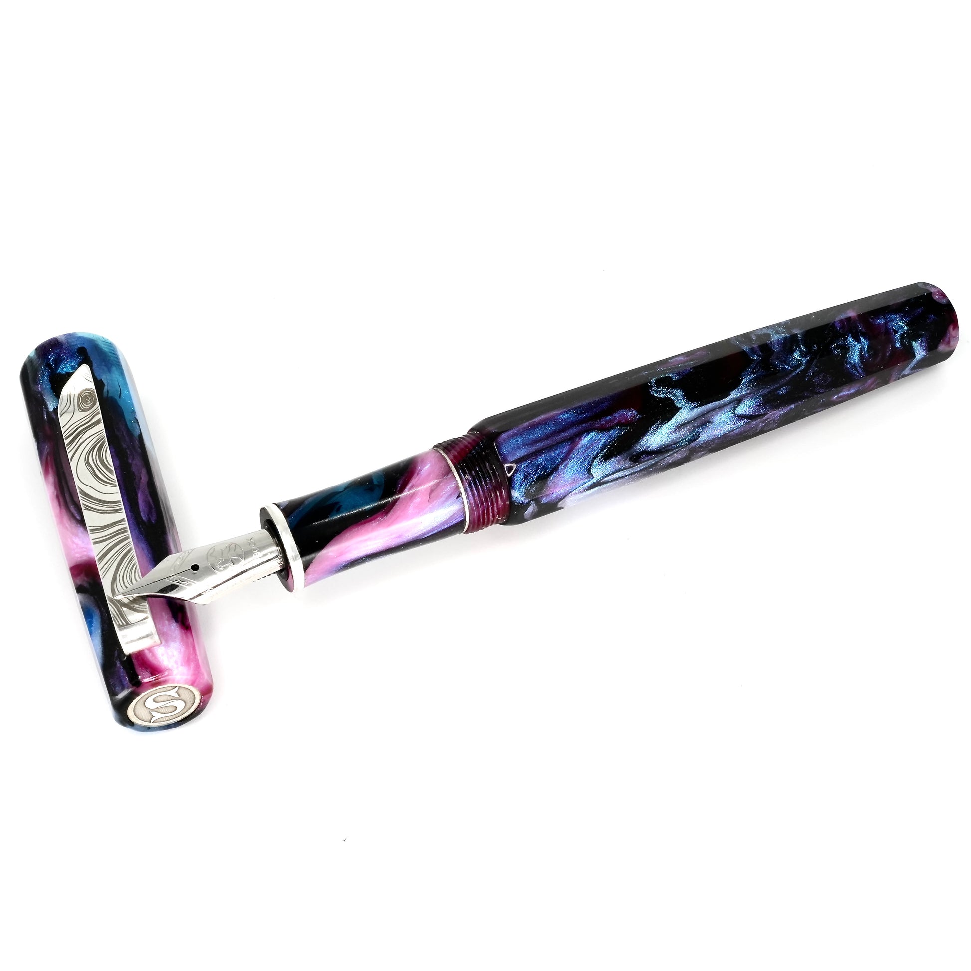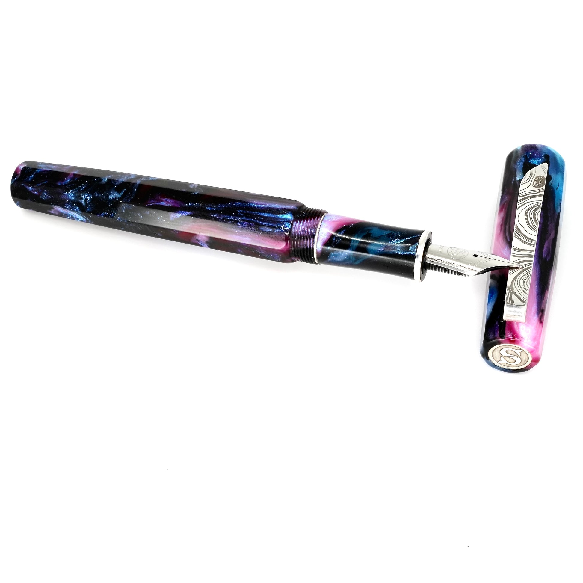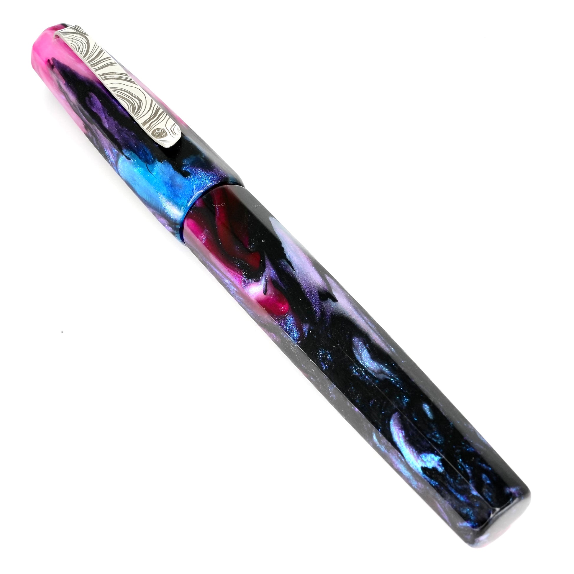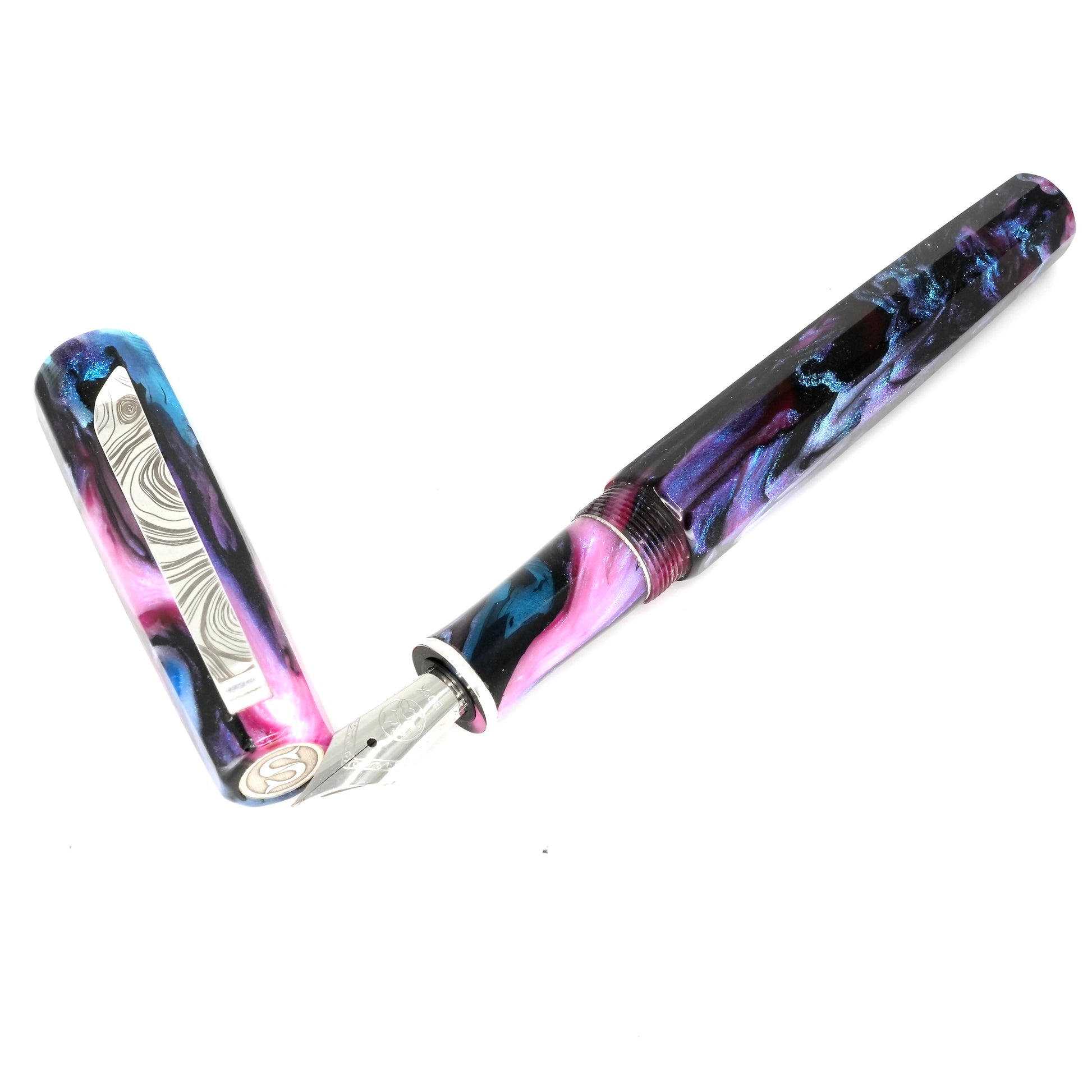 Indulge in the luxurious writing experience with our Cotton Candy Abalone Nonagon pen. This hand-crafted masterpiece boasts a polished steel Jowo nib, available in your preferred tip size. Made with Argentium .940 silver, this pen is tarnish-resistant, hypoallergenic, and exudes elegance. Upgrade your writing game with this Cotton Candy Abalone  Nonagon pen.