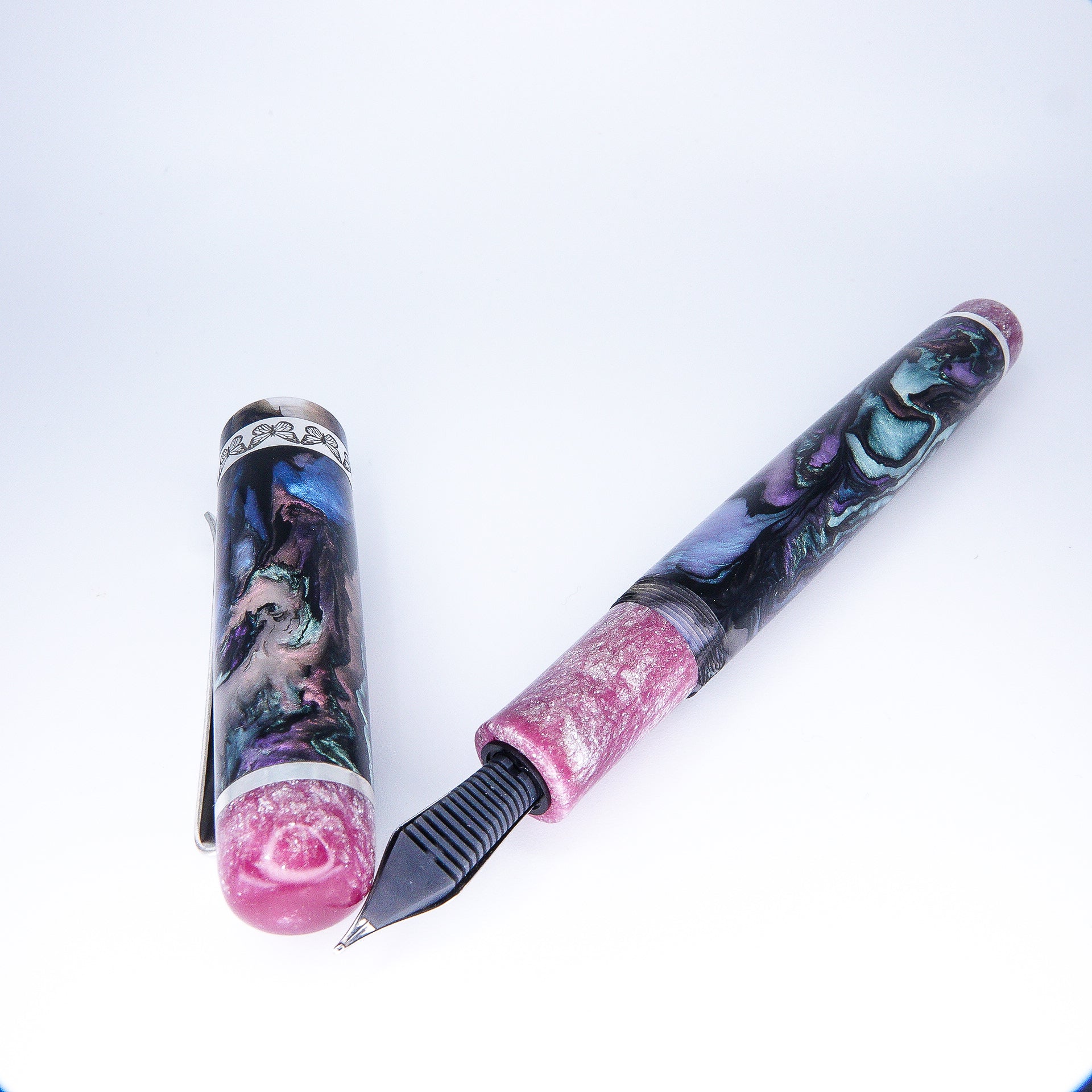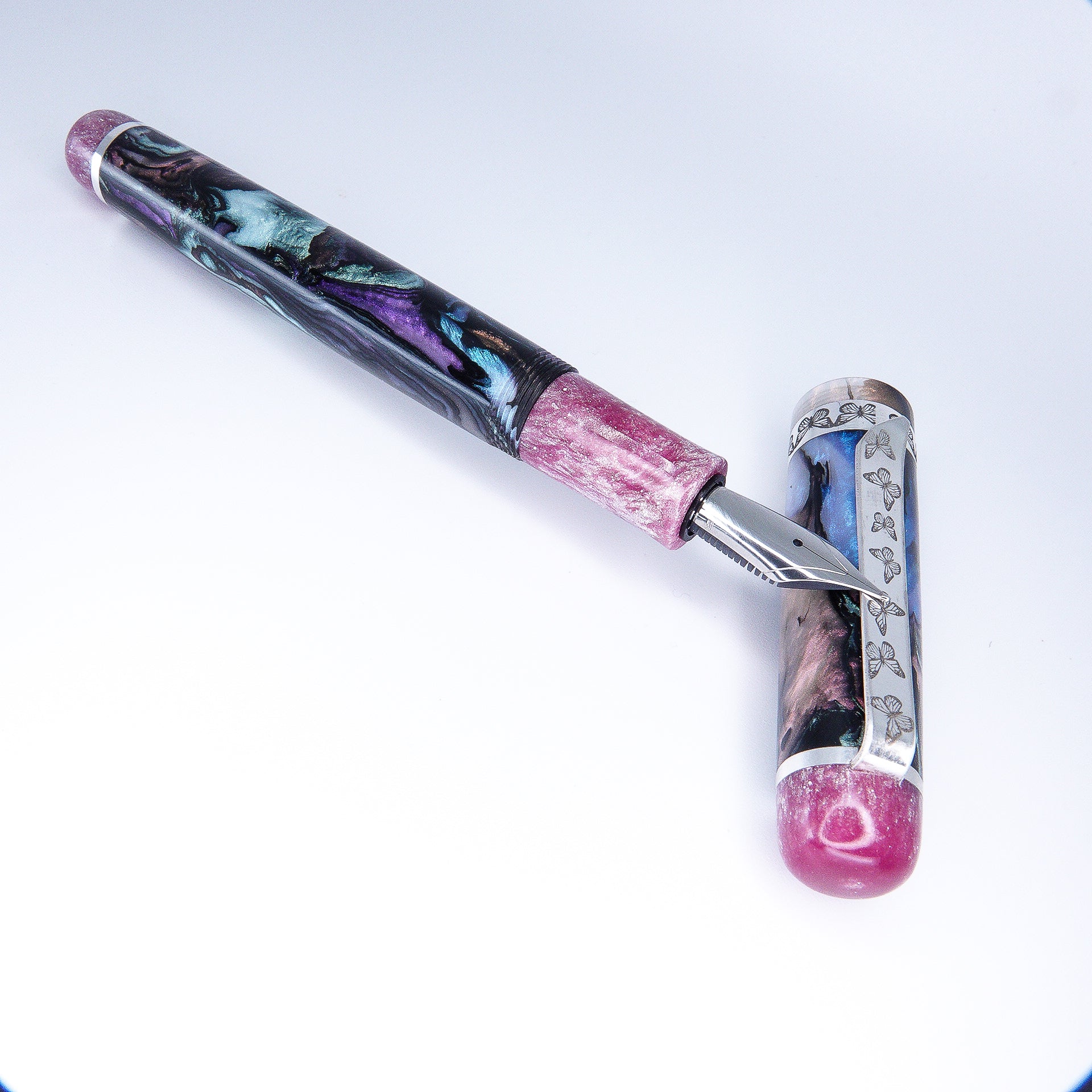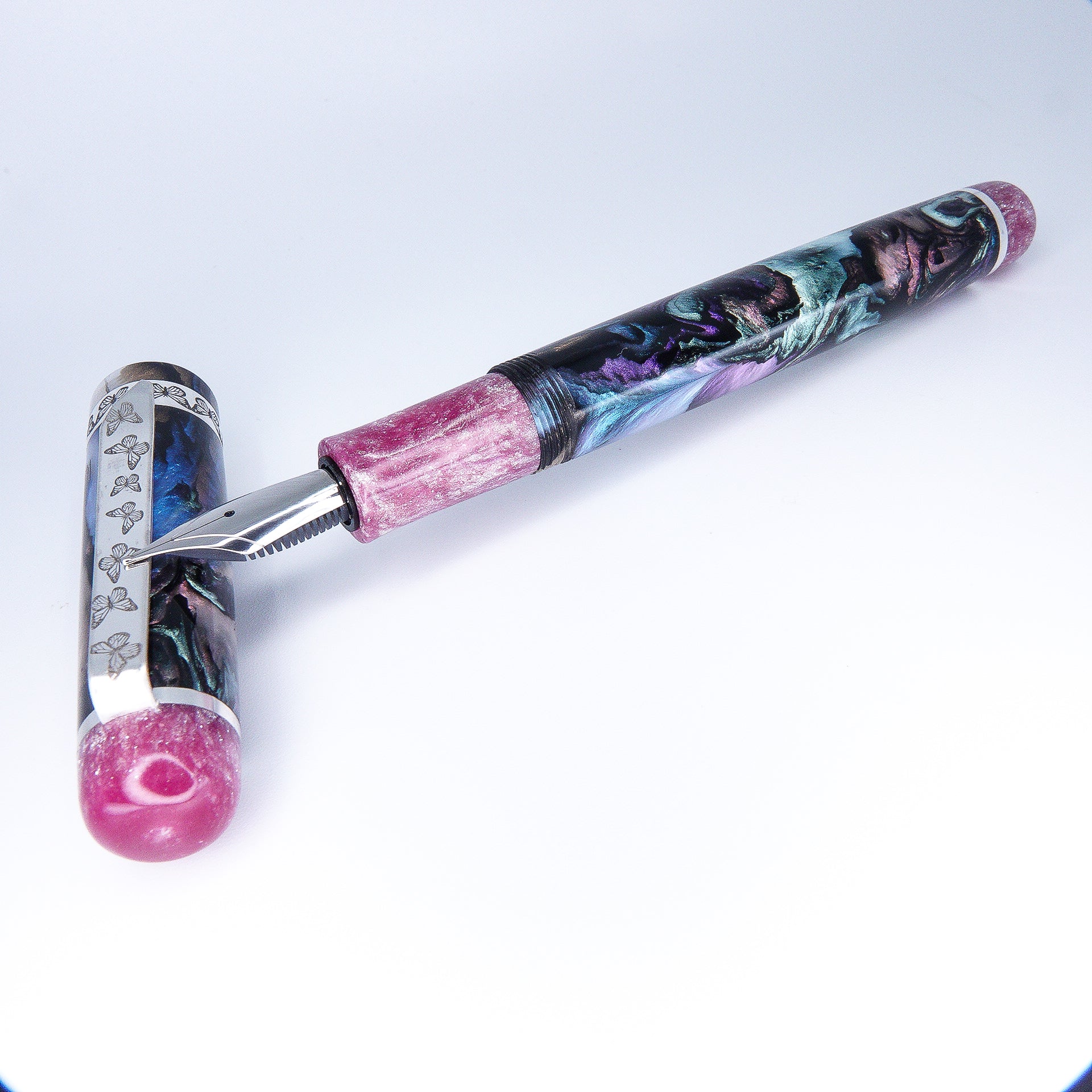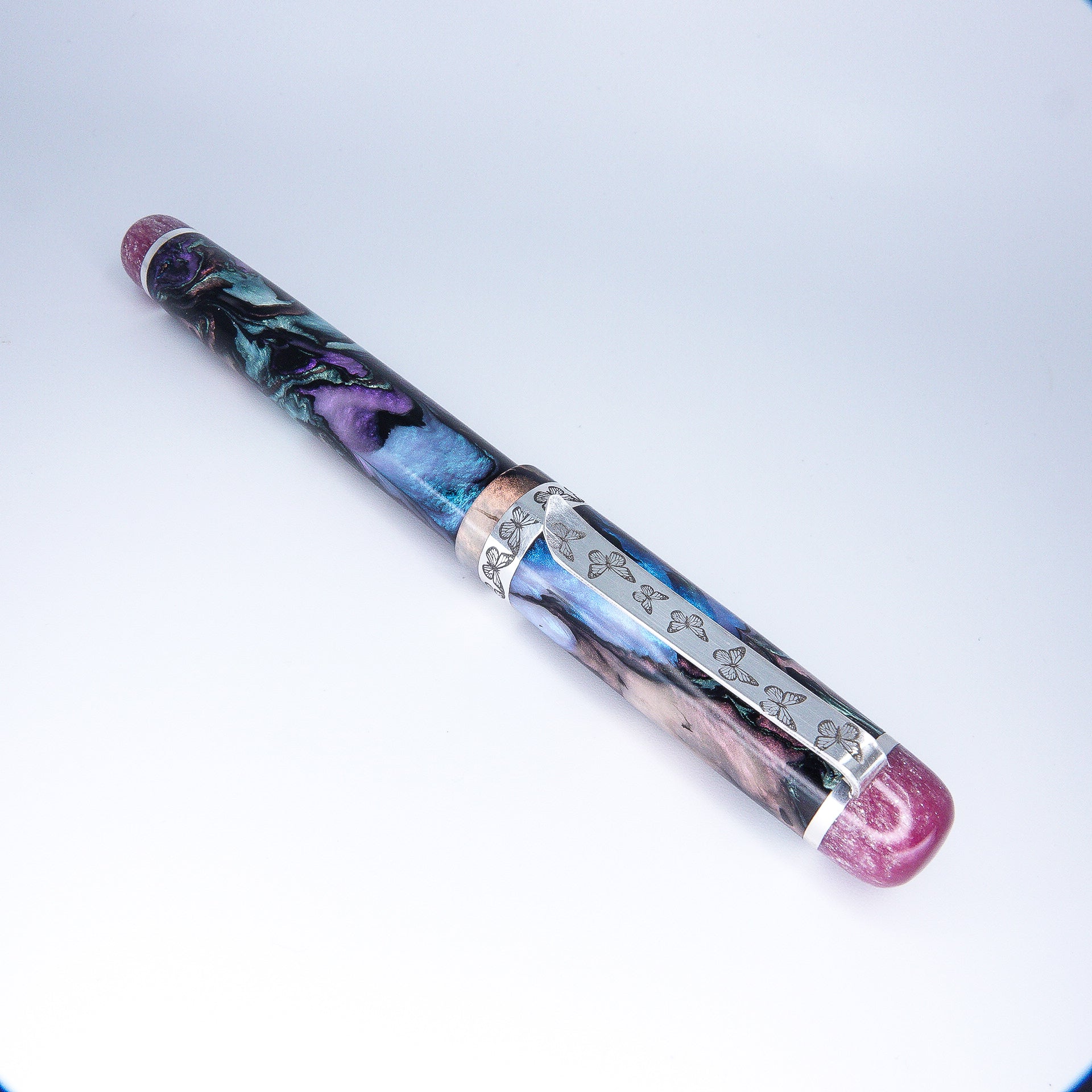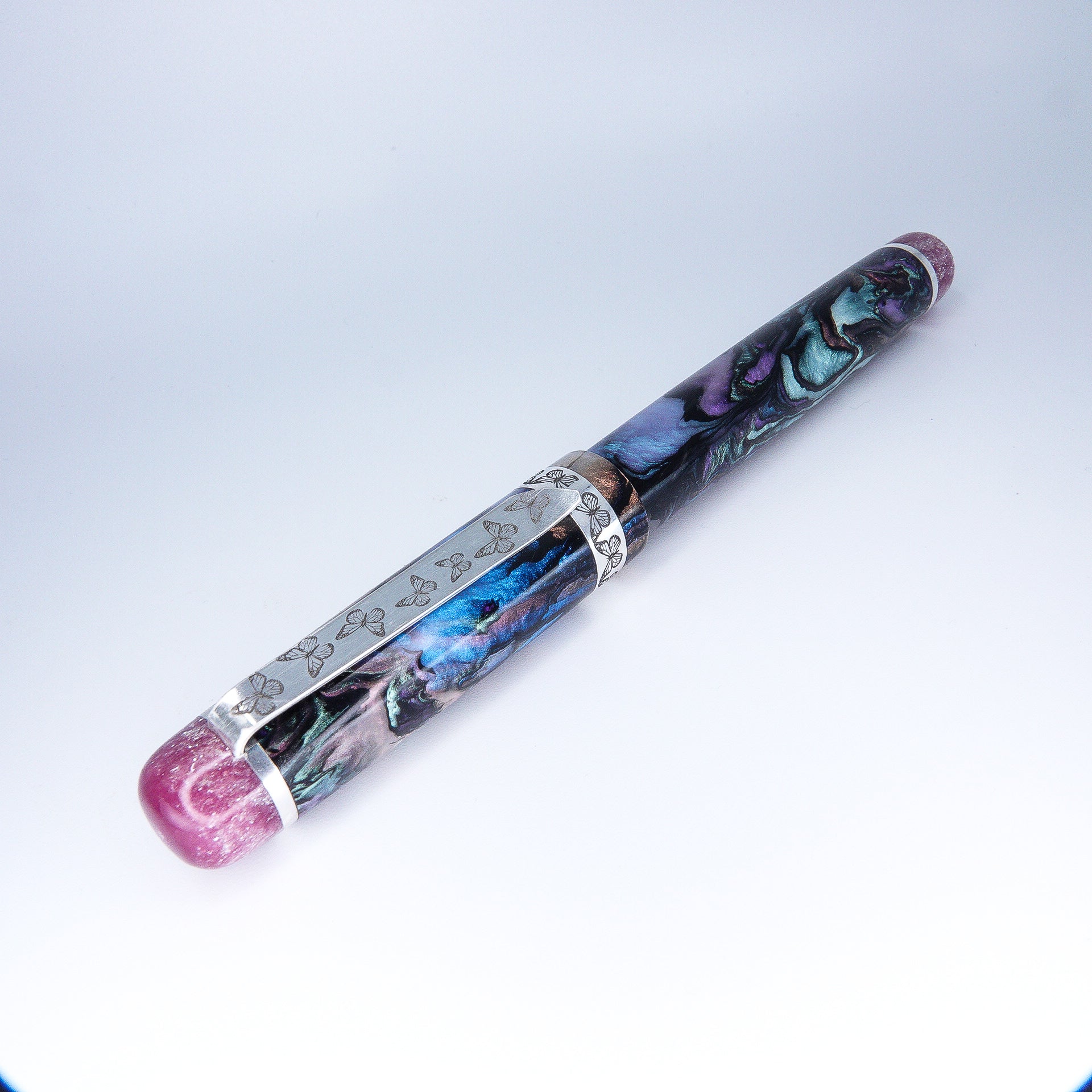 Papillon Silver Series from Silverburlpens is a totally hand crafted pen, made from material created by the Carolina pen co, It is fitted with a polished steel Jowo nib size 6, and comes with any nib tip size and Schmidt K5 ink converter. Other nibs are available upon request.
