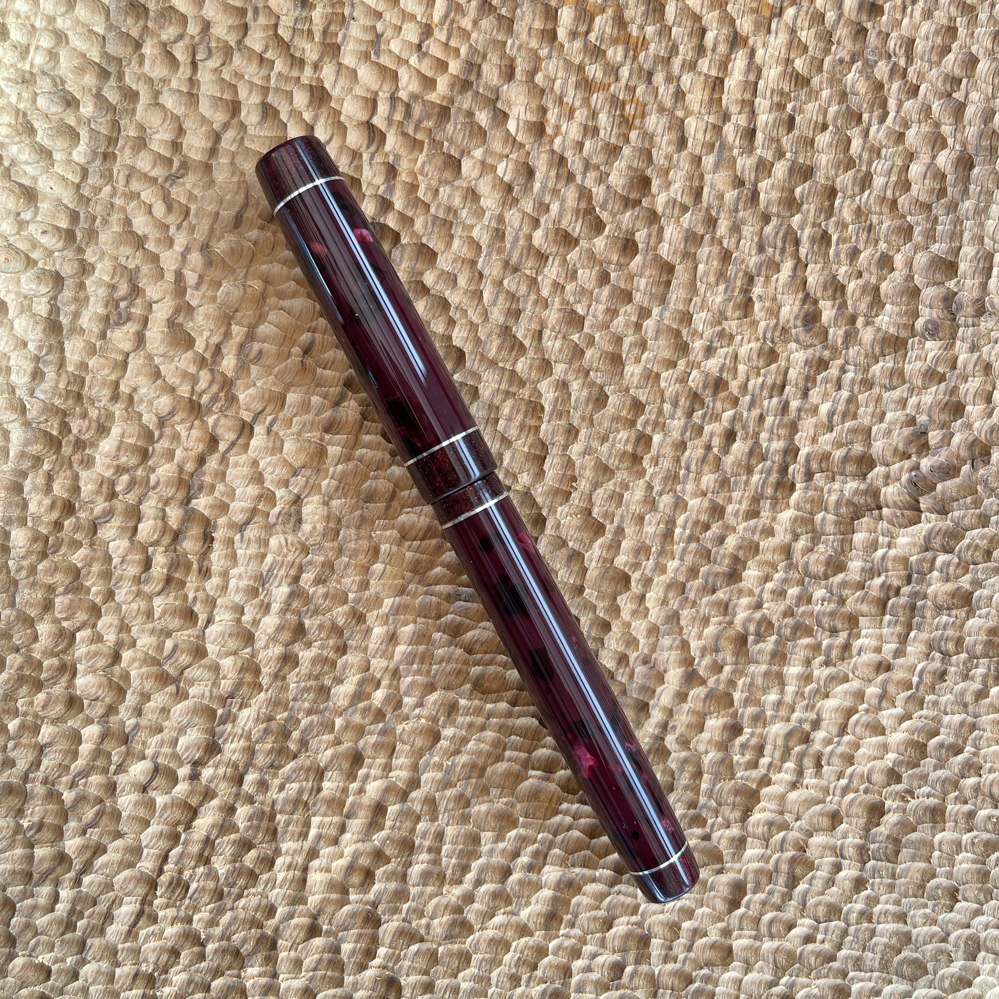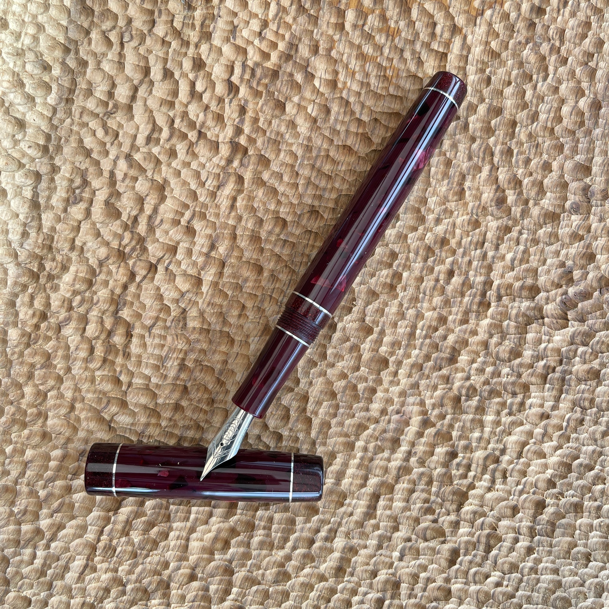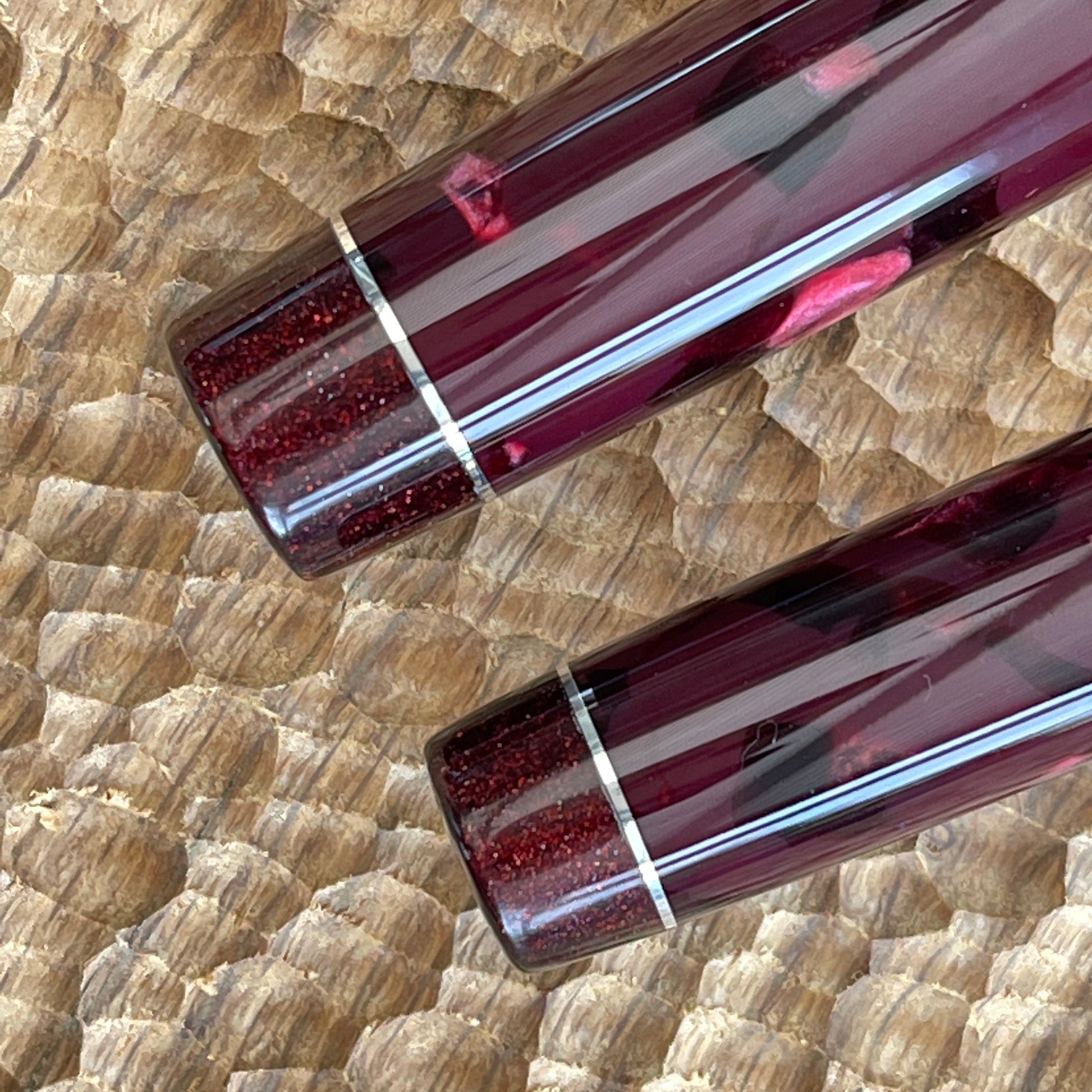 This Buttonfill Burgundy pen is a one of a kind, completely hand turned and polished to an ultra fine finish to show the amazing lustre achievable with these adorable materials, totally handmade by myself in my small home workshop. The level of craftsmanship, time involved and quality is reflected in the price. Fitted with polished steel iridium tip Bock size six nib, Can be fitted with a range of different nib tip sizes and materials, Gold, Gold plate, Rose Gold plate, Two tone Gold plate and polished Steel or Titanium semi flex steel. Fitted with a K5 premium ink converter, also takes standard international ink cartridge. Pen length with cap 145mm without cap 135mm body diameter 13.5mm cap diameter 14.5mm nib section 10mm tapering up to 12mm with a cap thread of 13mm.