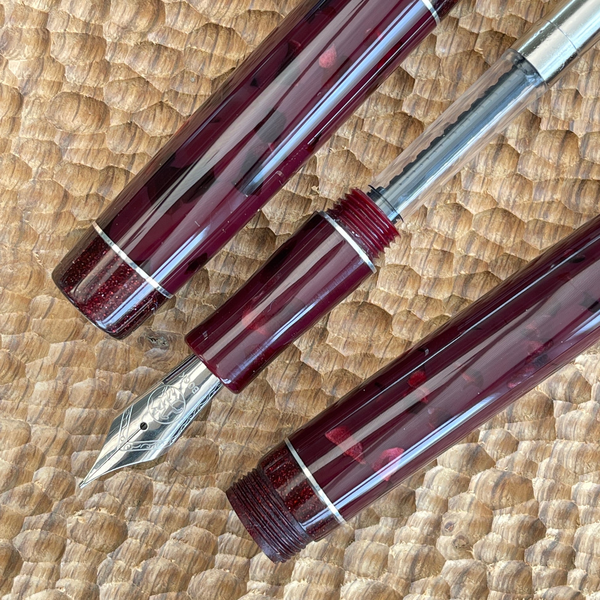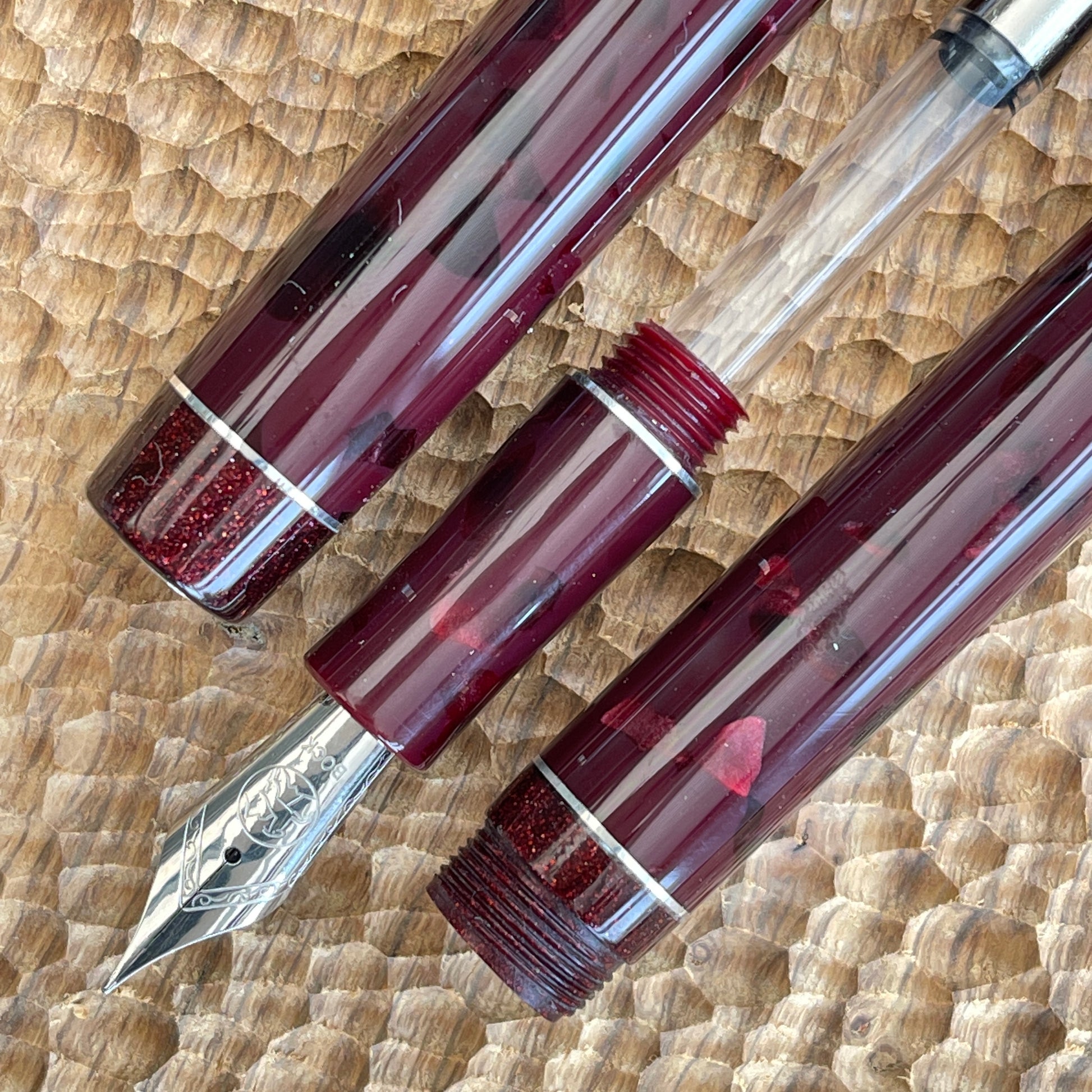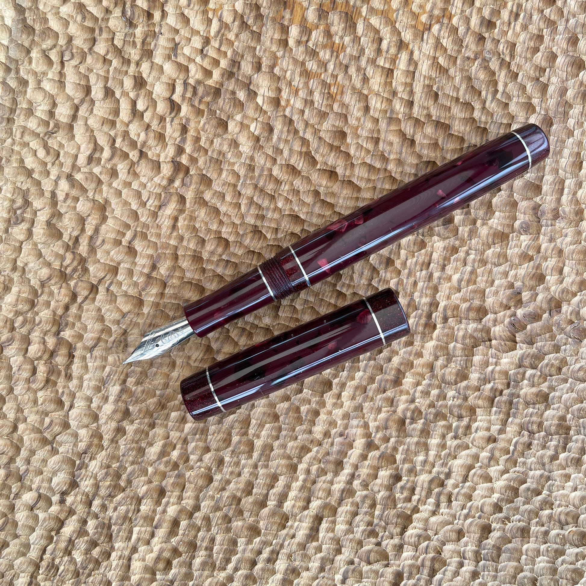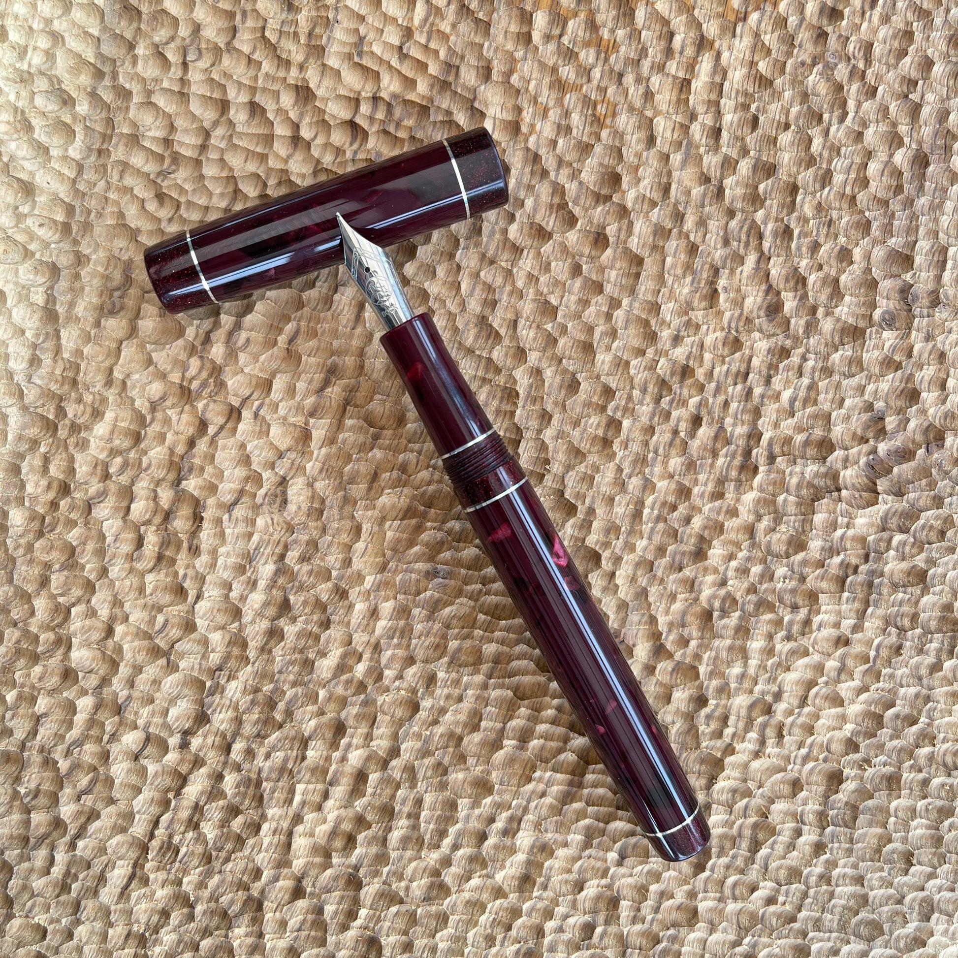 This Buttonfill Burgundy pen is a one of a kind, completely hand turned and polished to an ultra fine finish to show the amazing lustre achievable with these adorable materials, totally handmade by myself in my small home workshop. The level of craftsmanship, time involved and quality is reflected in the price. Fitted with polished steel iridium tip Bock size six nib, Can be fitted with a range of different nib tip sizes and materials, Gold, Gold plate, Rose Gold plate, Two tone Gold plate and polished Steel or Titanium semi flex steel. Fitted with a K5 premium ink converter, also takes standard international ink cartridge. Pen length with cap 145mm without cap 135mm body diameter 13.5mm cap diameter 14.5mm nib section 10mm tapering up to 12mm with a cap thread of 13mm.