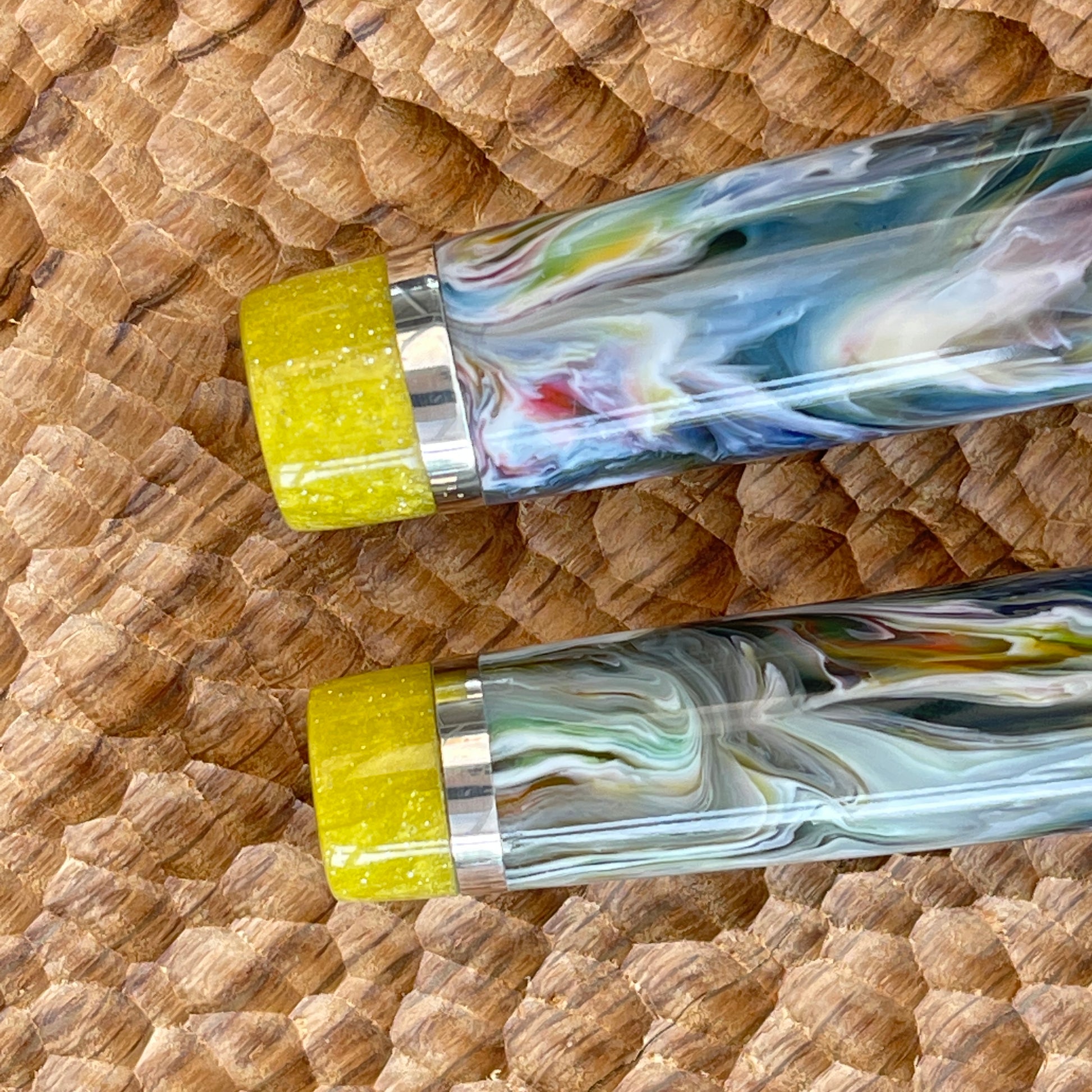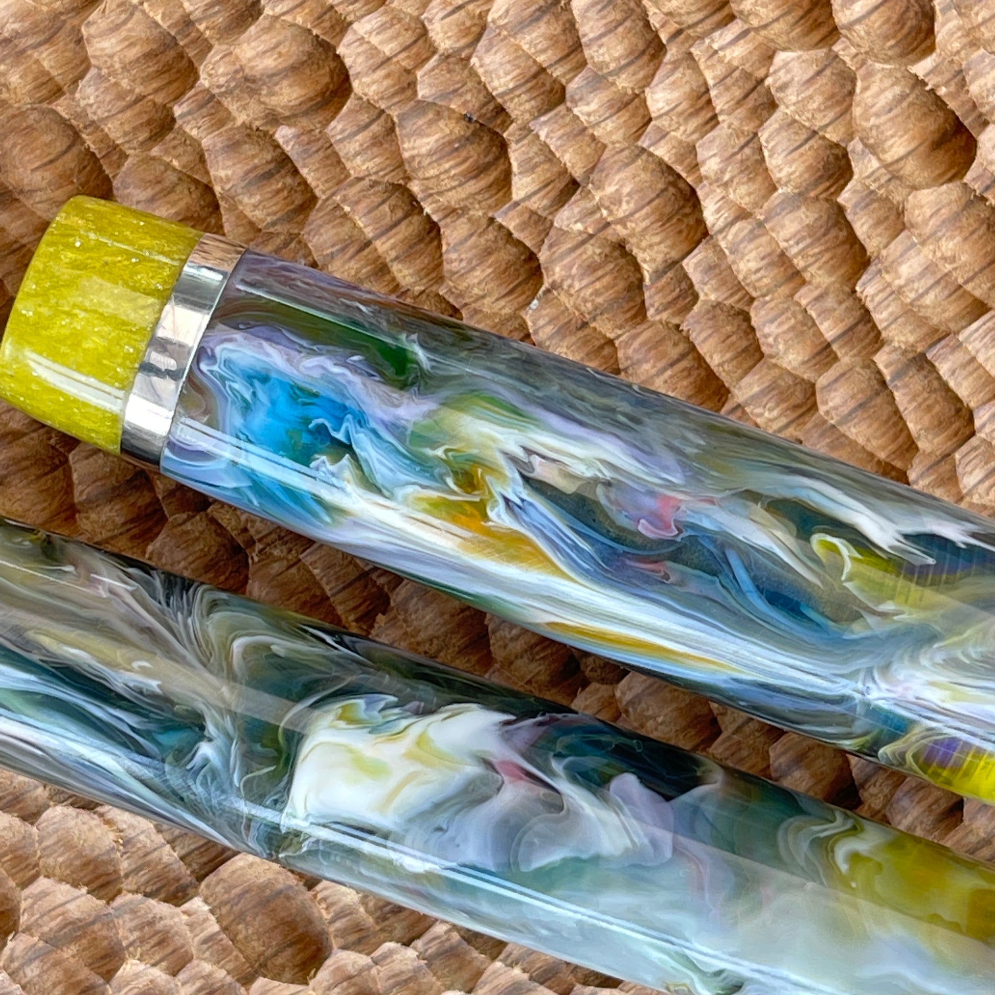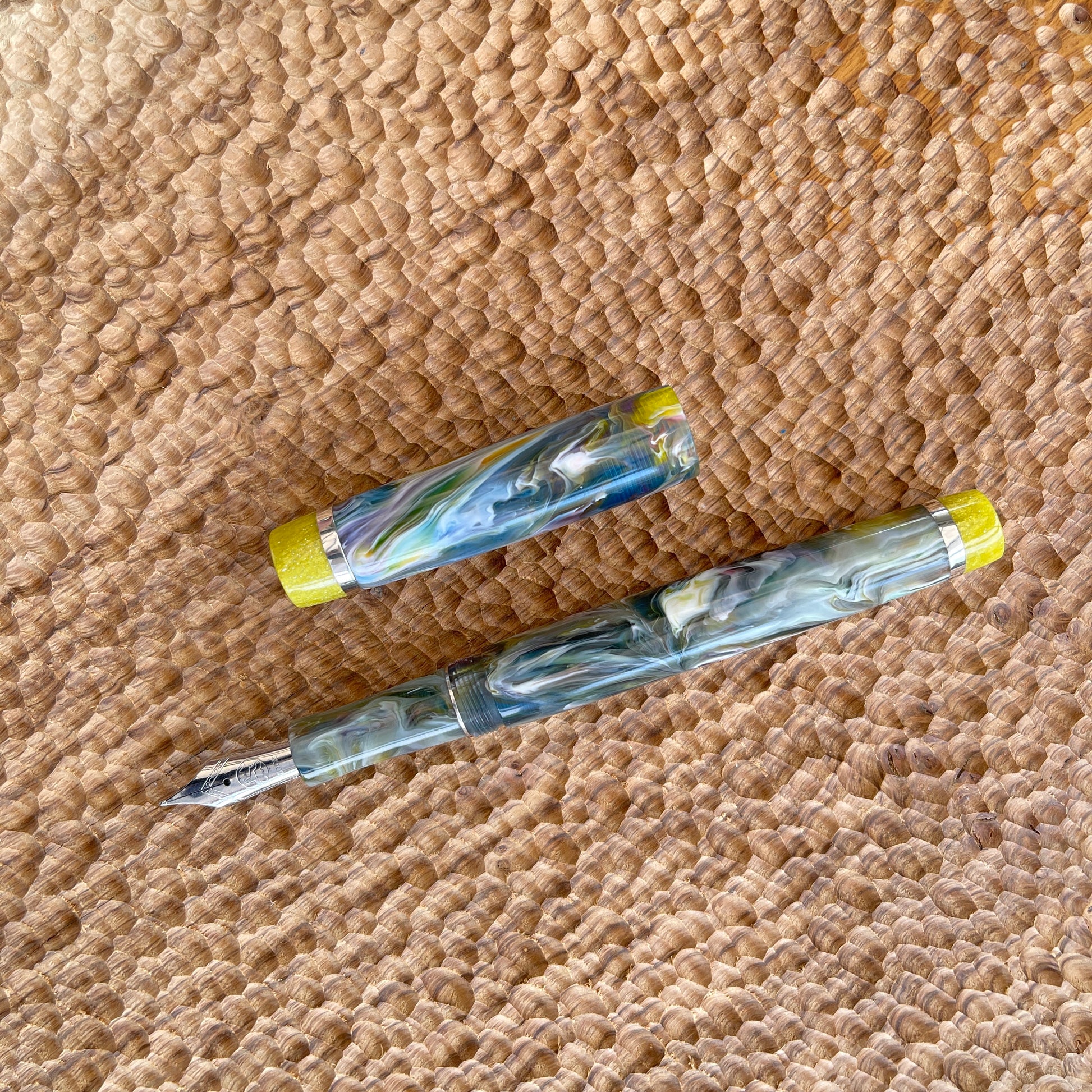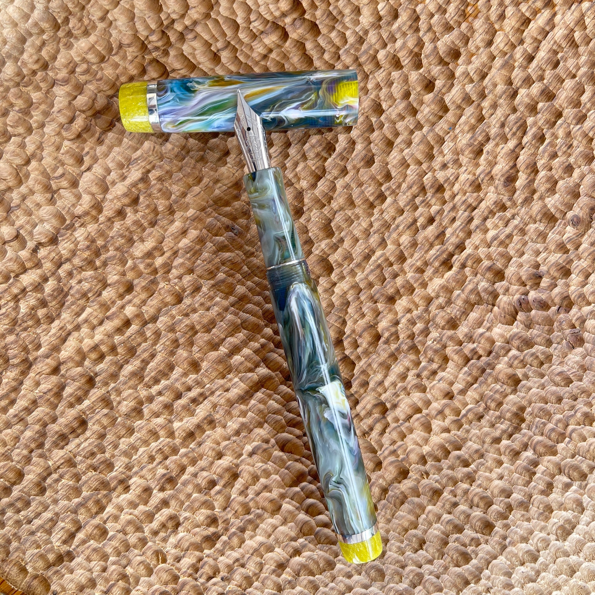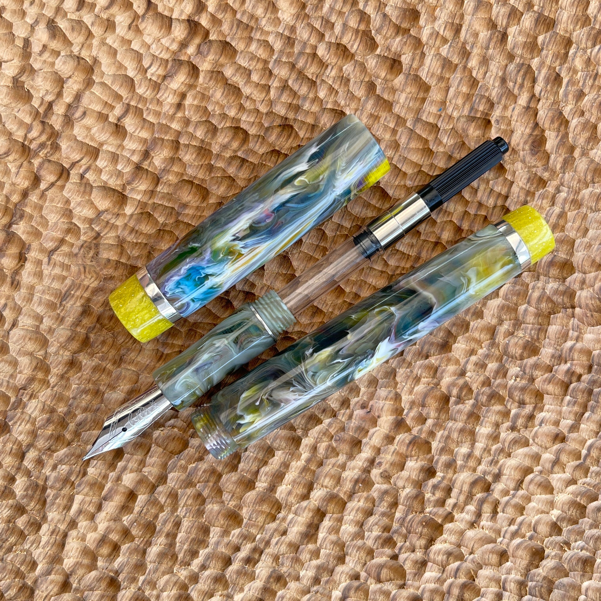 Pastel Palette Fountain Pen is a one-of-a-kind, hand-crafted pen made with acrylic resin and Argentium silver. It is polished to an ultra-fine finish to show off its amazing lustre. Fitted with a polished steel iridium tip Bock size six nib, it can also be fitted with a range of different nib tip sizes and materials, including gold, gold plate, rose gold plate, two-tone gold plate, and polished steel or titanium semi-flex steel. It also comes with a K5 premium ink converter and is compatible with standard international ink cartridges. The pen measures 145mm with the cap and 135mm without, with a body diameter of 13.5mm and a cap diameter of 14.5mm. The nib section tapers up to 12mm with a cap thread of 13mm.