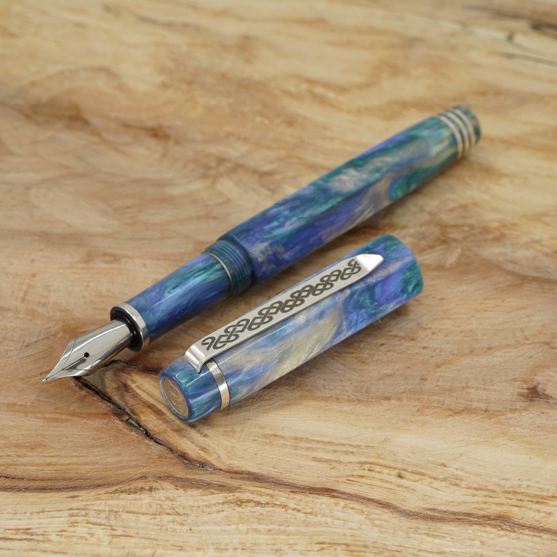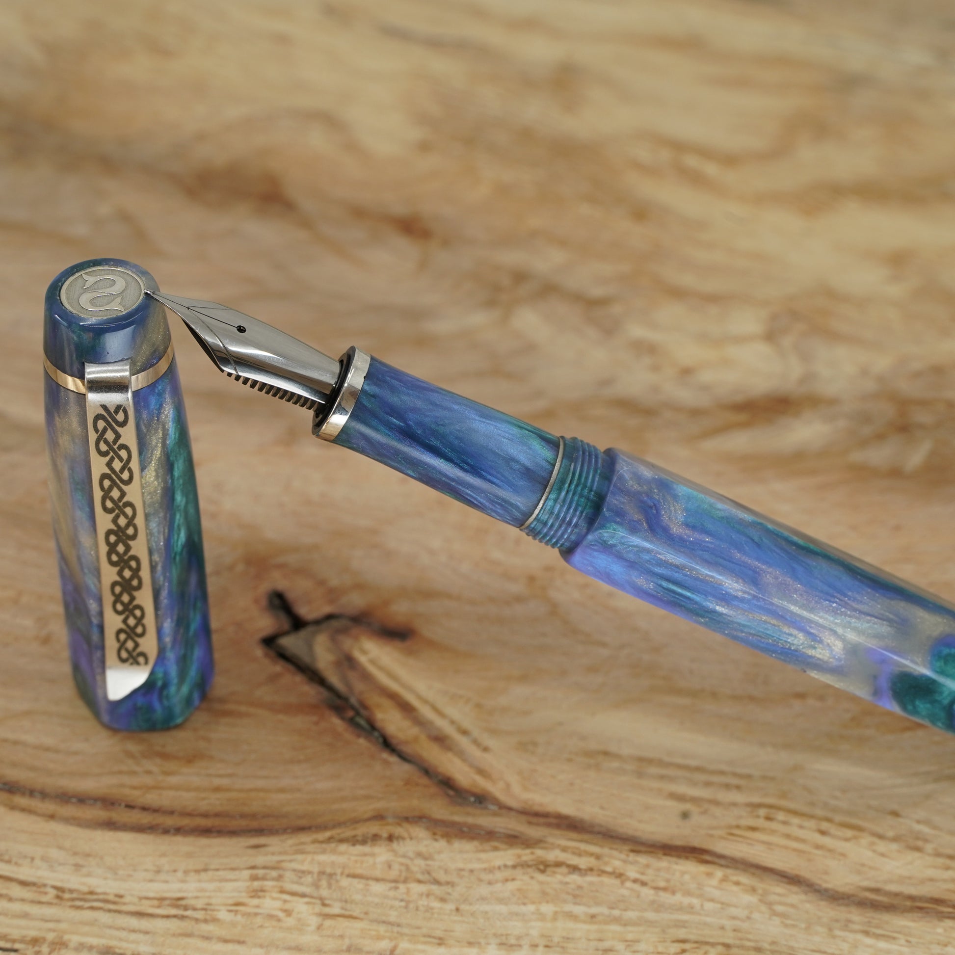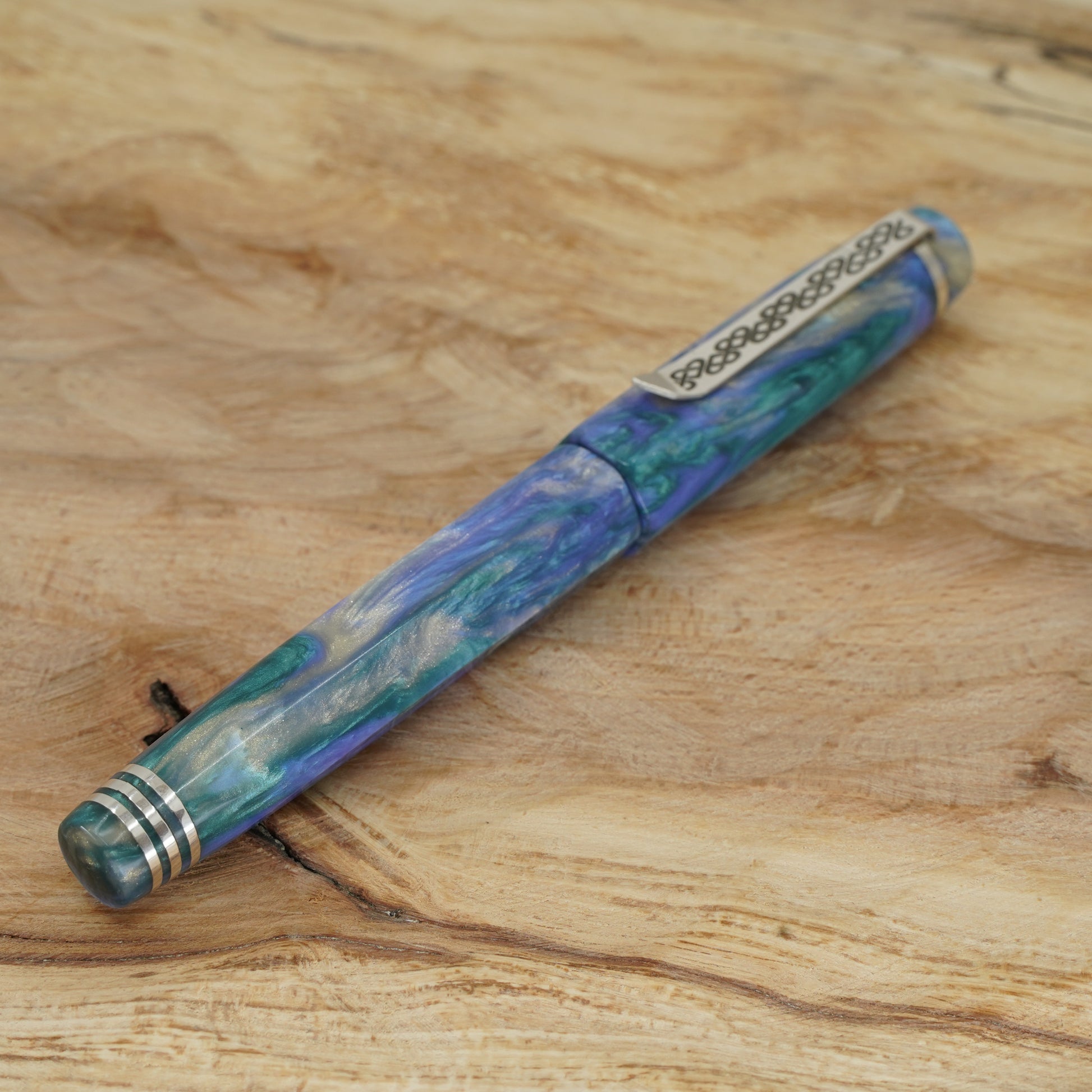Reflection Pool Hexagon with complimentary finials, fitted with a polished steel Jowo nib size 6. PEN SIZE: Approximately is 145m/m long including cap. 135m/m nib to body end. Body diameter 15m/m with a 13m/m thread. Cap diameter 16m/m. Nib make fitted is a Jowo size six polished steel medium tip other tip sizes available at no extra cost extra fine, fine, broad. The pen comes with a Schmidt K5 ink converter, other nibs are available; please contact john@silverburlpens.com to discuss alternatives and prices. I`ll be pleased to offer advice. A totally hand crafted pen including all the silver work.