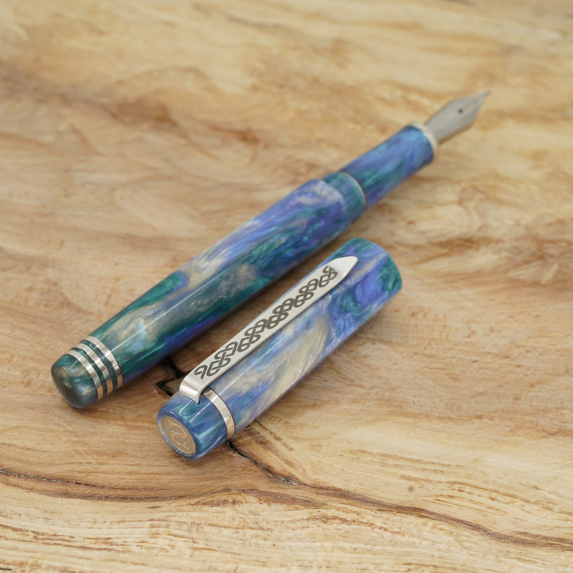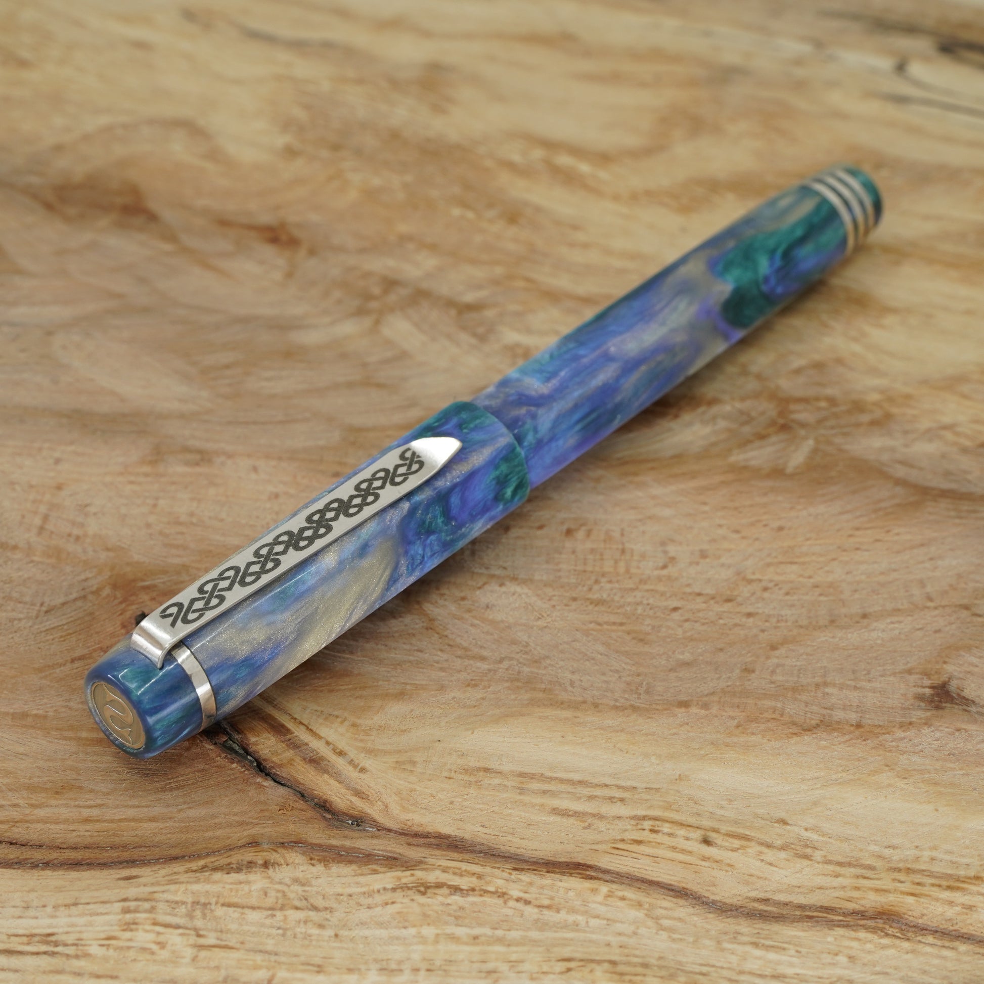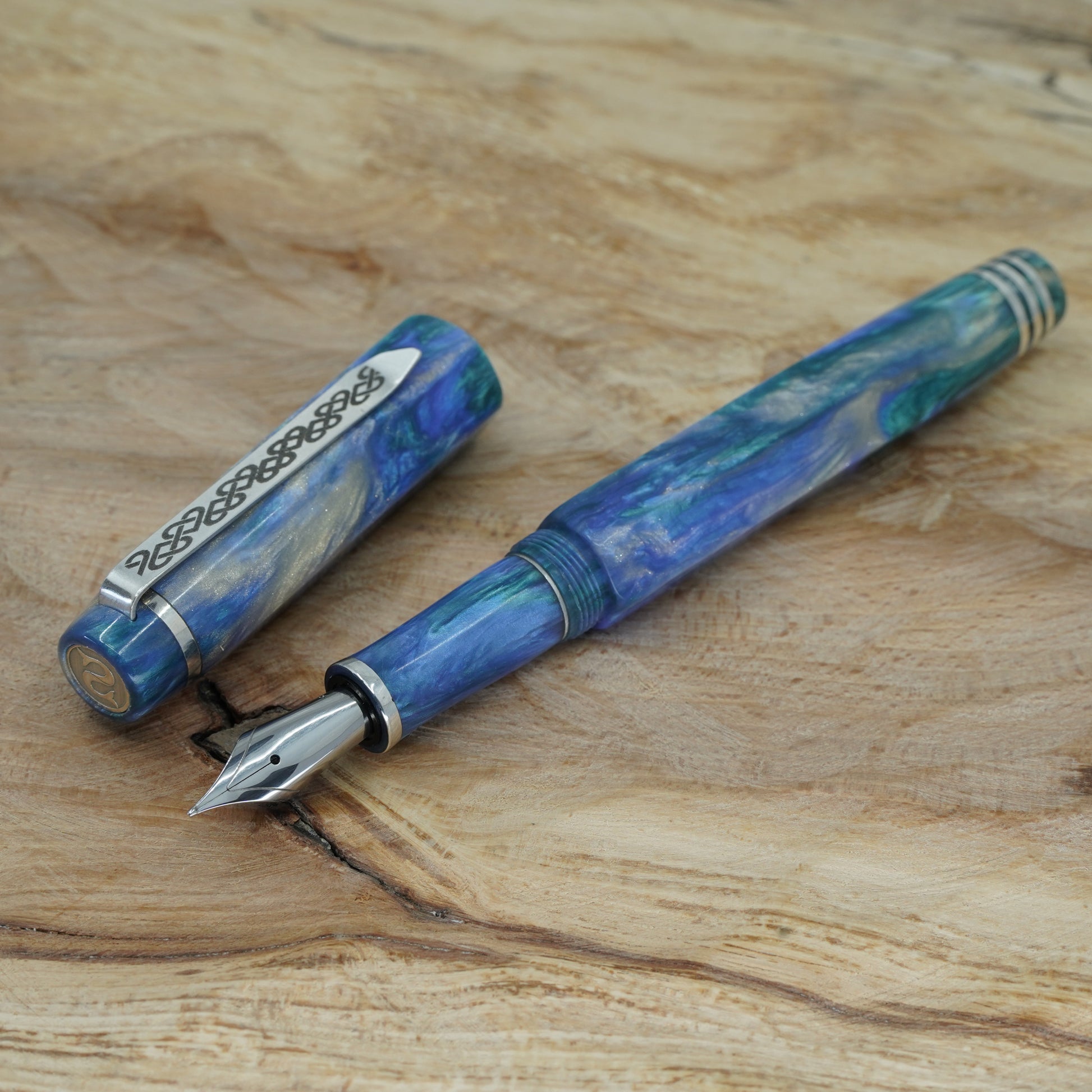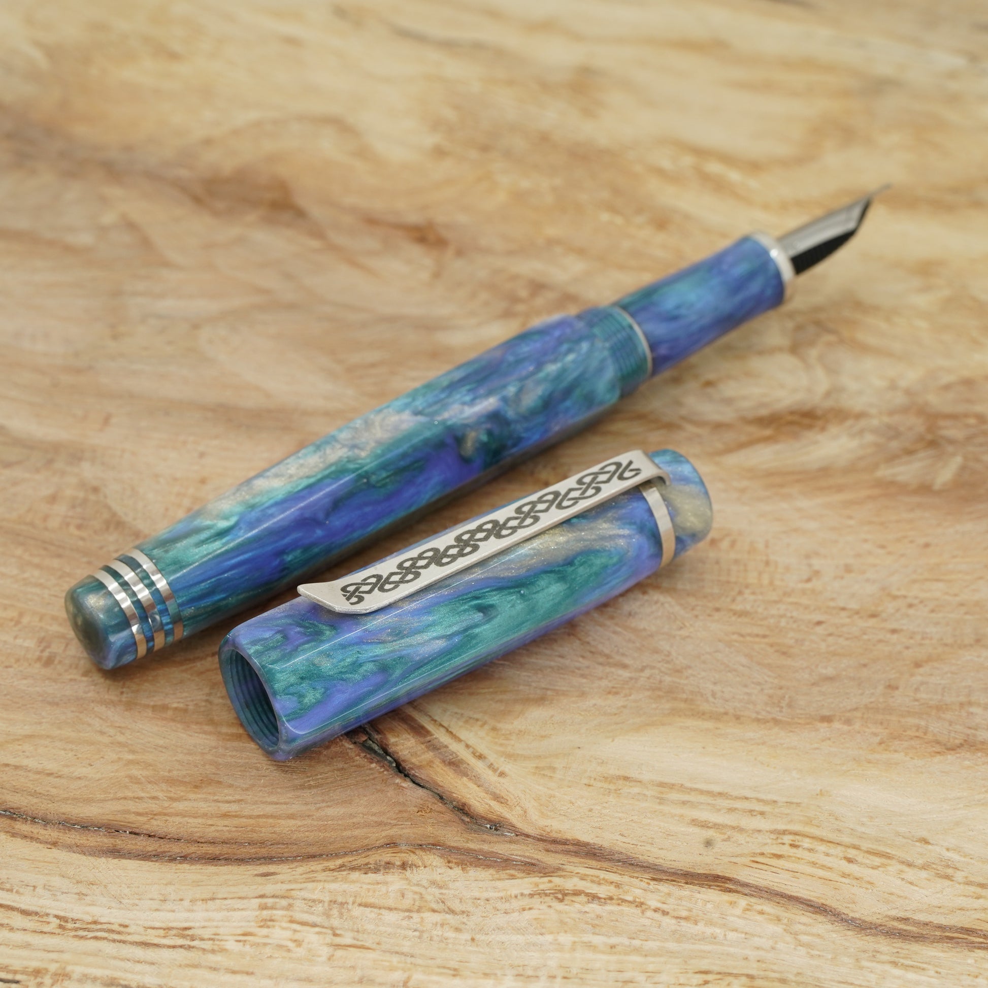 Reflection Pool Hexagon with complimentary finials, fitted with a polished steel Jowo nib size 6. PEN SIZE: Approximately is 145m/m long including cap. 135m/m nib to body end. Body diameter 15m/m with a 13m/m thread. Cap diameter 16m/m. Nib make fitted is a Jowo size six polished steel medium tip other tip sizes available at no extra cost extra fine, fine, broad. The pen comes with a Schmidt K5 ink converter, other nibs are available; please contact john@silverburlpens.com to discuss alternatives and prices. I`ll be pleased to offer advice. A totally hand crafted pen including all the silver work.