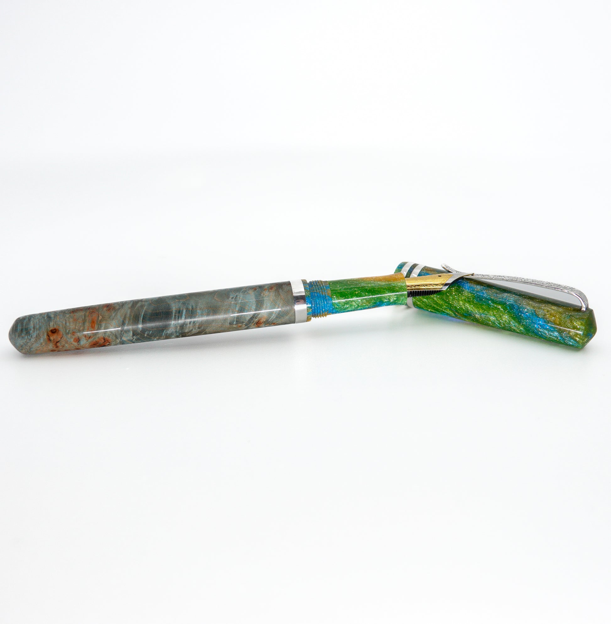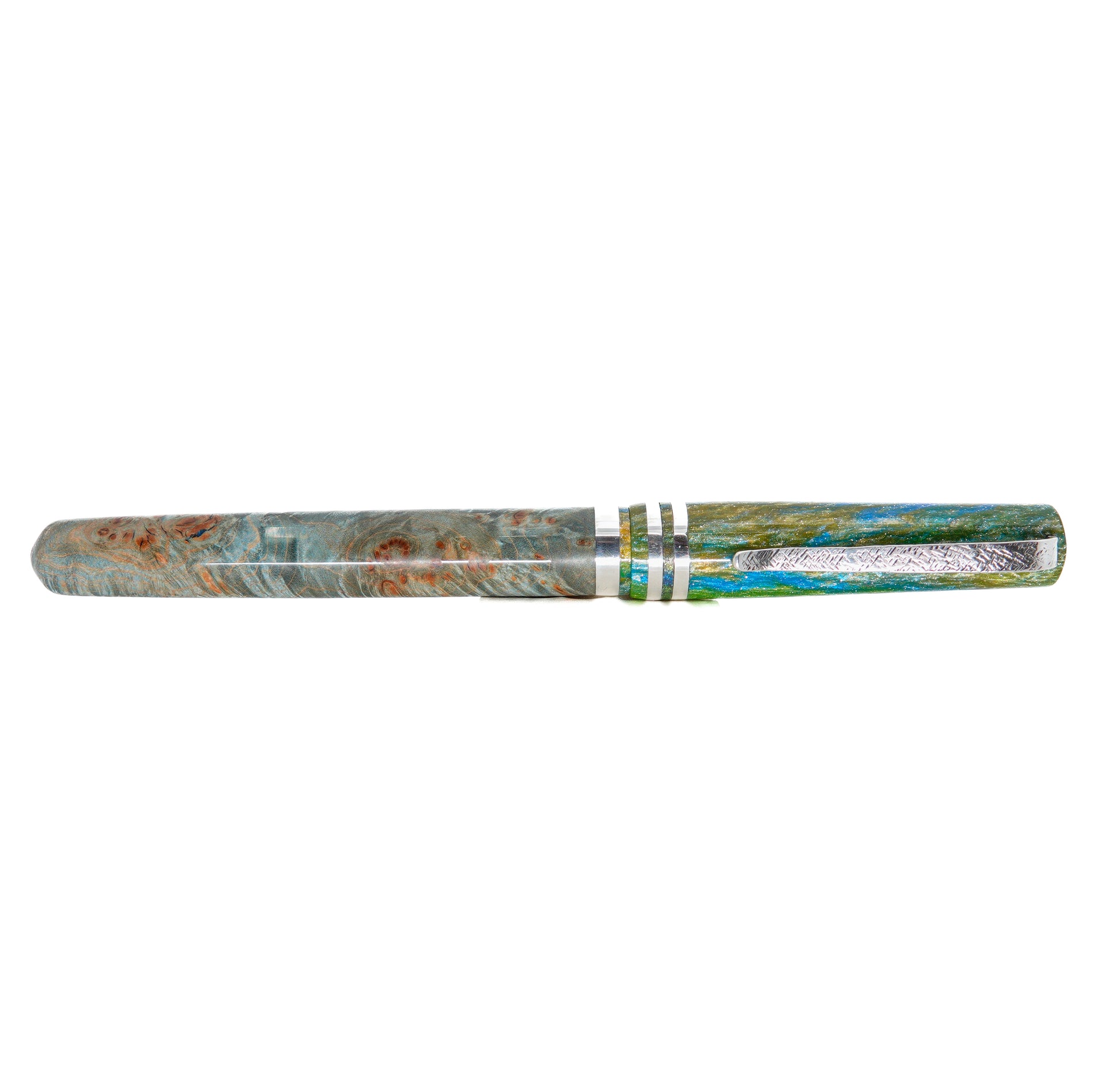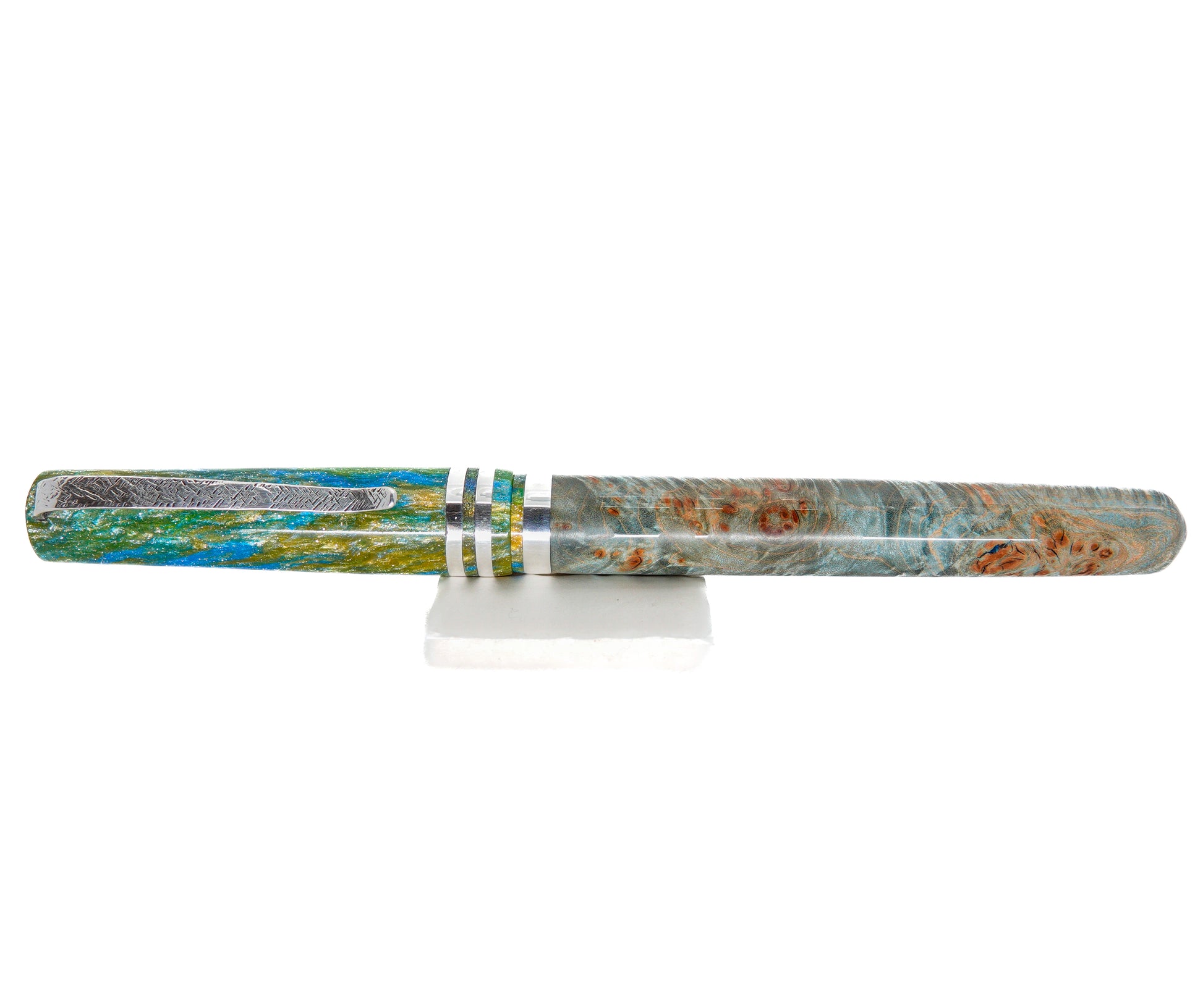 This Resin and Dyed Sweet Chestnut Hybrid fountain pen is handmade with a delightful alumilite resin matching pen cap and nib section. It is fitted with Argentium solid silver handmade pen clip and accent ring. This pen is a one of a kind, completely hand turned and polished to an ultra fine finish to show the amazing lustre achievable with this adorable material, all done by myself in my small home workshop. No pen kit used.