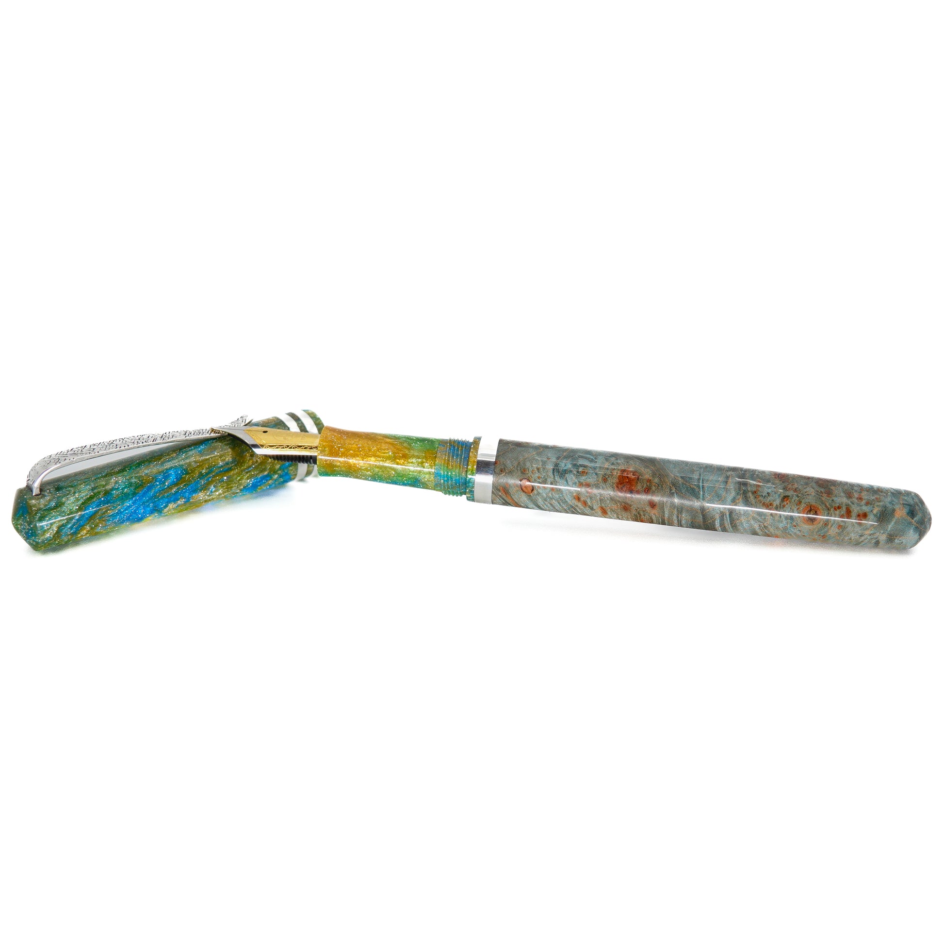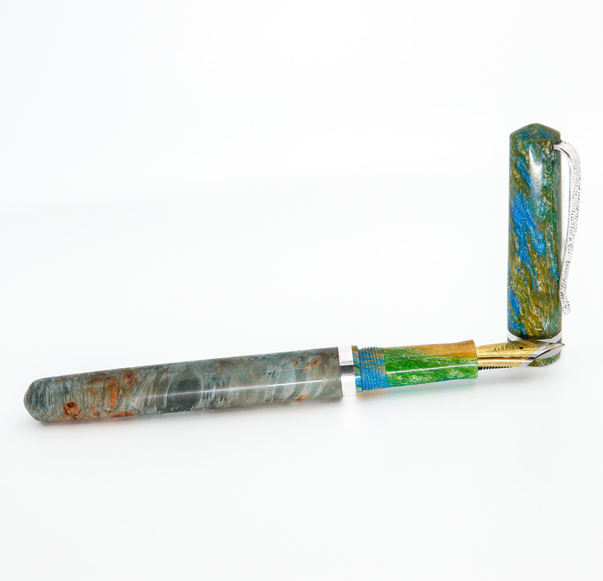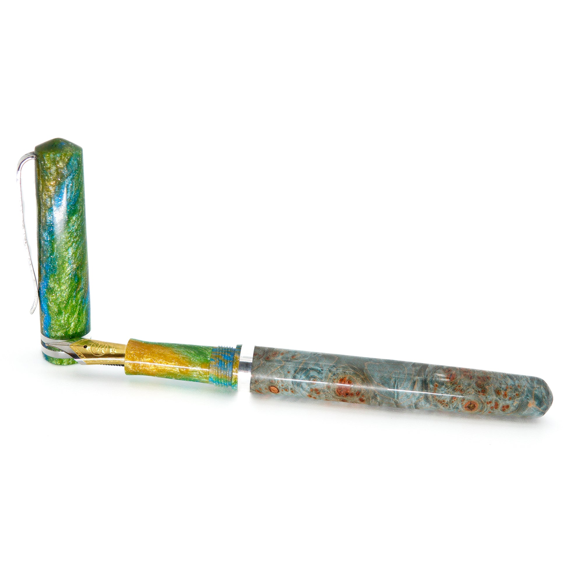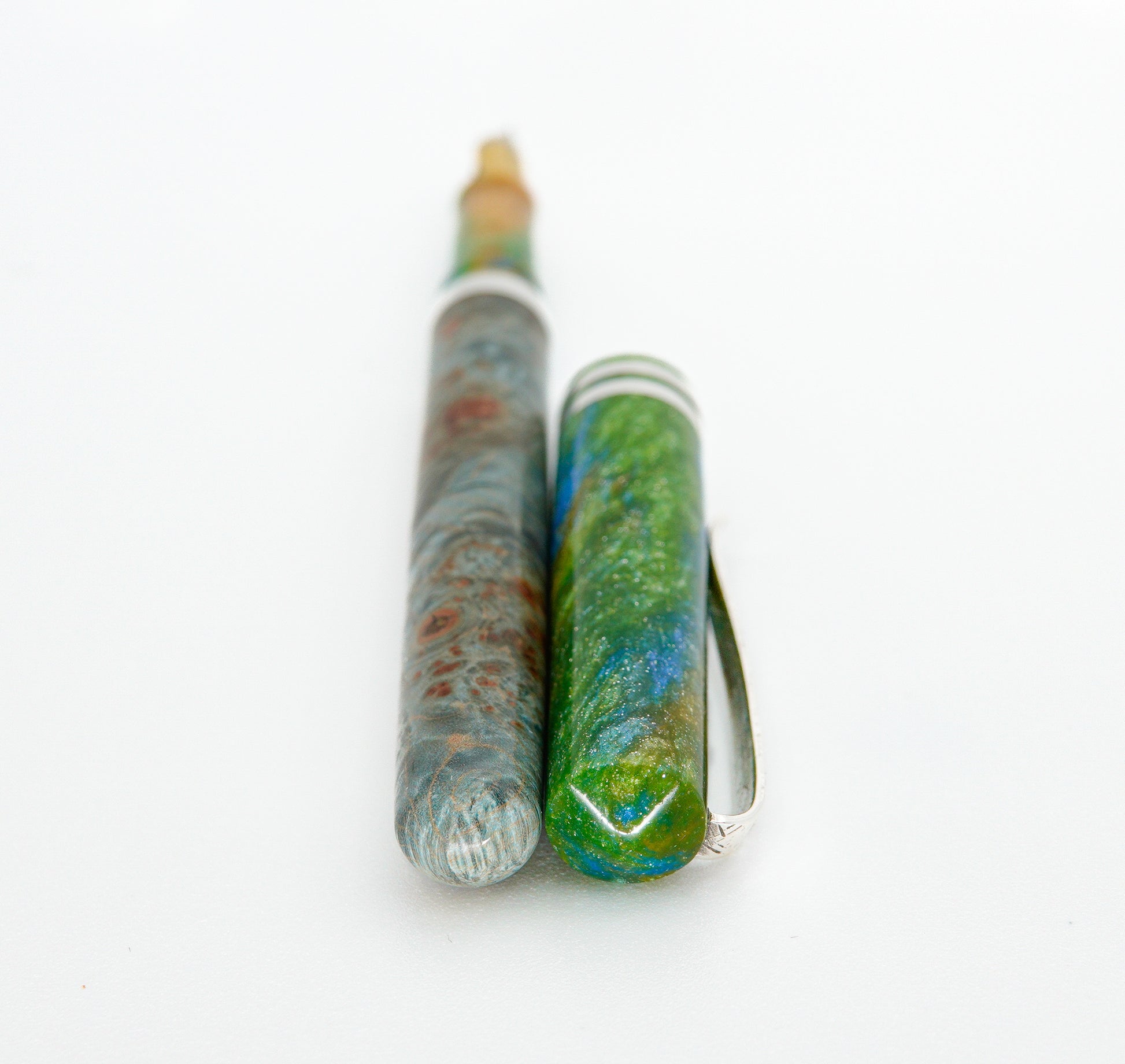 This Resin and Dyed Sweet Chestnut Hybrid fountain pen is handmade with a delightful alumilite resin matching pen cap and nib section. It is fitted with Argentium solid silver handmade pen clip and accent ring. This pen is a one of a kind, completely hand turned and polished to an ultra fine finish to show the amazing lustre achievable with this adorable material, all done by myself in my small home workshop. No pen kit used.