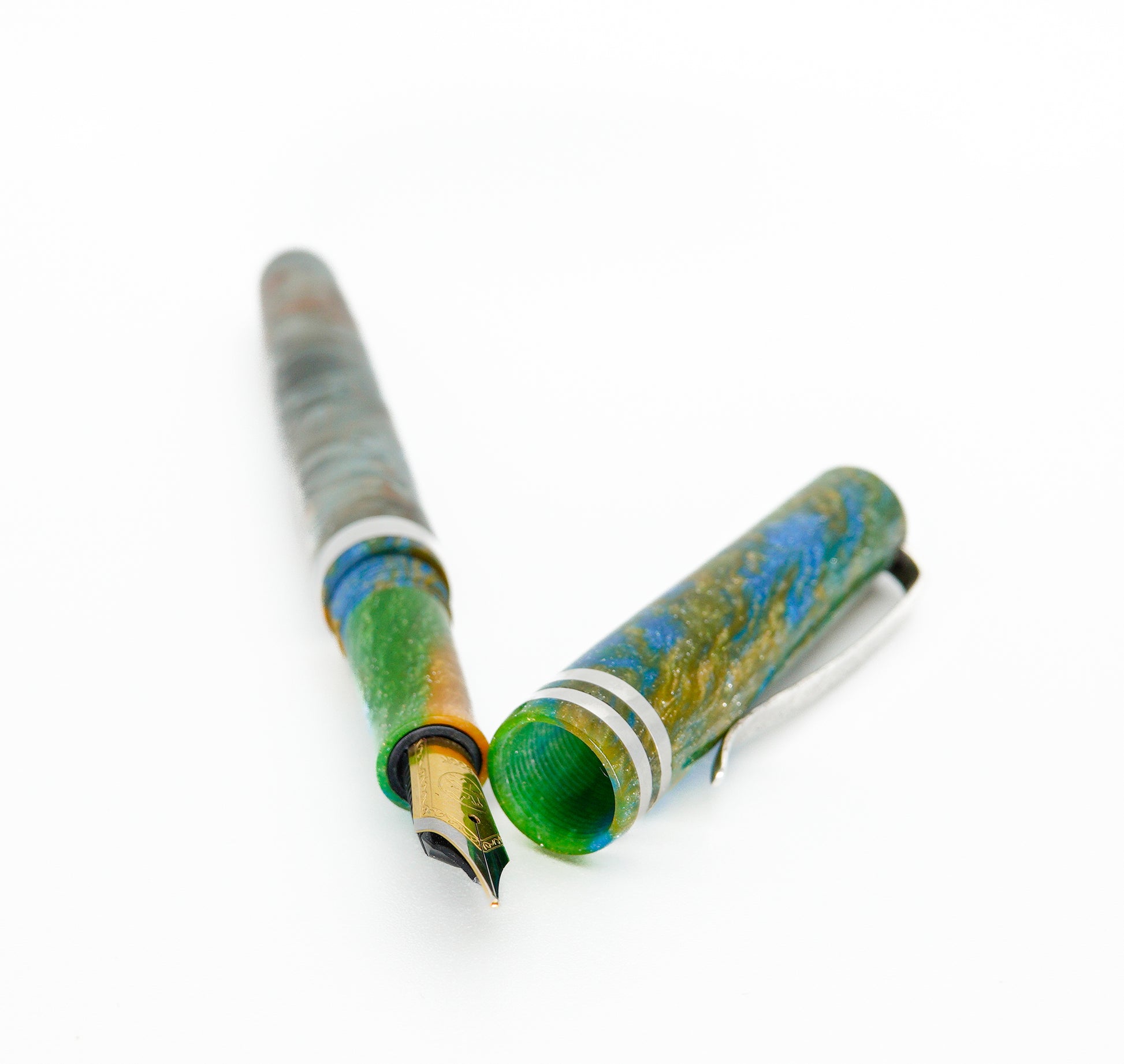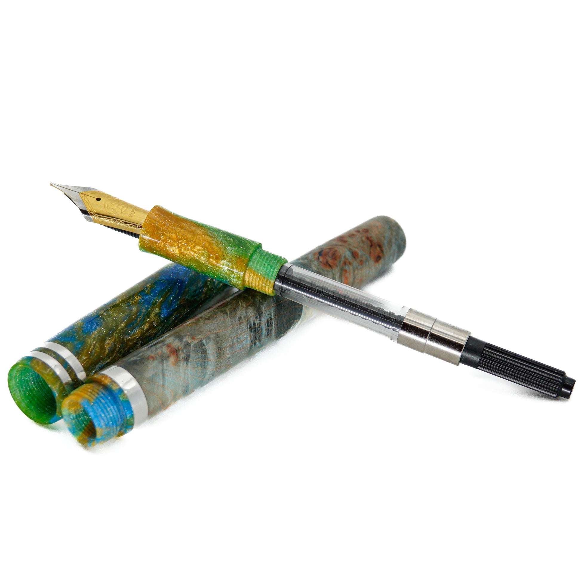 The level of craftmanship, time involved and quality is reflected in the price. I never make two pens the same. Fitted with polished steel iridium tip Bock nib - medium size 6. (Can be fitted with a range of different nib tip sizes and materials, Gold plate, Rose Gold plateTwo tone Gold plate , calligraphy nibs also available various premium nibs solid gold etc please contact in advance to discuss options, shipping times and pricing.) K5 Premium ink converter refilling system fitted also takes standard international ink cartridge.