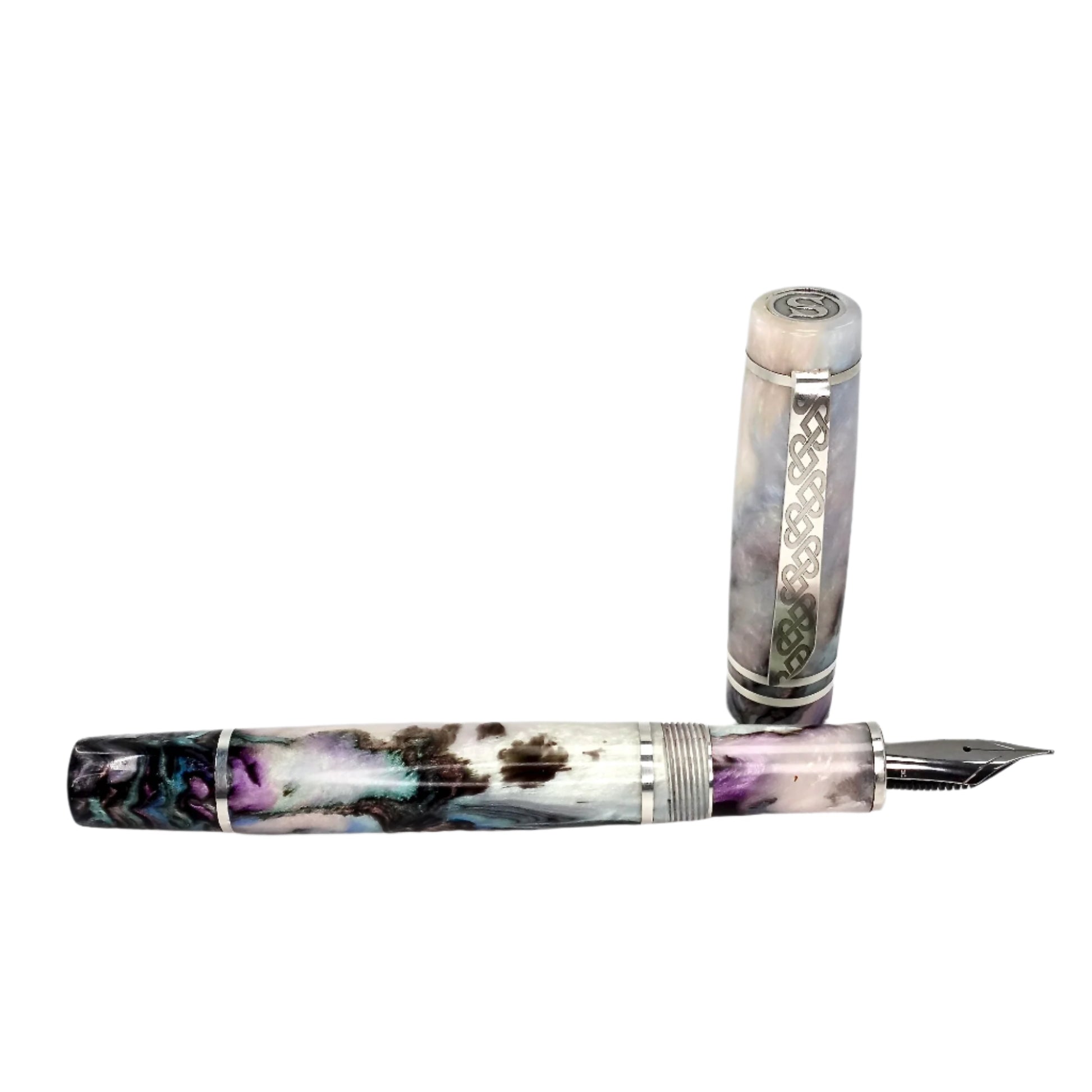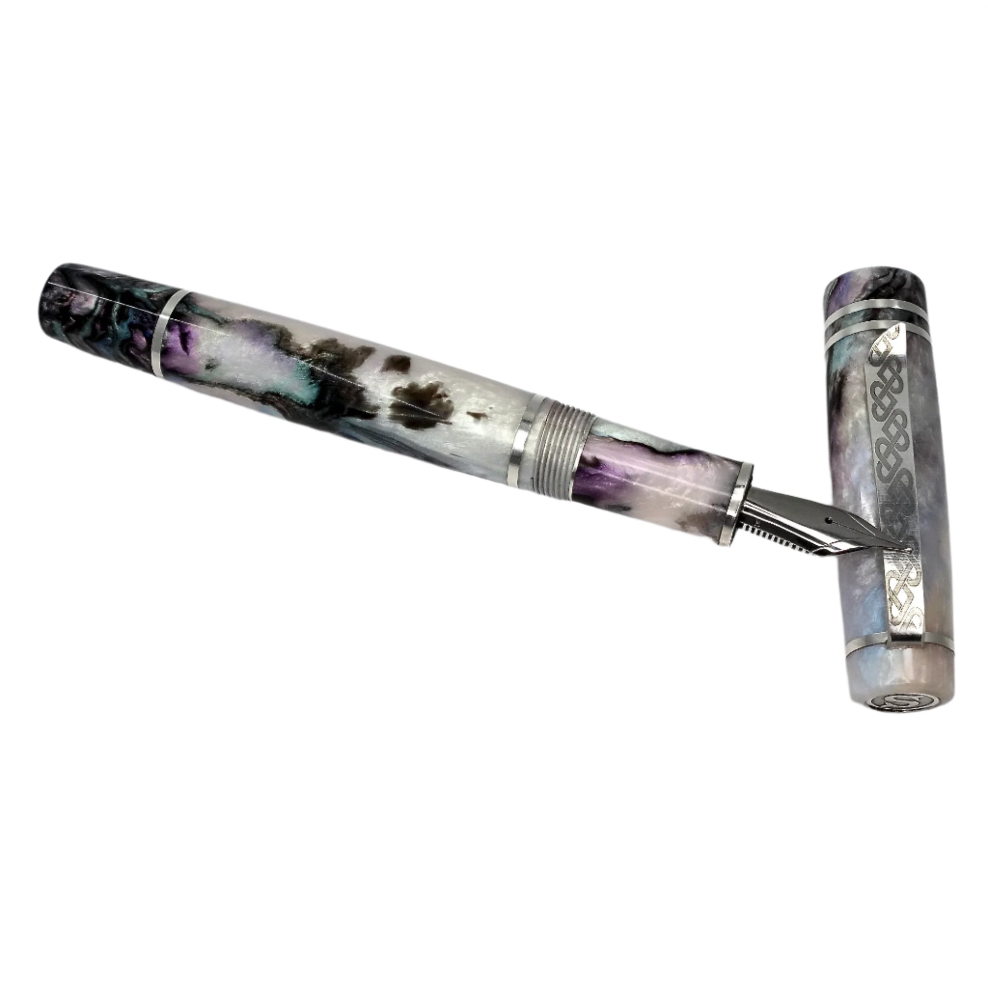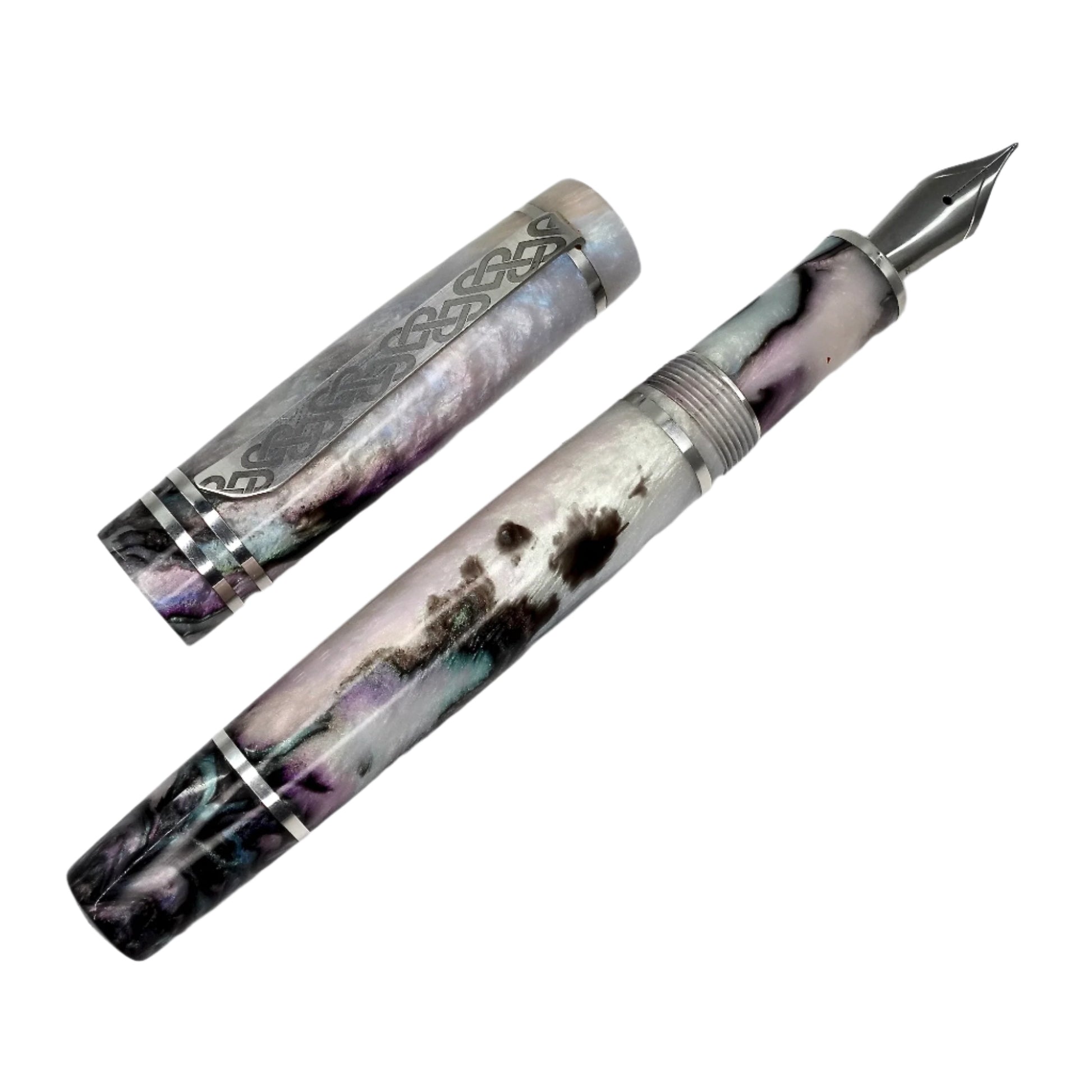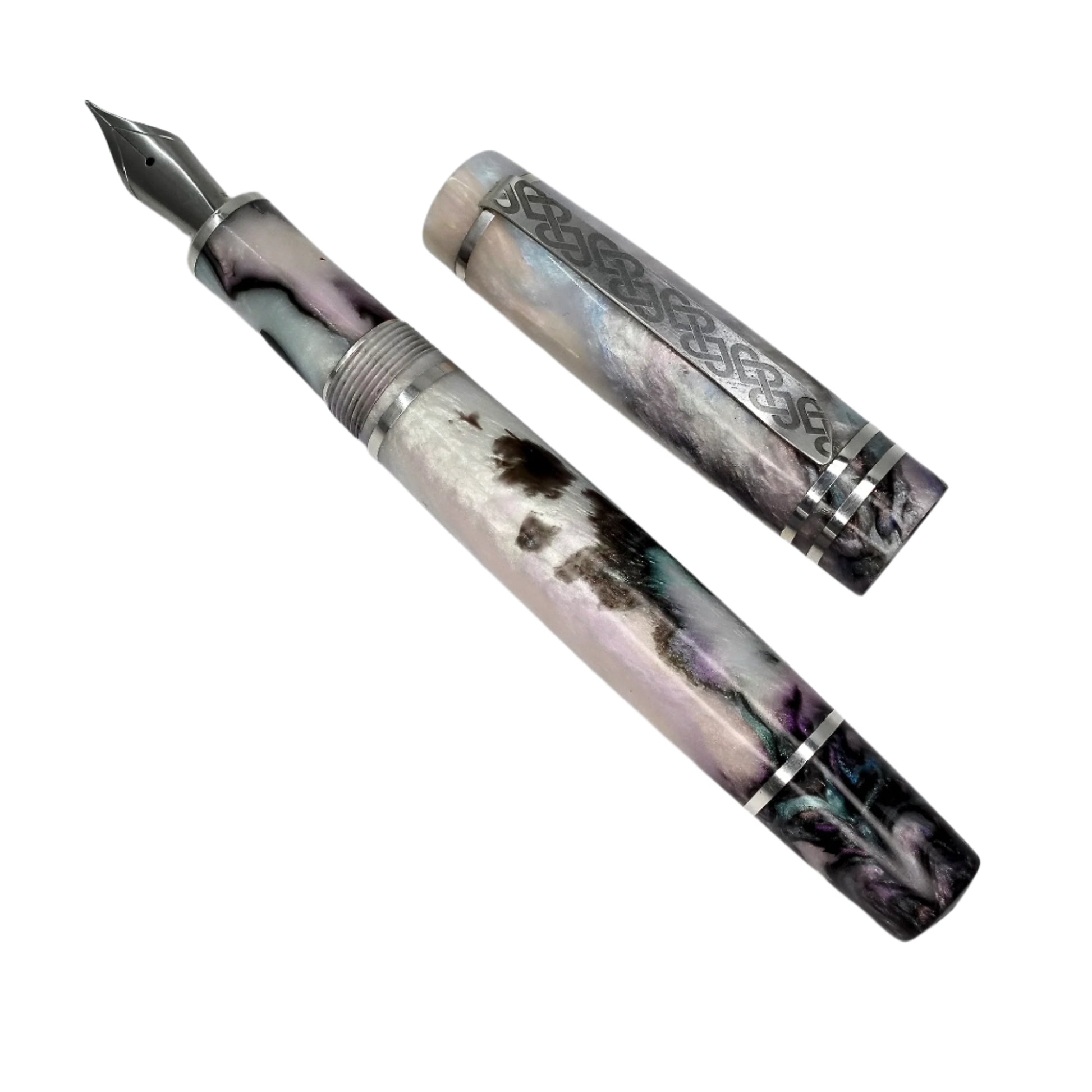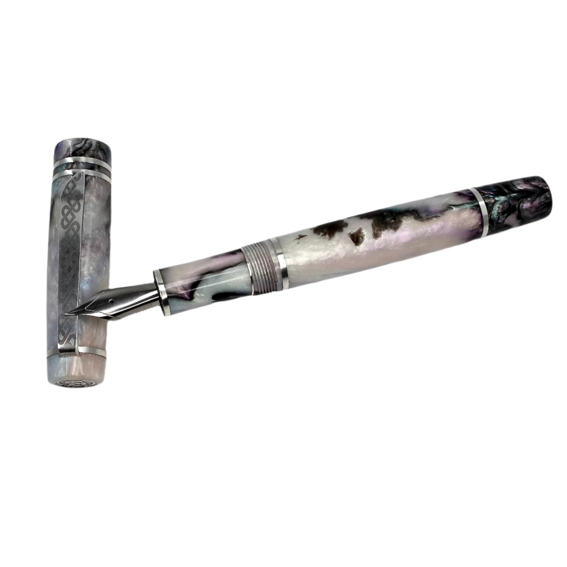 Black Abalone a  pen made from material created in house It features a polished steel Jowo nib size 6 and comes with a Schmidt K5 ink converter. Other nib sizes are available upon request. The pen measures approximately 145m/m long including the cap, 135m/m from nib to body end, and has a body diameter of 15m/m with a 14m/m thread. The cap diameter is 16m/m.