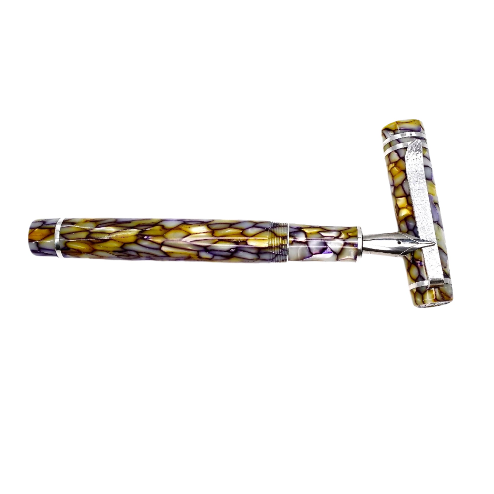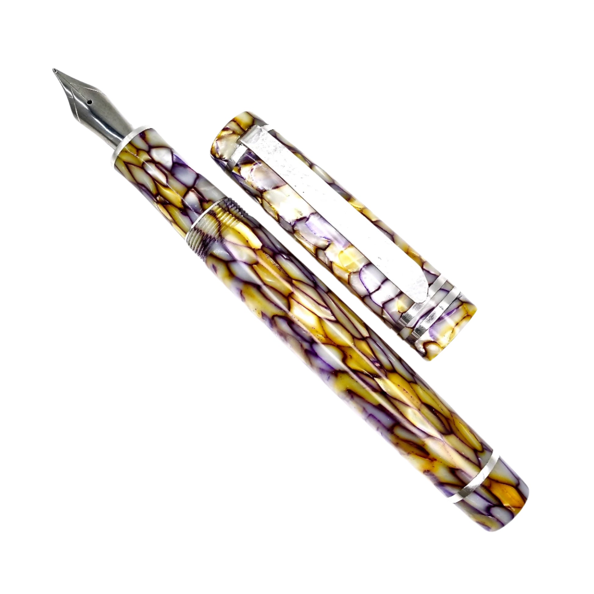 A pen made from Conway Stewart vintage Casein, It features a polished steel Jowo nib size 6 and comes with a Schmidt K5 ink converter. Other nib sizes are available upon request. The pen measures approximately 145m/m long including the cap, 135m/m from nib to body end, and has a body diameter of 15m/m with a 14m/m thread. The cap diameter is 16m/m.