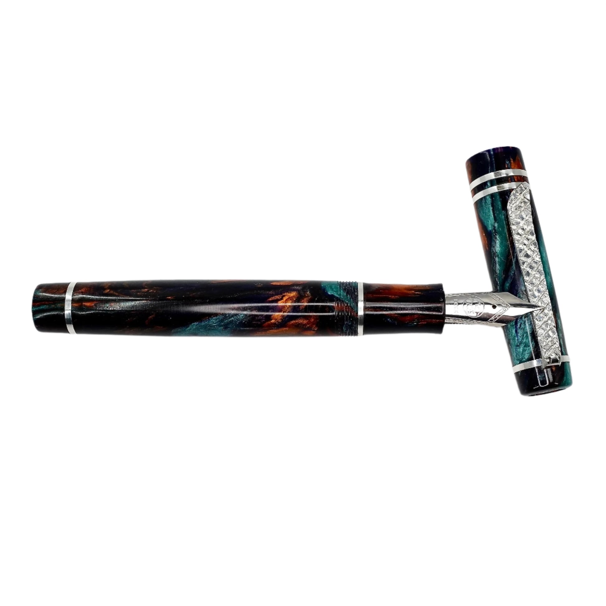 Step up your writing game with the size eight nib fountain pen. This pen from the Silver series is designed for the discerning writer who appreciates both style and functionality. this pen is perfect for slipping into your pocket or bag, or displaying on your desk. The pen is fitted with a size 8 medium tip size Polished steel Bock nib and large capacity TWSBI ink converter, see last image for a size comparison with a K5 converter, ensuring a smooth and effortless writing experience. The nib comes in the tip size of Medium but please contact for alternatives Contact john@silverburlpens.com for more information and pricing of other nibs. Pen Size: Overall length including cap 145m/m, nib tip to body end 135m/m, body diameter 15m/m, body to cap thread 15m/m triple start, cap diameter 16.5m/m, section diameter at narrowest point 13.5m/m. Indulge in the art of writing with our luxury Silver series pen. The sleek and slender 15mm body is designed for ease and elegance with a superior writing experience. Fine-tuned for the discerning writer, this pen is available in various nib sizes. Contact us for more information and pricing options. Pen size: overall length including cap 145m/m, nib tip to body end 135m/m, body diameter 16m/m, body to cap thread 15m/m triple start, cap diameter 16.5m/m, section diameter at narrowest point 13.5m/mPLEASE NOTE THIS PEN IS FITTED WITH A NIB TIP SIZE IN THE DECRYPTION CONTACT IF YOU NEED A DIFFERENT NIB OR TIP SIZE!!!!