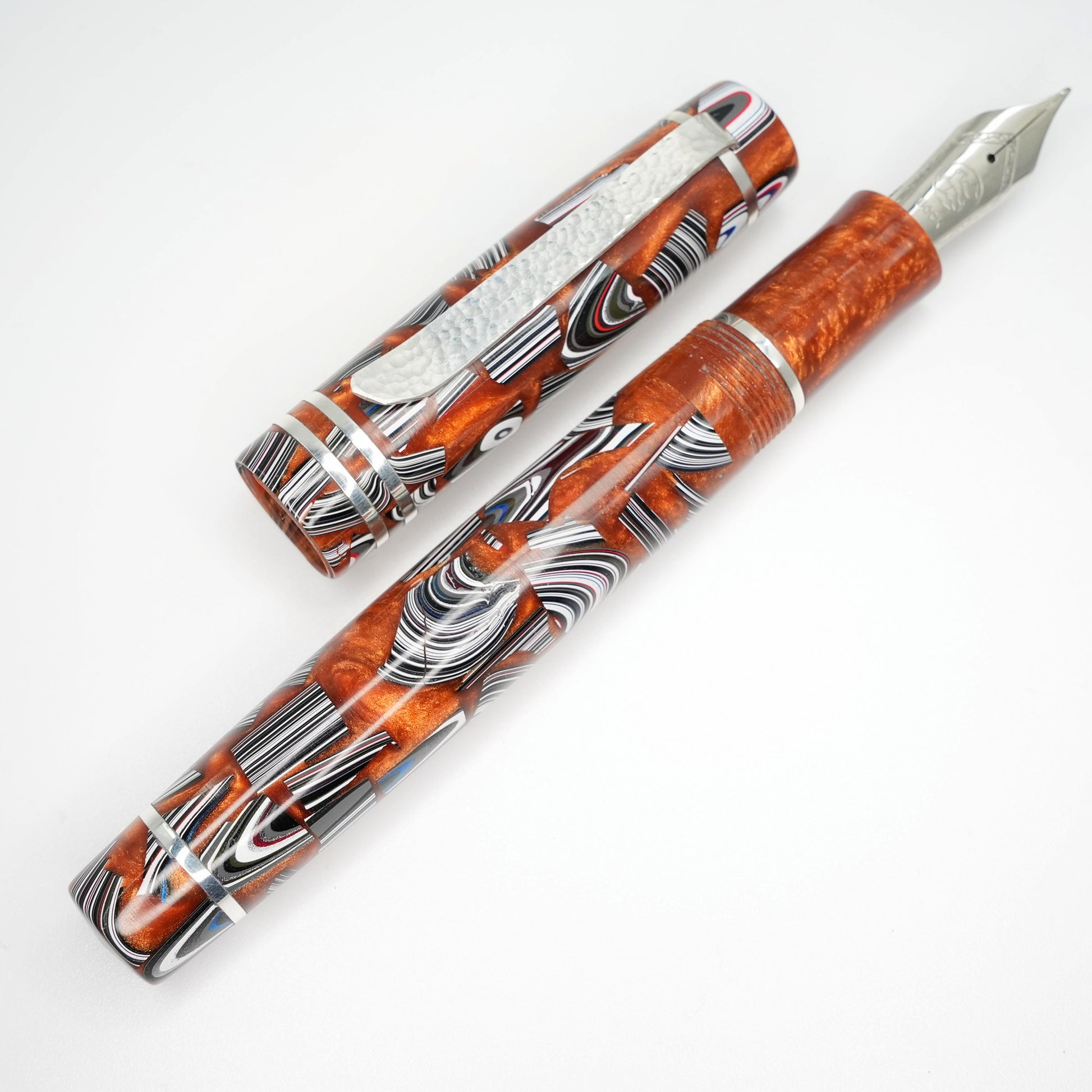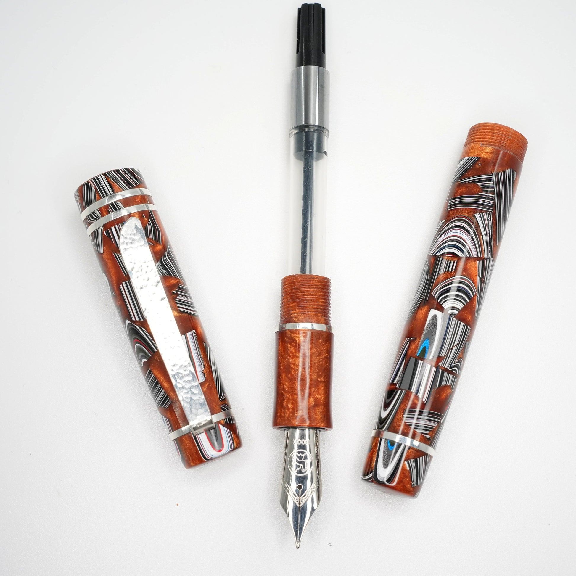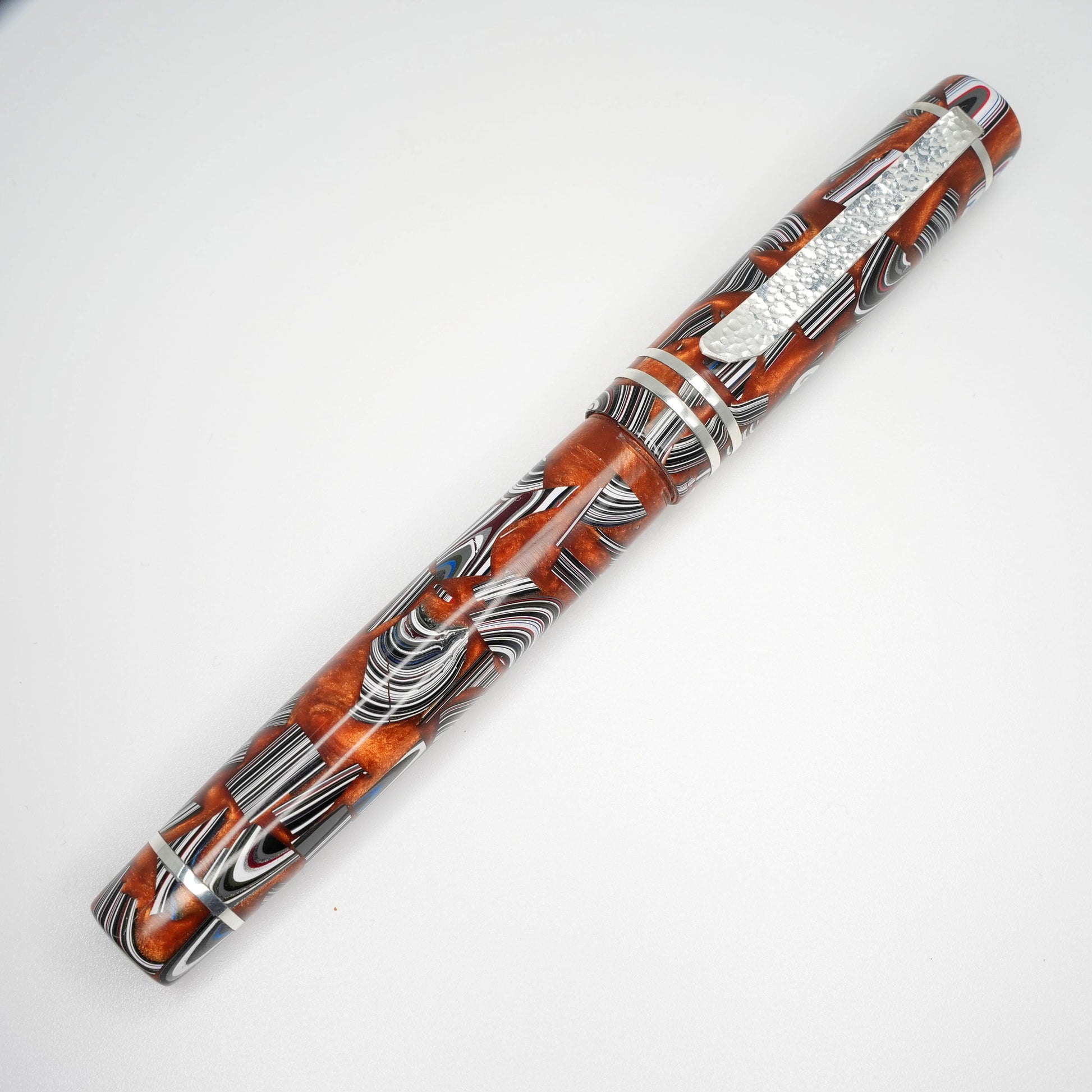 Made and cast in house using vintage fordite, this size eight nib fountain pen is a dream to hold and use. The pen from the Silver series is made using .940 argentium silver throughout designed for the discerning writer who appreciates both style and functionality. this pen is perfect for slipping into your pocket or bag, or displaying on your desk. The pen is fitted with a size 8 nib, medium tip size Polished steel Bock nib and large capacity TWSBI ink converter, ensuring a smooth and effortless writing experience. The nib fitted is a polished steel Bock Medium but please contact for alternatives Contact john@silverburlpens.com for more information and pricing of other nibs. Pen Size: Overall length including cap 150m/m, nib tip to body end 138m/m, body diameter 15.5m/m, body to cap thread 15m/m triple start, cap diameter 16.5m/m, section diameter at narrowest point 12.5m/m. Indulge in the art of writing with our luxury Silver series pen. The sleek 15mm body is designed for ease and elegance with a superior writing experience. Fine-tuned for the discerning writer, this pen is available in various nib sizes. Contact us for more information and pricing options. Pen size: overall length including cap 145m/m, nib tip to body end 135m/m, body diameter 16m/m, body to cap thread 15m/m triple start, cap diameter 16.5m/m, section diameter at narrowest point 13.5m/mPLEASE NOTE THIS PEN IS FITTED WITH A NIB TIP SIZE IN THE DECRYPTION CONTACT IF YOU NEED A DIFFERENT NIB OR TIP SIZE!!!!