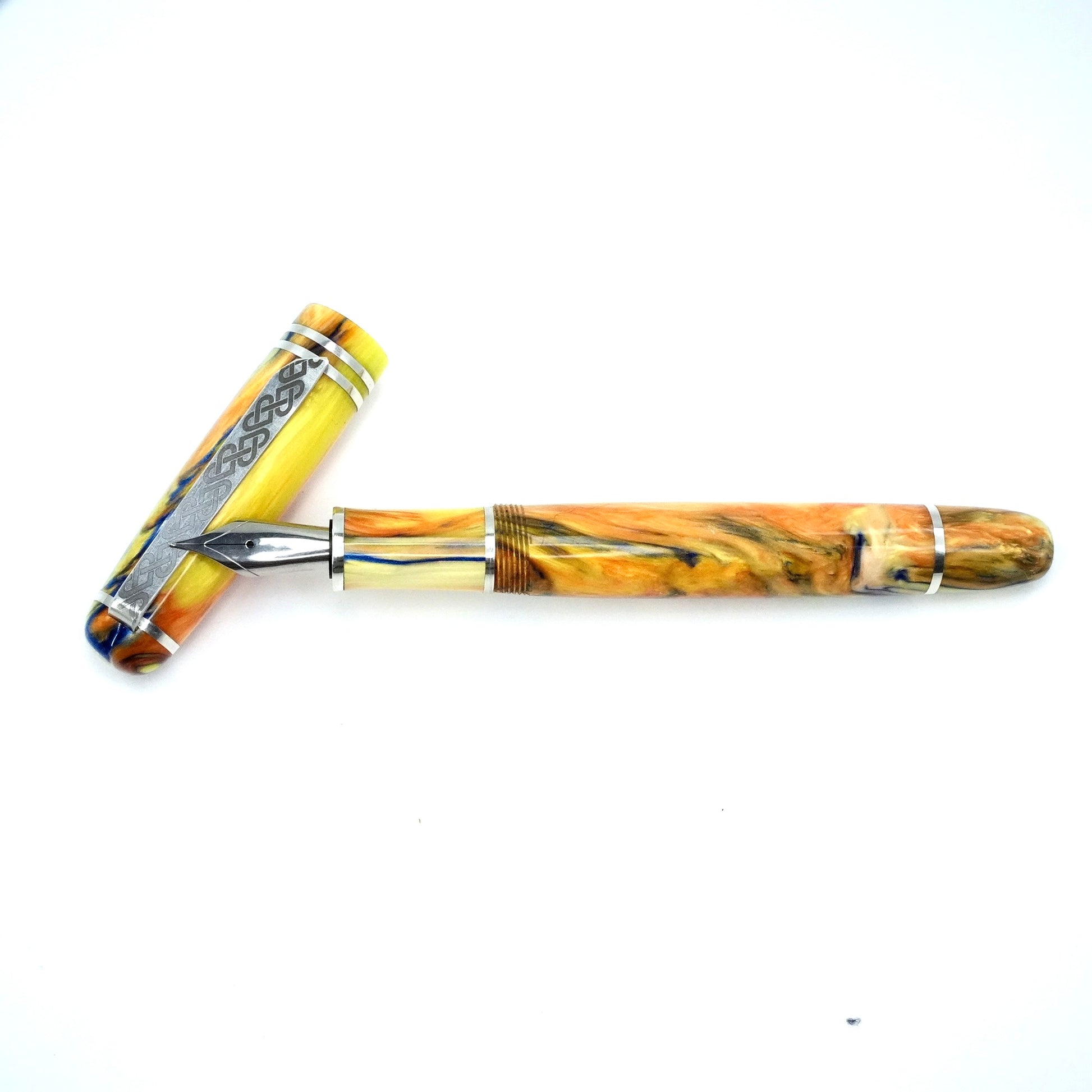 Calypso a  pen made from material created by the Carolina Pen Co. It features a polished steel Jowo nib size 6 and comes with a Schmidt K5 ink converter. Other nib sizes are available upon request. The pen measures approximately 145m/m long including the cap, 135m/m from nib to body end, and has a body diameter of 15m/m with a 14m/m thread. The cap diameter is 16m/m.