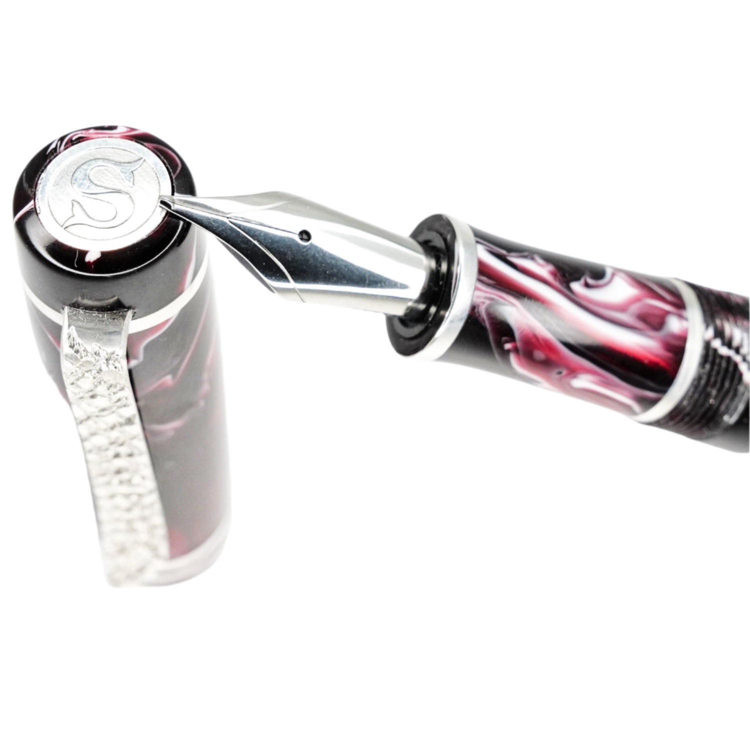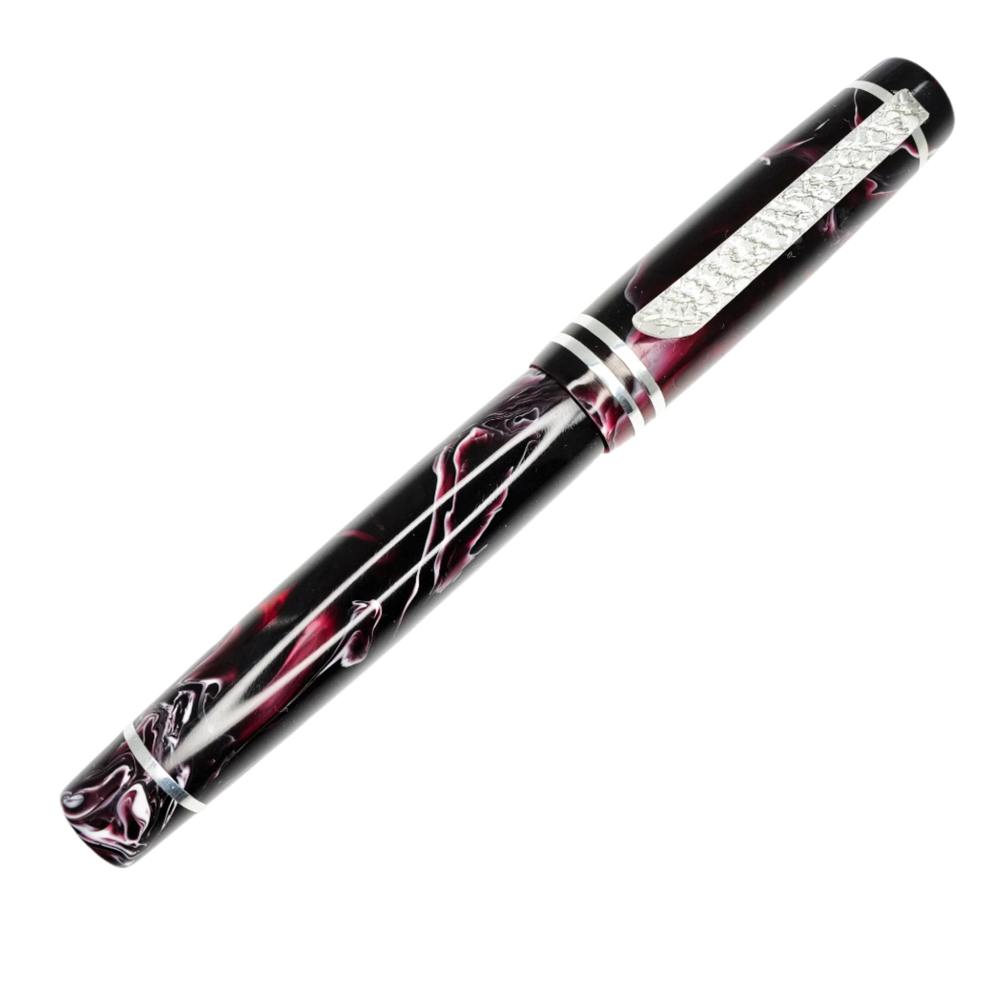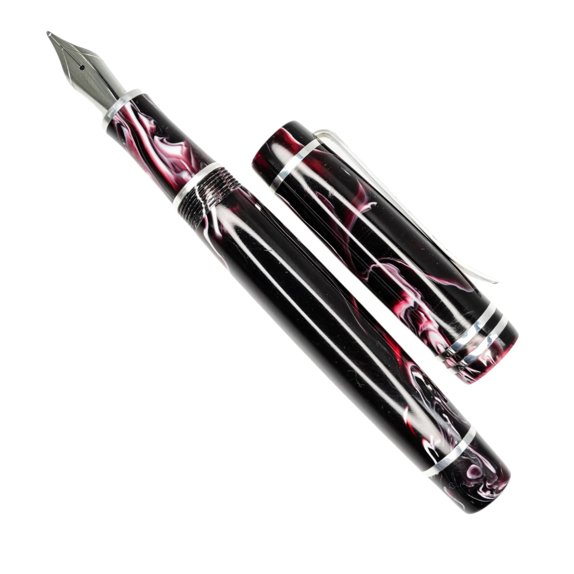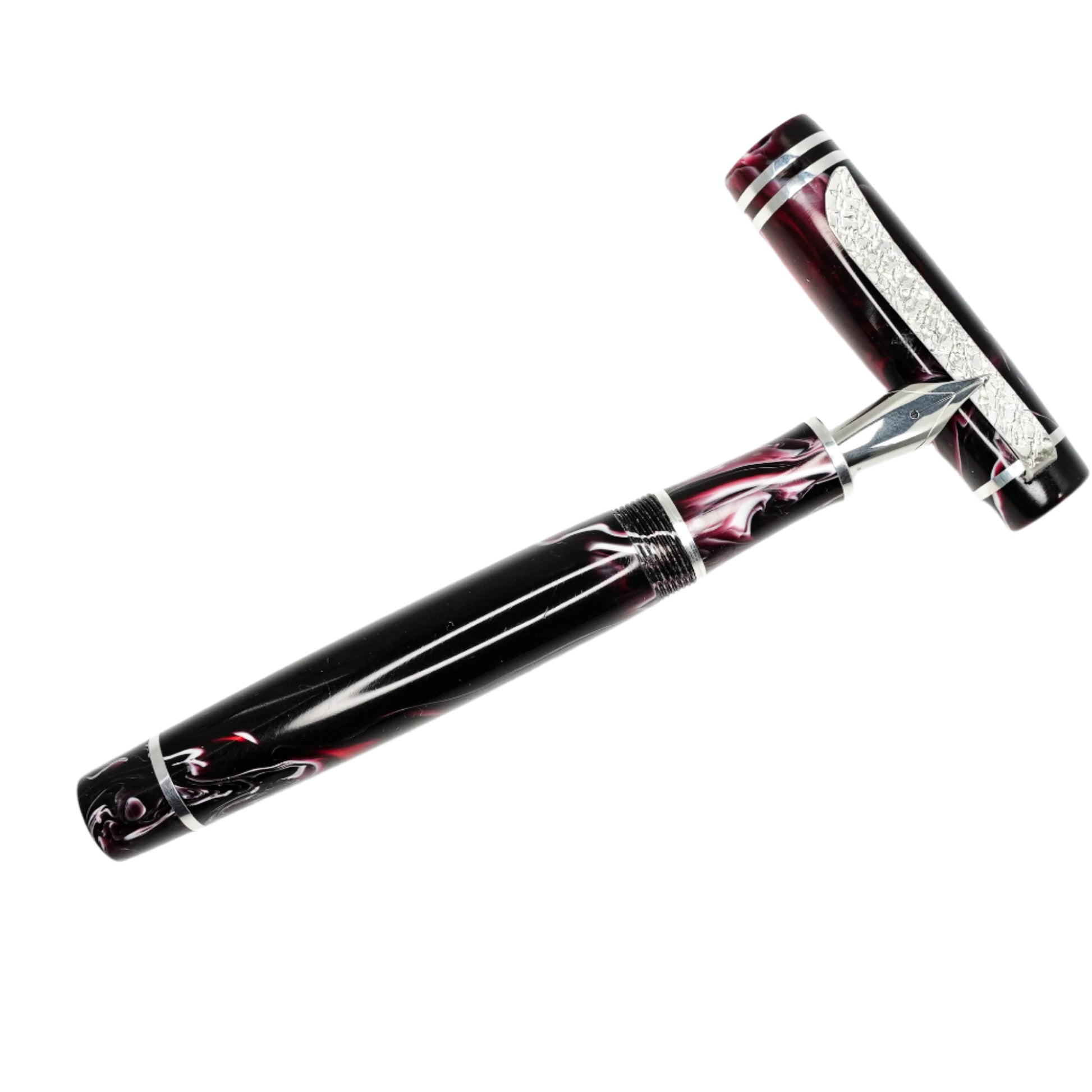 A pen made from material created by the Carolina pen co, It features a polished steel Jowo nib size 6 and comes with a Schmidt K5 ink converter. Other nib sizes are available upon request. The pen measures approximately 145m/m long including the cap, 135m/m from nib to body end, and has a body diameter of 15m/m with a 14m/m thread. The cap diameter is 16m/m.