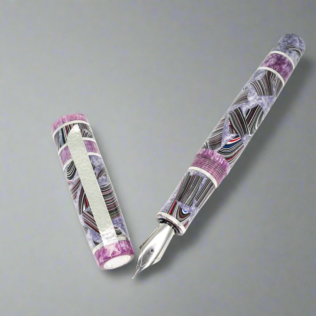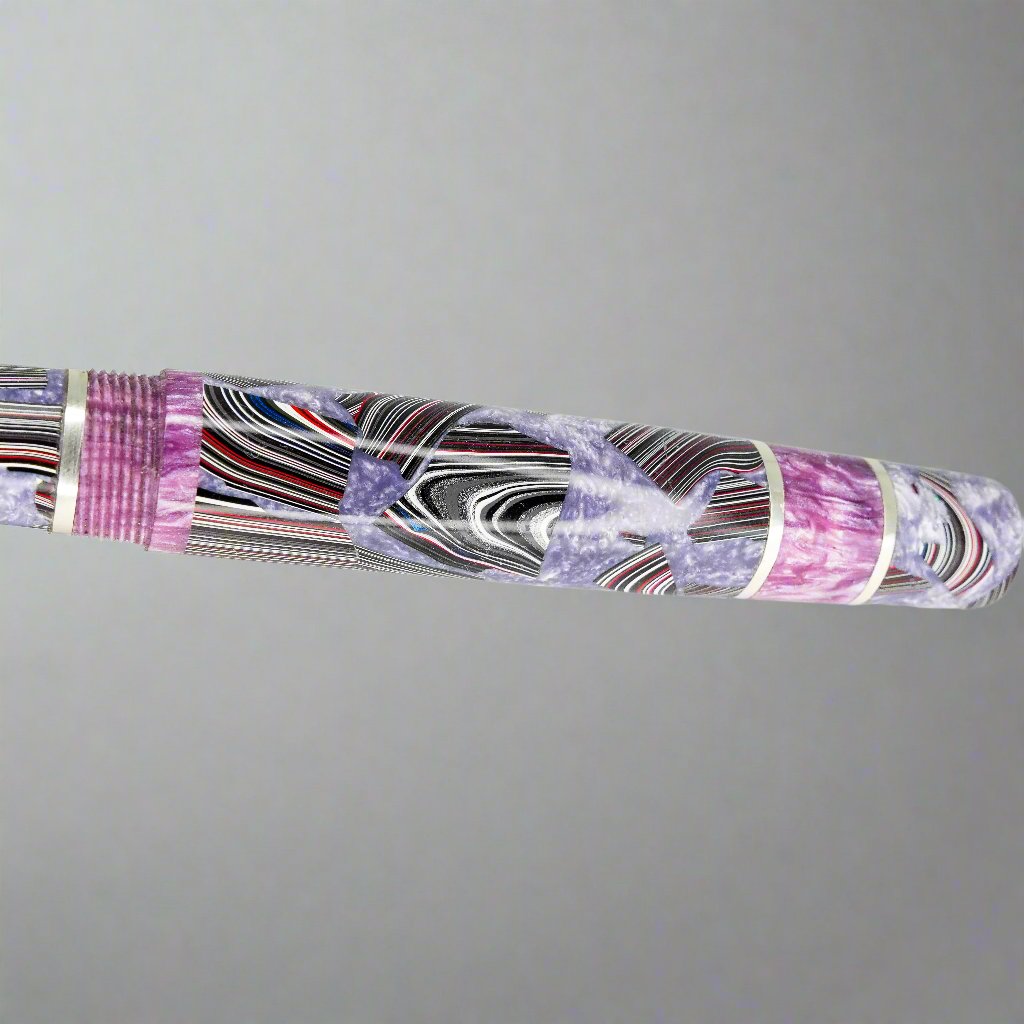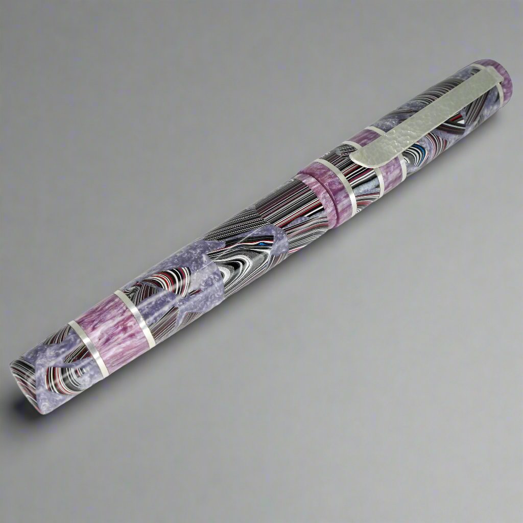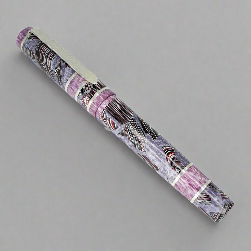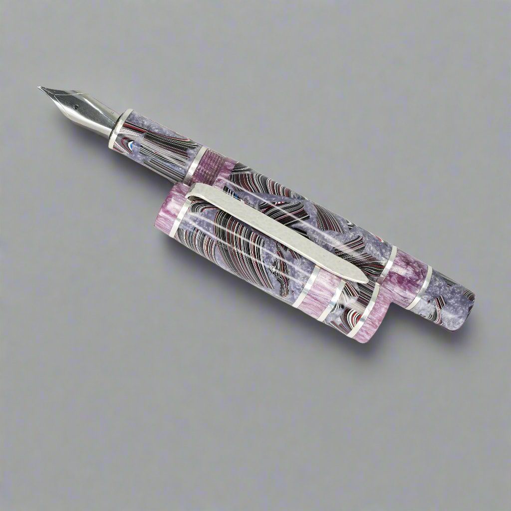 This vintage Fordite is carefully handcrafted and preserved in resin, showcasing the stunning layers of automotive paint slag from decades ago. Made with .940 argentium silver and a size six Jowo nib, this pen is both durable and stylish. Indulge in the rich history and unique beauty of a byproduct that was once discarded, and add this remarkable piece to your collection. Choose your preferred nib size before checkout and enjoy the smooth ink filling system with a Schmidt K5 converter. Don't miss out on the opportunity to own a piece of automotive history.