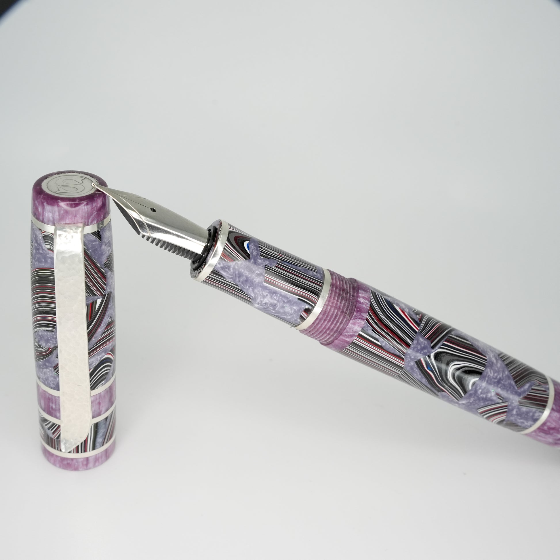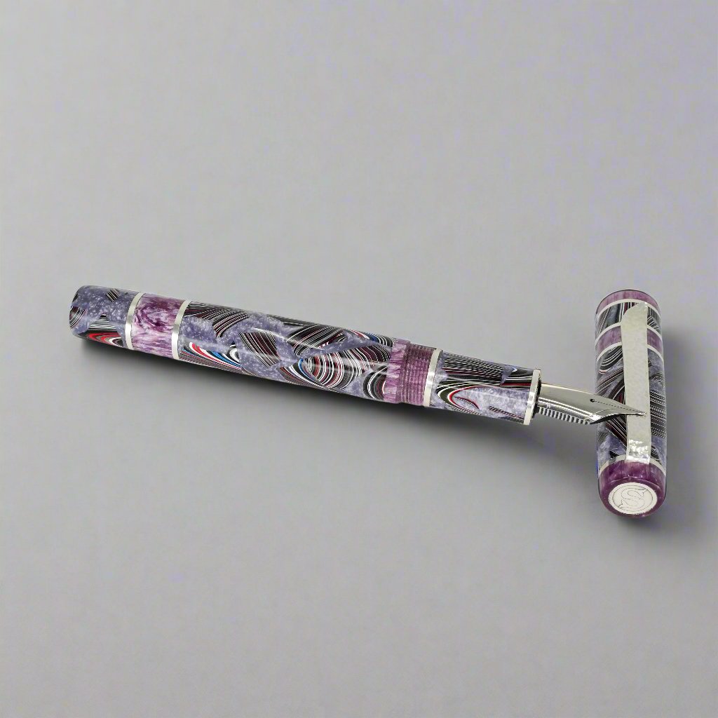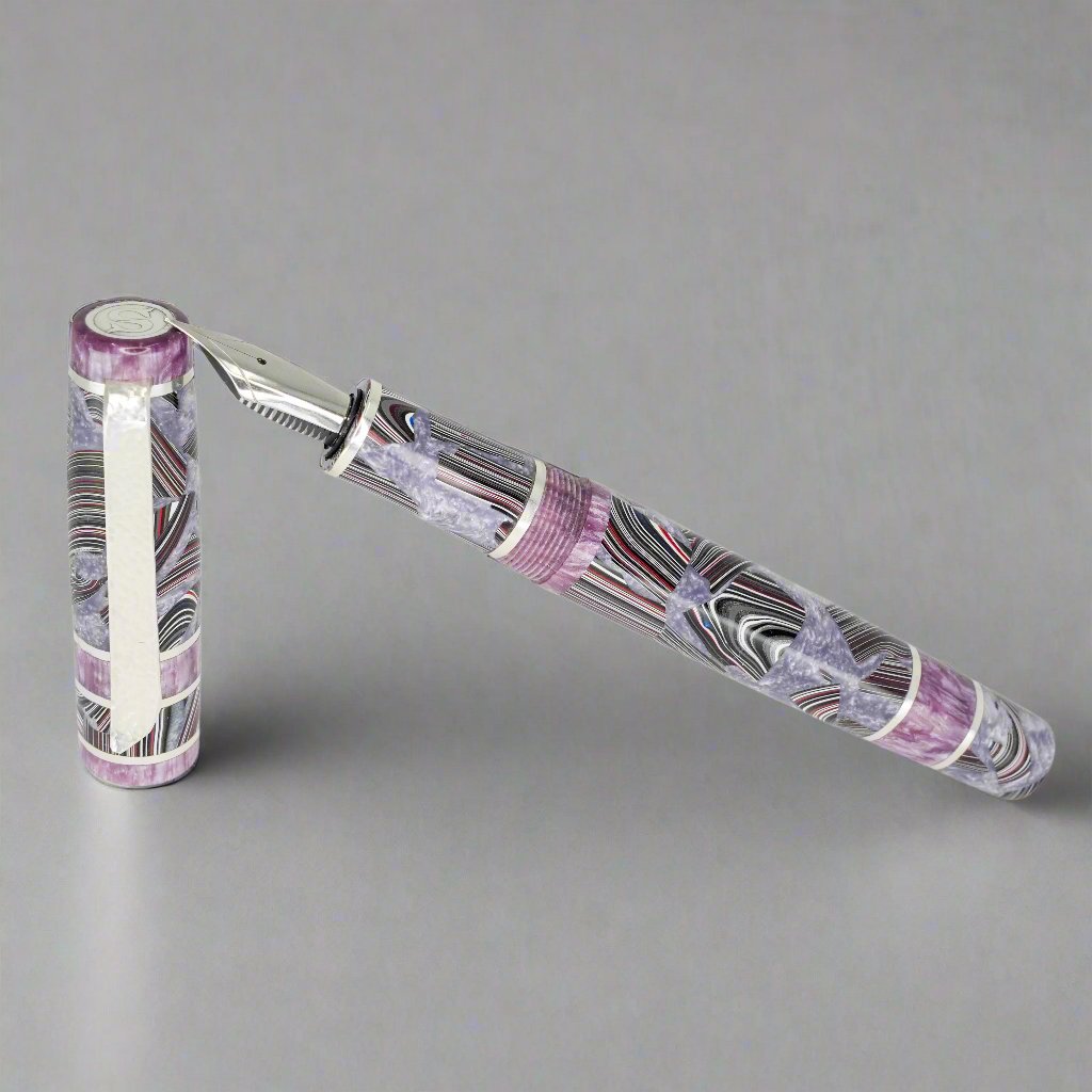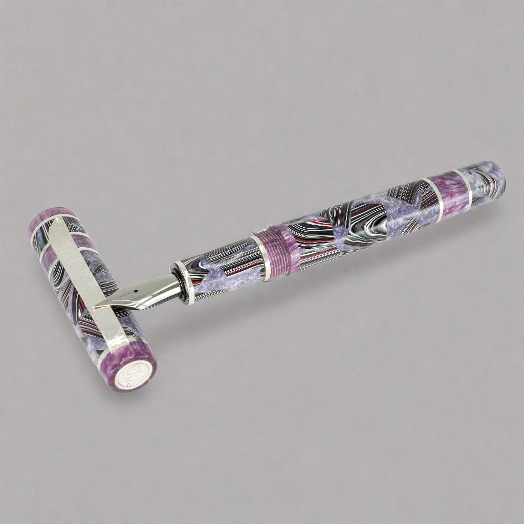This vintage Fordite is carefully handcrafted and preserved in resin, showcasing the stunning layers of automotive paint slag from decades ago. Made with .940 argentium silver and a size six Jowo nib, this pen is both durable and stylish. Indulge in the rich history and unique beauty of a byproduct that was once discarded, and add this remarkable piece to your collection. Choose your preferred nib size before checkout and enjoy the smooth ink filling system with a Schmidt K5 converter. Don't miss out on the opportunity to own a piece of automotive history.
