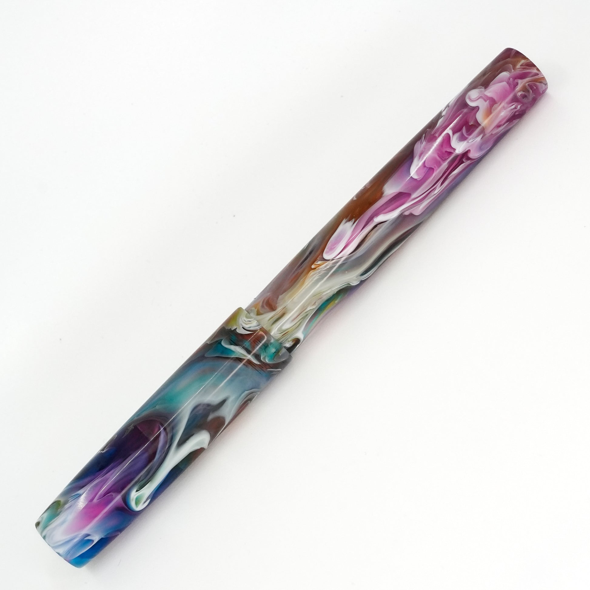 Introducing Alaskan Sunrise Stepless 14mm pen from Silver Burl Pens. This pen is part of the Simply Elegant series, designed for the discerning writer who values both comfort and style. With its sleek design, this pen is perfect for slipping into a pocket or bag, or for displaying on a desk. Each pen is meticulously crafted to the highest standard and comes with a size six Jowo nib and Schmidt K5 ink converter. The polished steel nib is available in various tip sizes, and alternative nibs can be requested by contacting john@silverburlpens.com.