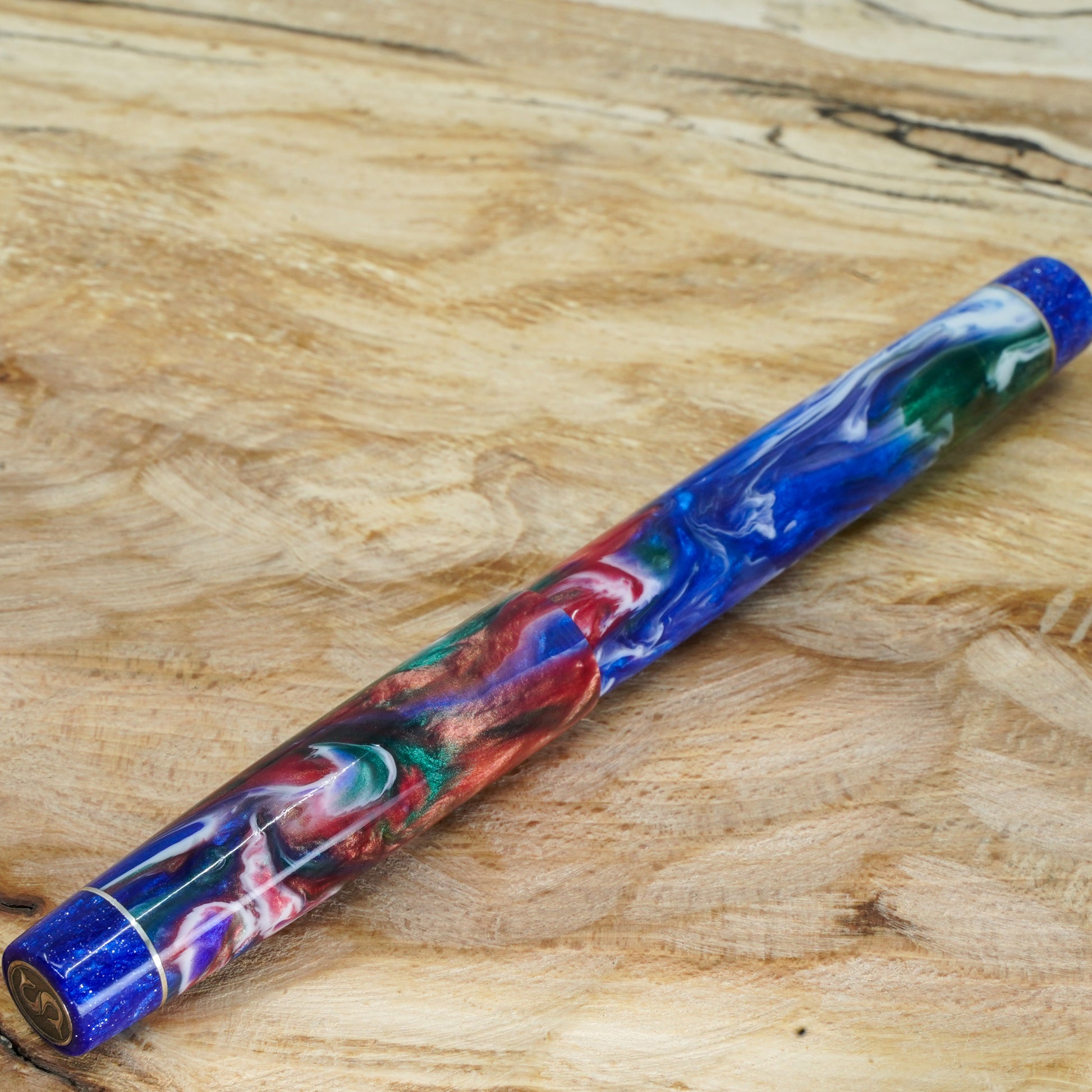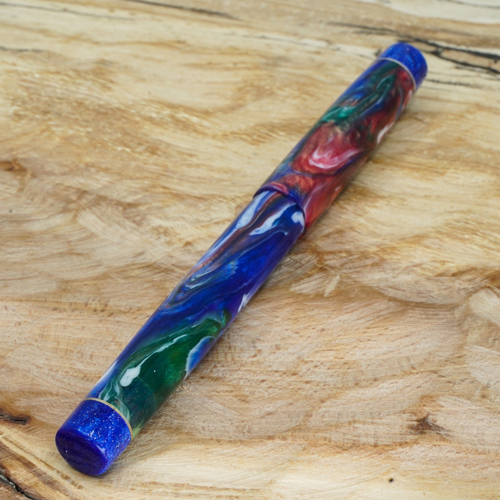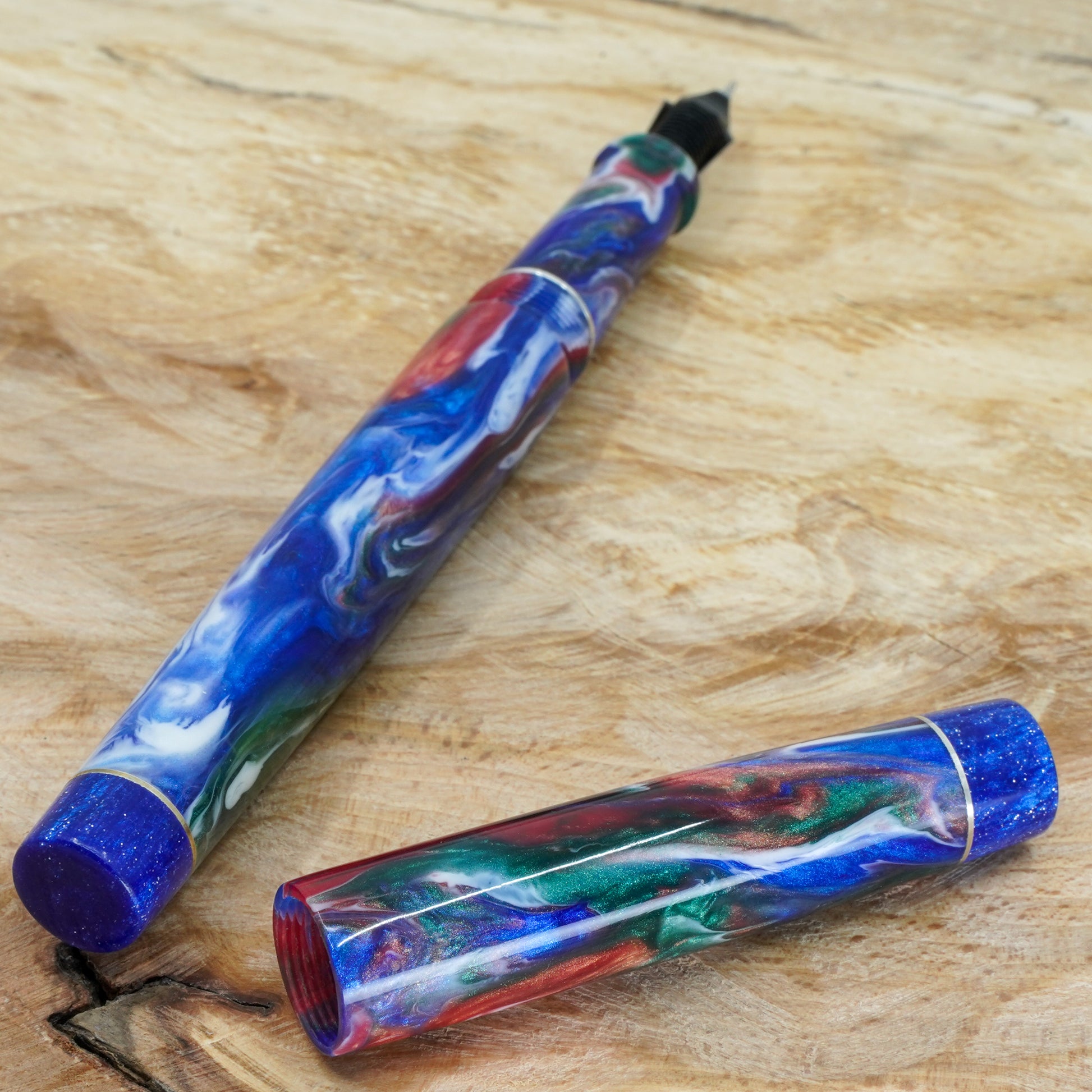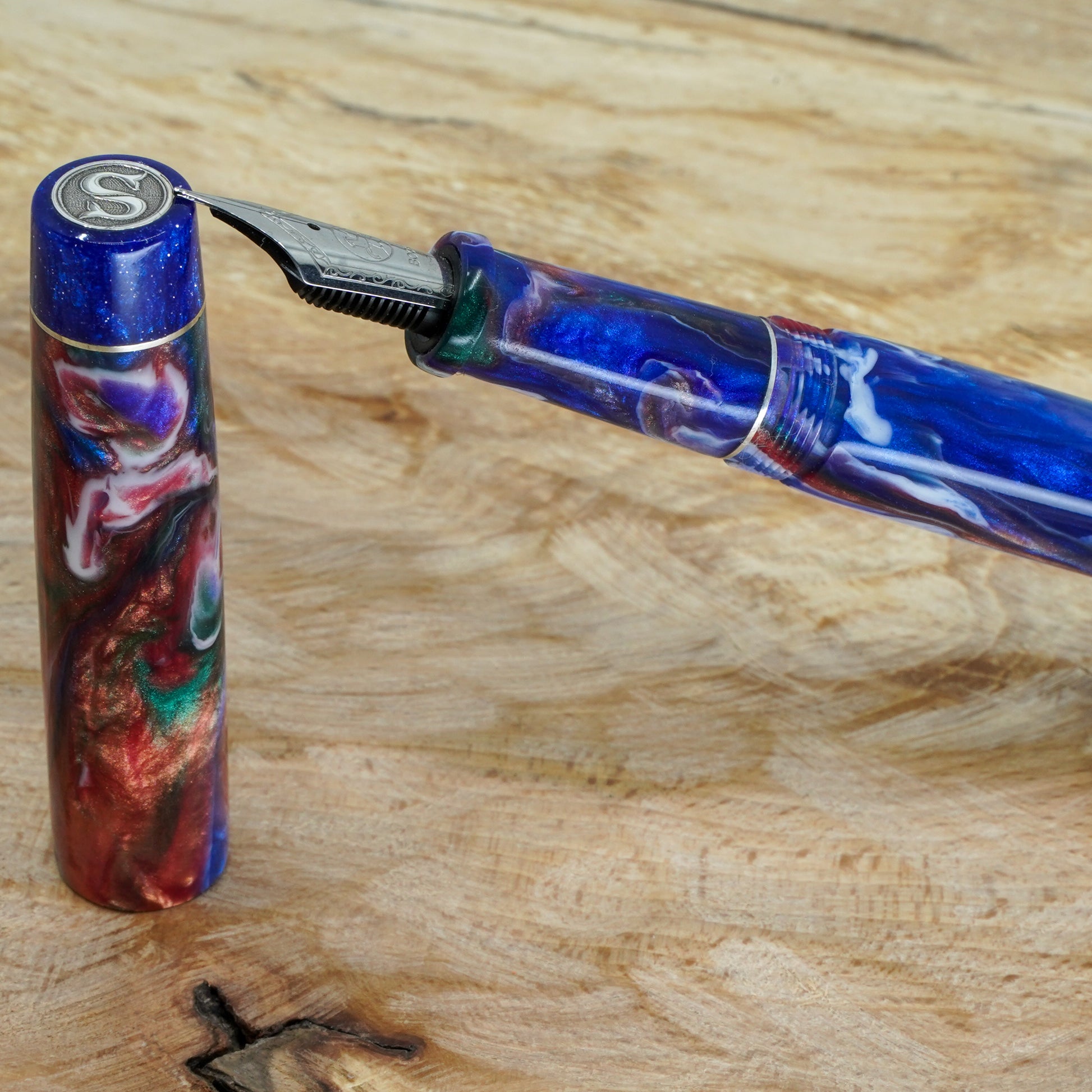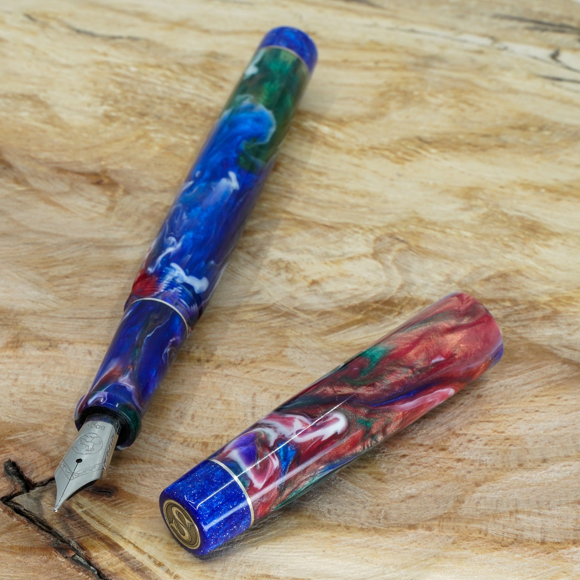 Sunset Waters with complimentary purple finials, fitted with a polished steel Bock nib size 6. PEN SIZE: Approximately is 145m/m long including cap. 135m/m nib to body end. Body diameter 15m/m with a 13m/m thread. Cap diameter 16m/m. Nib make Bock polished steel. The pen comes with any nib tip size and Schmidt K5 ink converter, Other nibs are available; please contact john@silverburlpens.com to discuss alternatives and prices. I`ll be pleased to offer advice. A totally hand crafted pen including all the silver work.